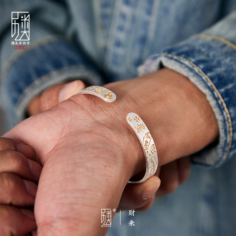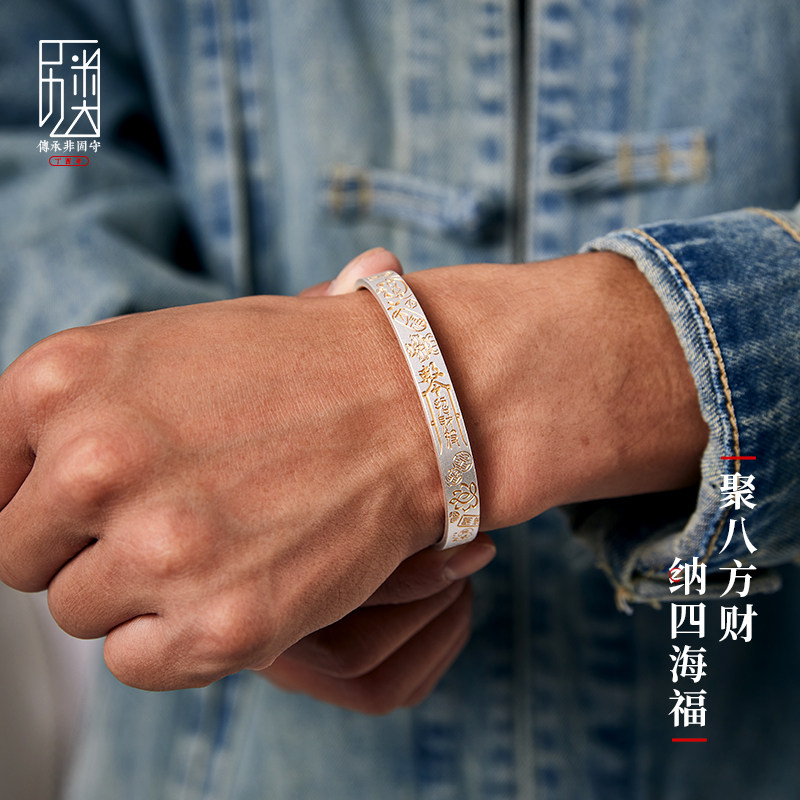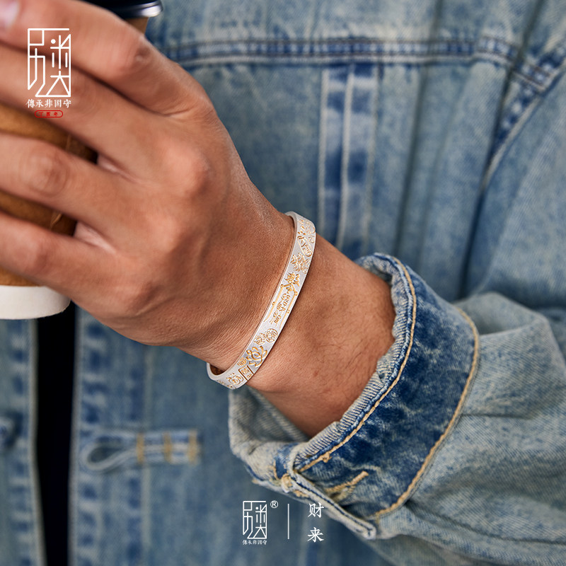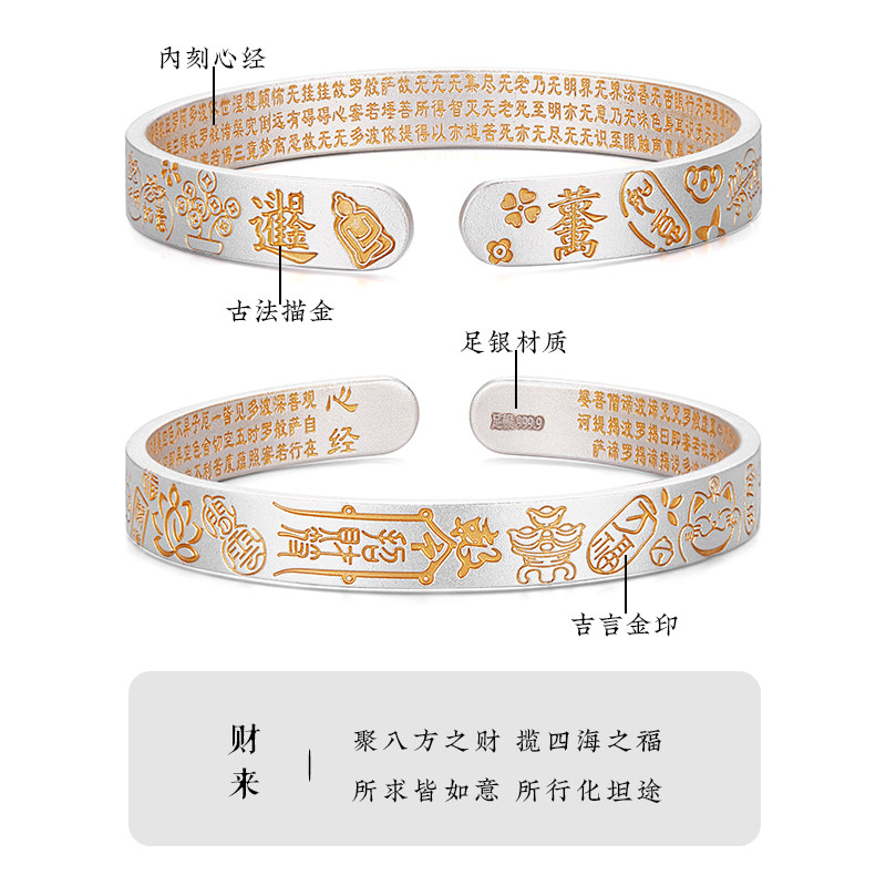 淘宝财来-999足银手镯纯银镯子描金时尚银饰品男女送人生日礼物首饰