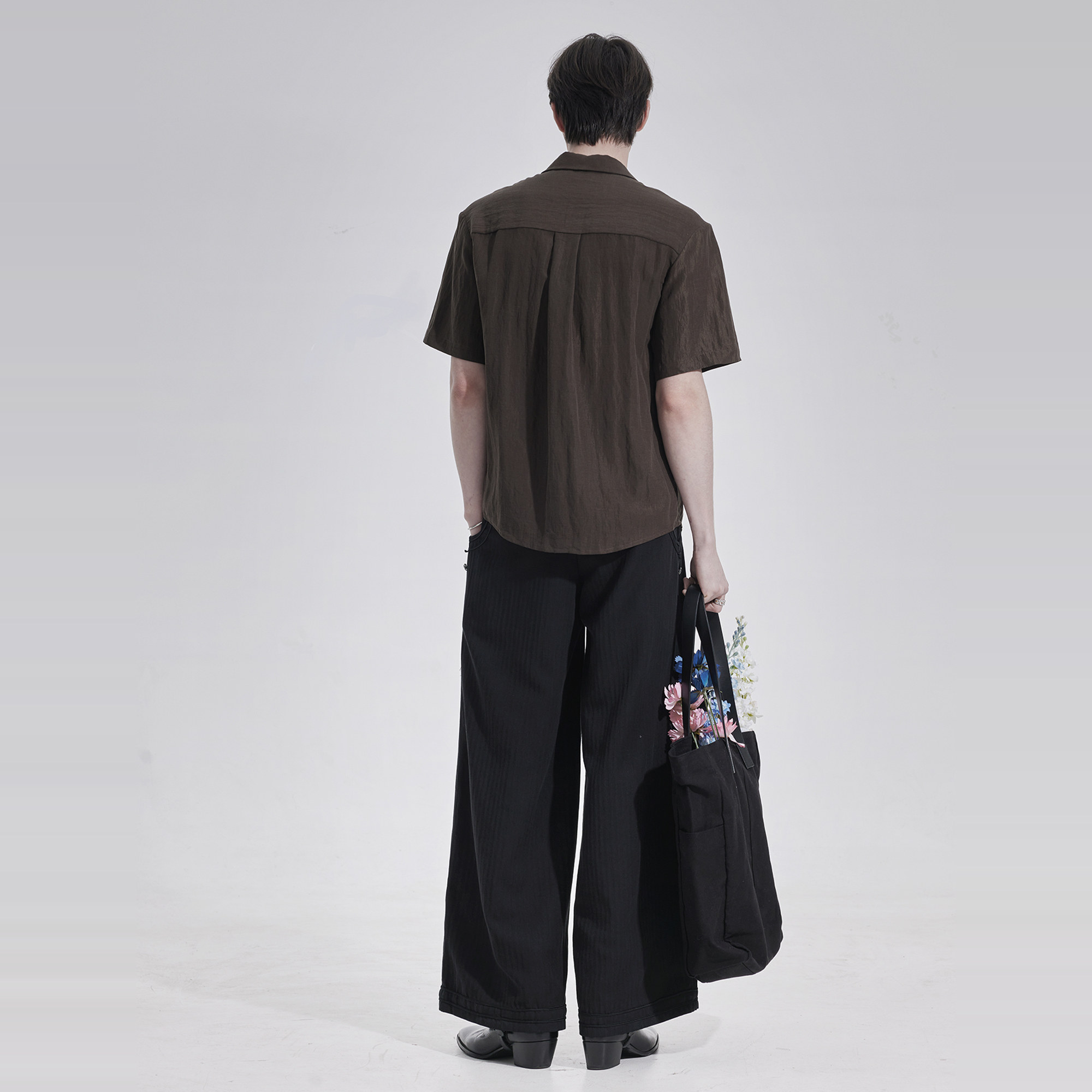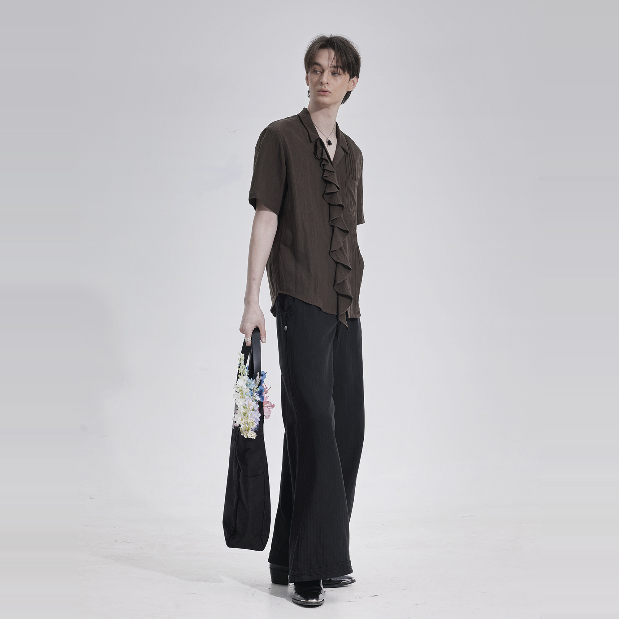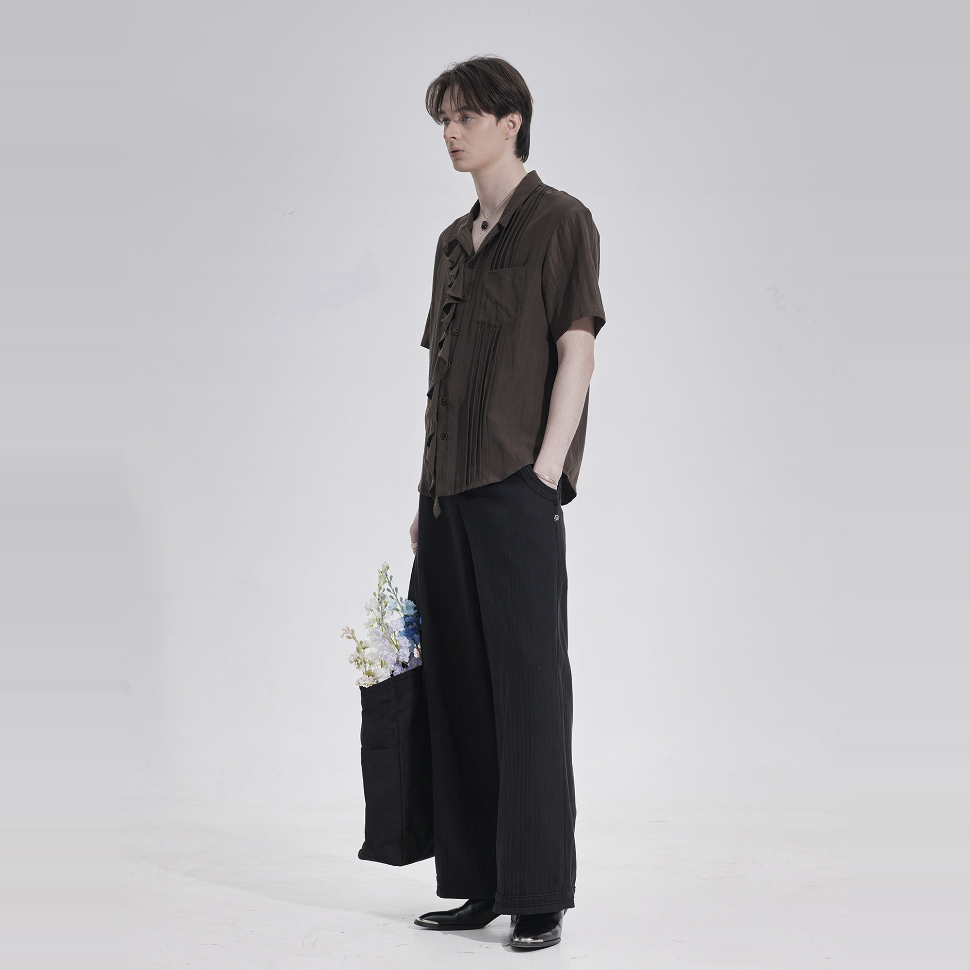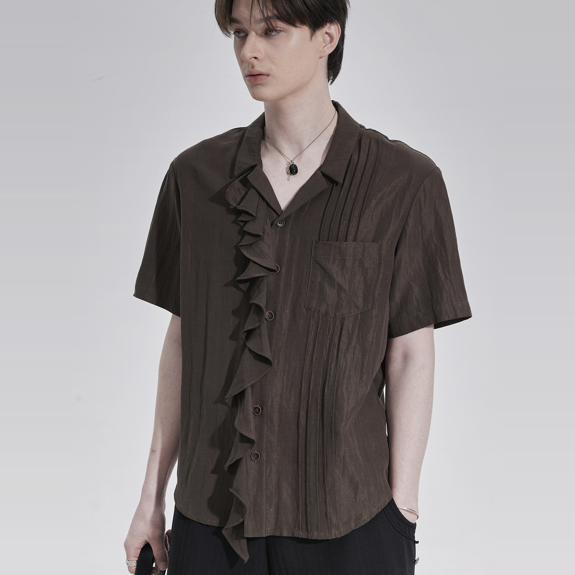 TAM TUAS【丝绸木】橡木棕天丝雨露亚麻风琴褶边短袖衬衫