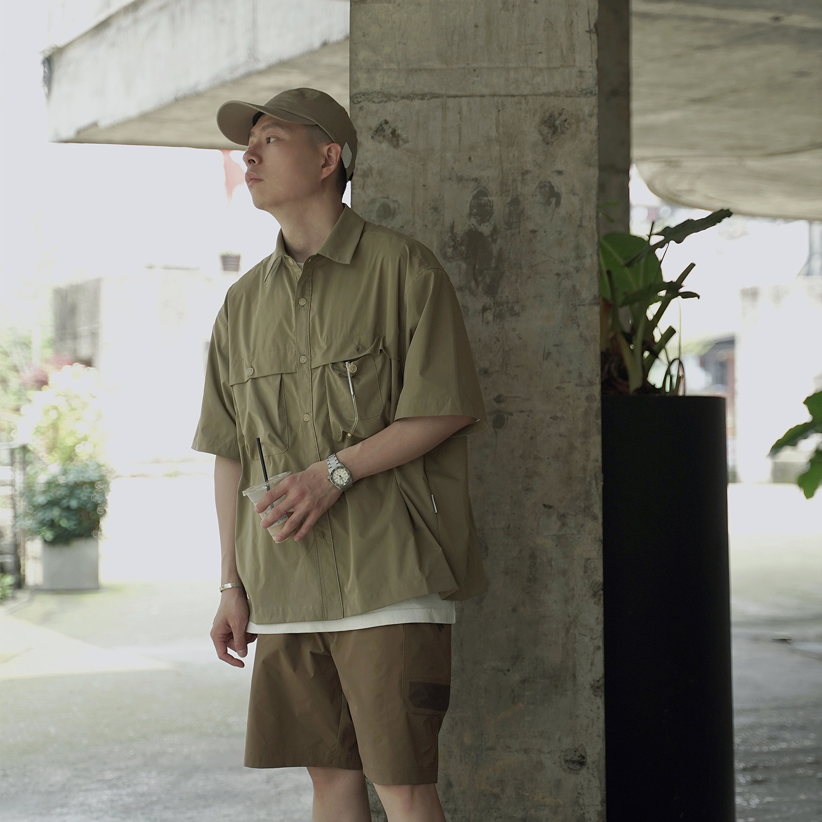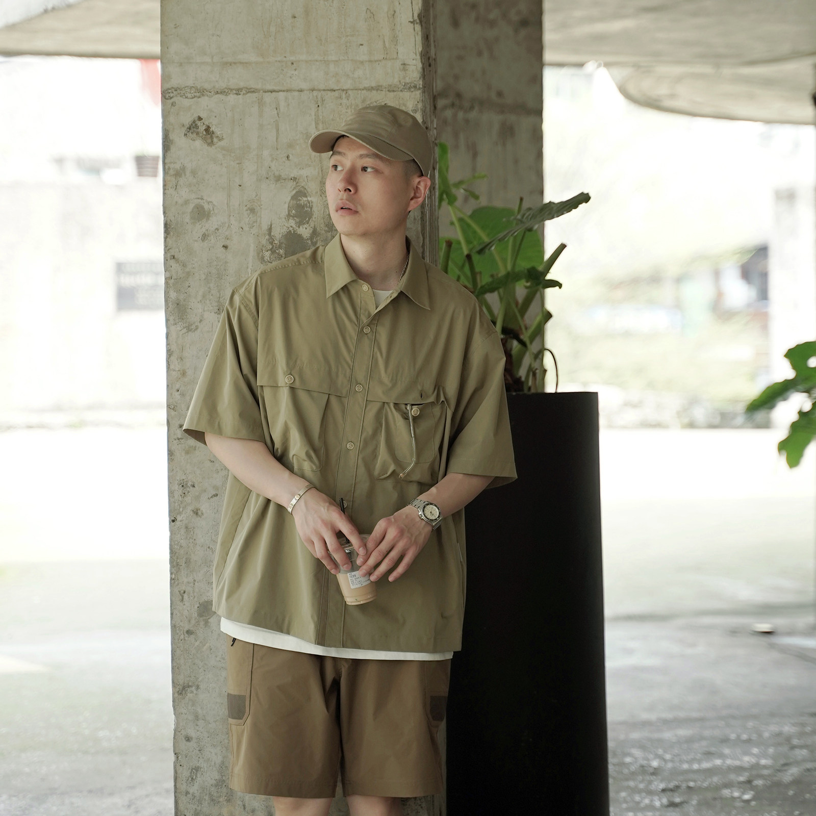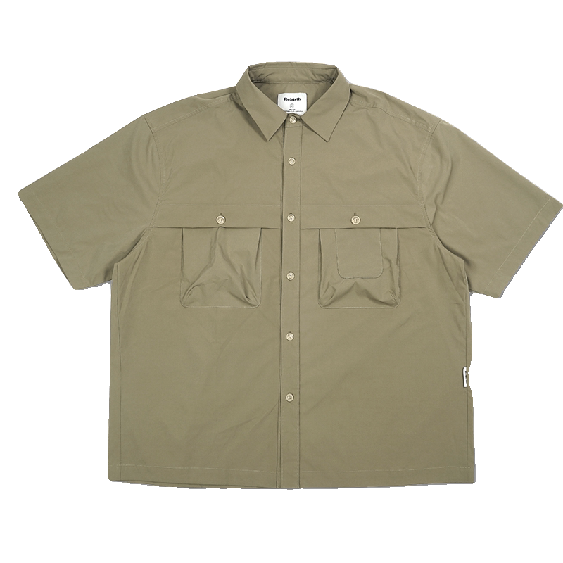 REBIRTH短袖衬衫双口袋简约百搭户外宽松日系ins纯色落肩短袖衬衫
