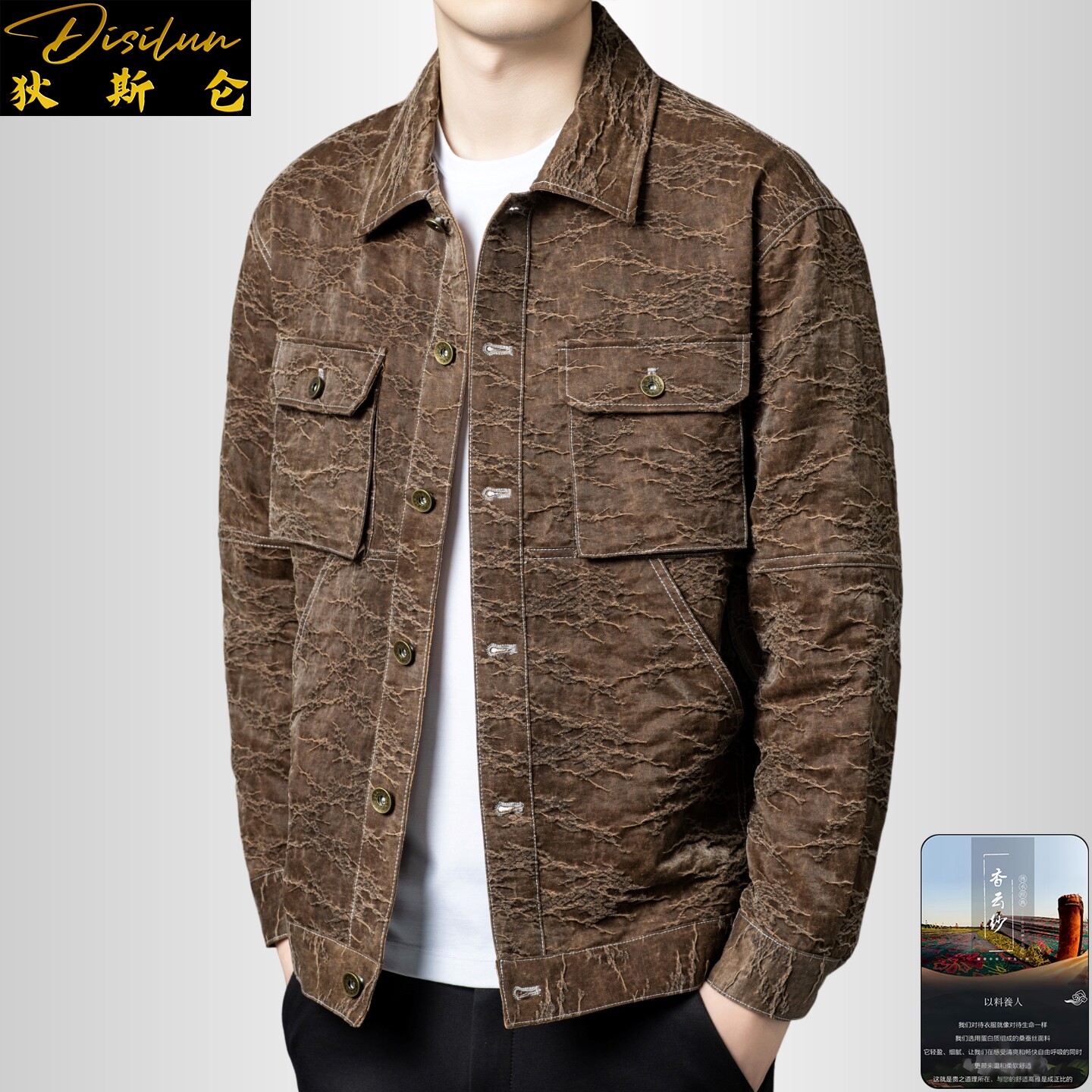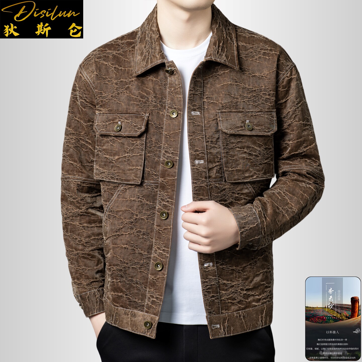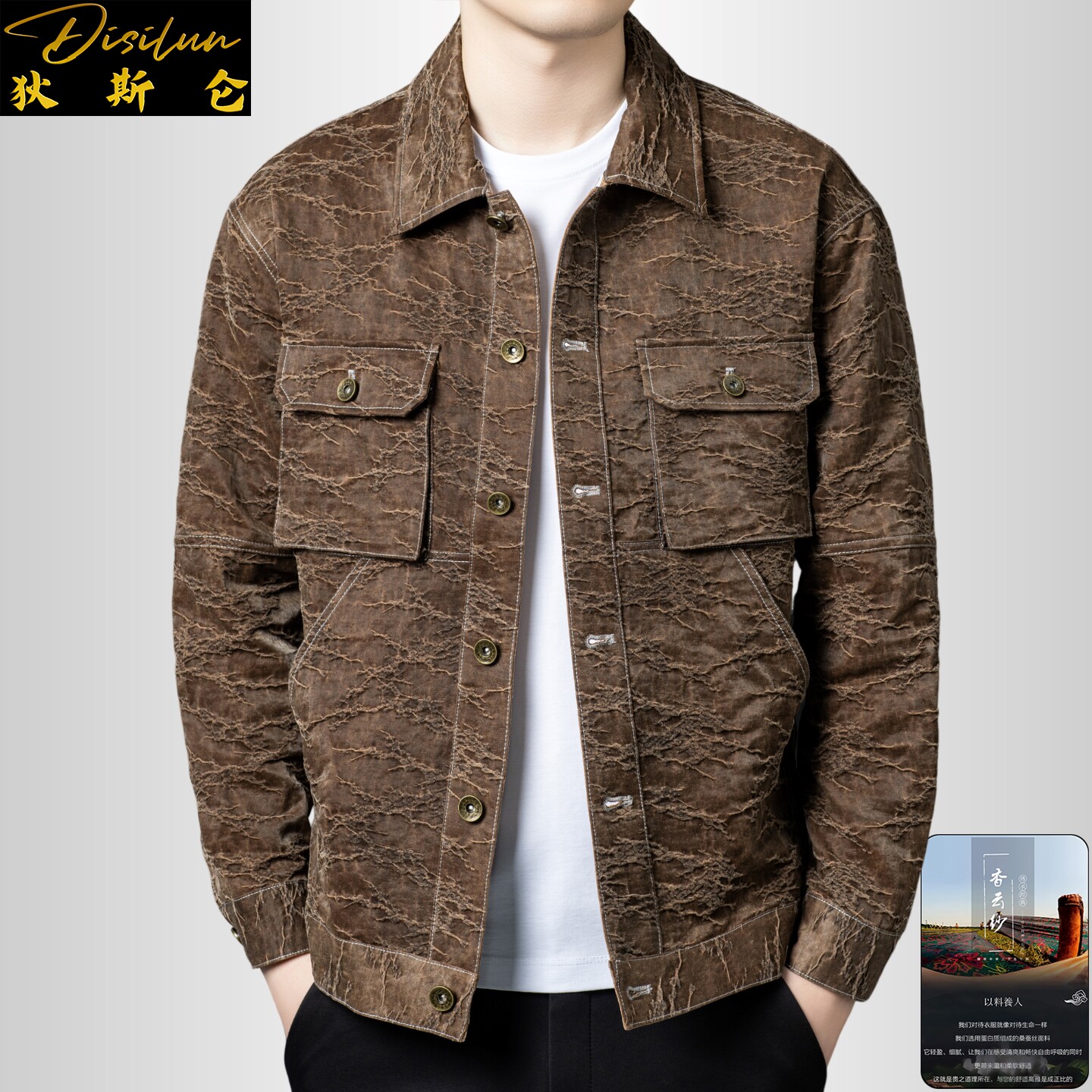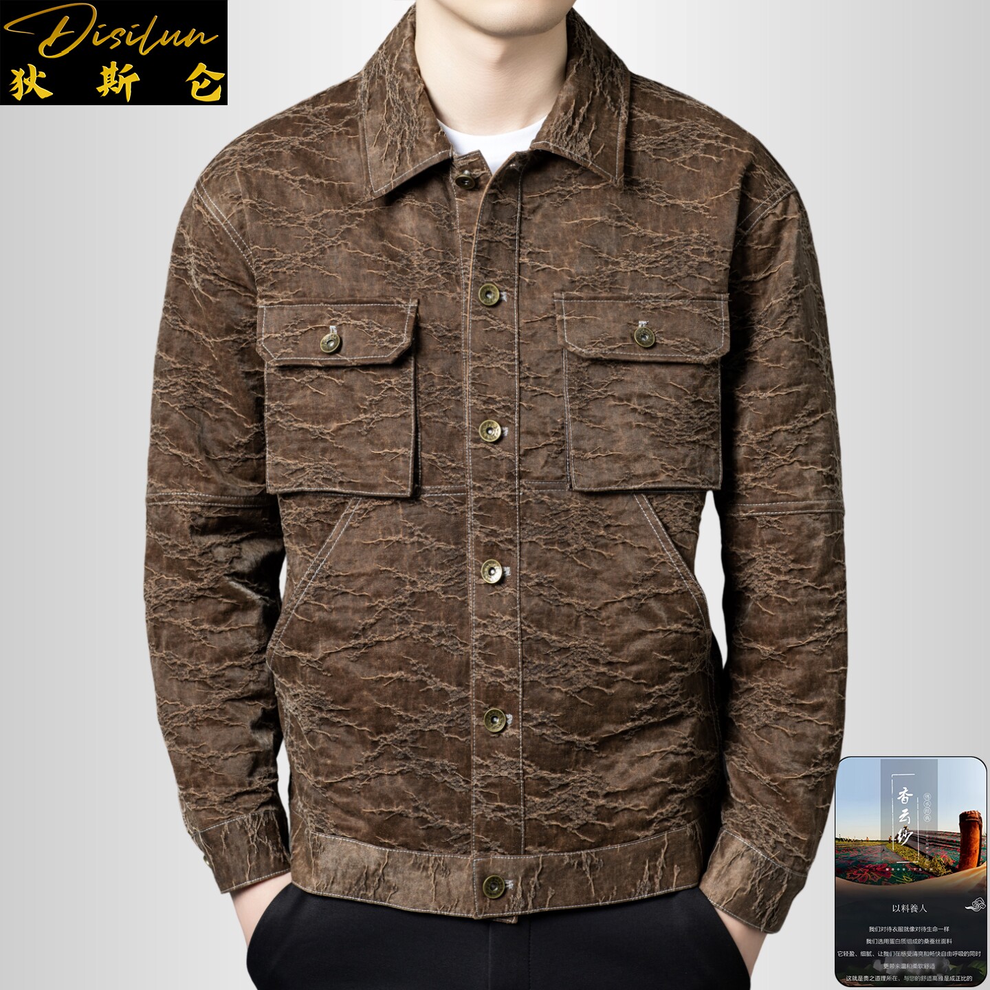--------------------- 狄斯仑轻奢桑蚕丝外套男士裂纹工装翻领夹克帅气多口袋国潮风上衣 【原售价】1990元 【现售价】1791元 【推荐理由】