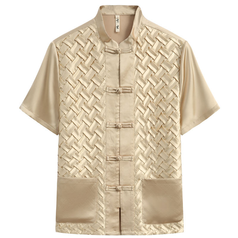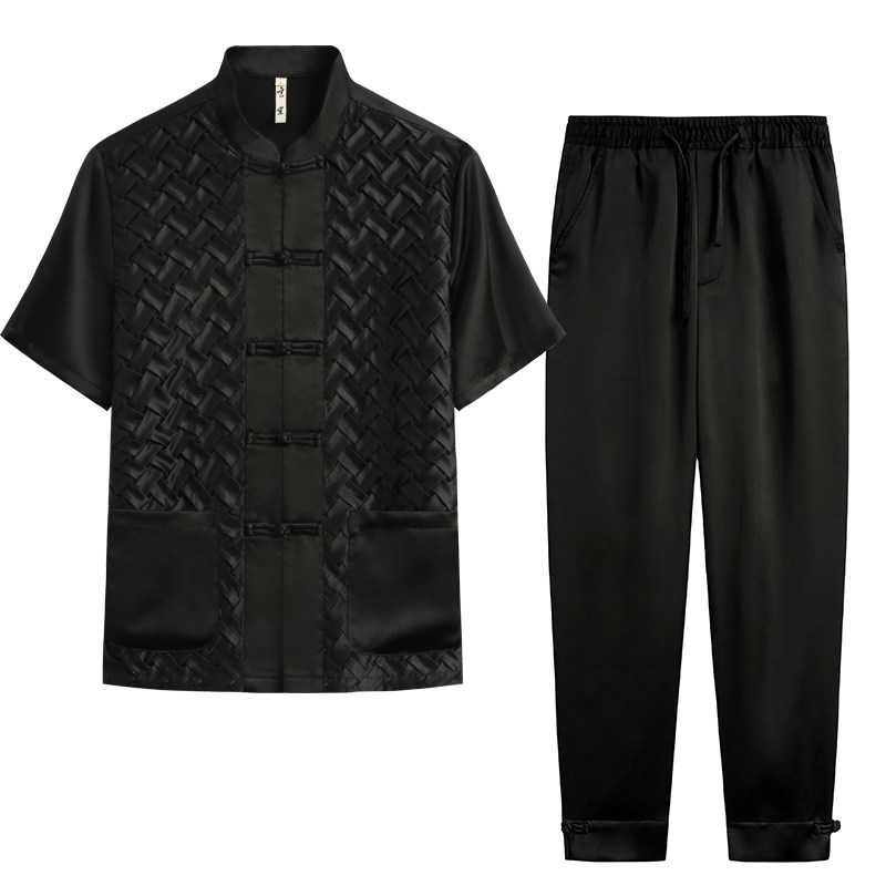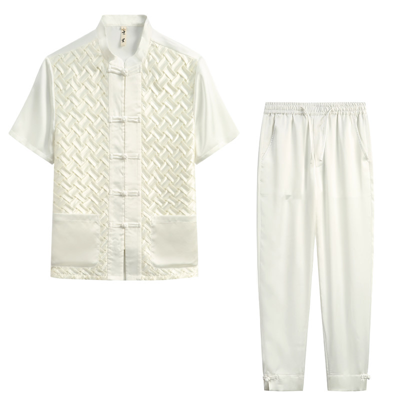 --------------------- 夏季唐装套装男铜氨丝短袖中式国潮立领中式复古国潮手工盘扣外套 【原售价】528元 【现售价】385元 【推荐理由】