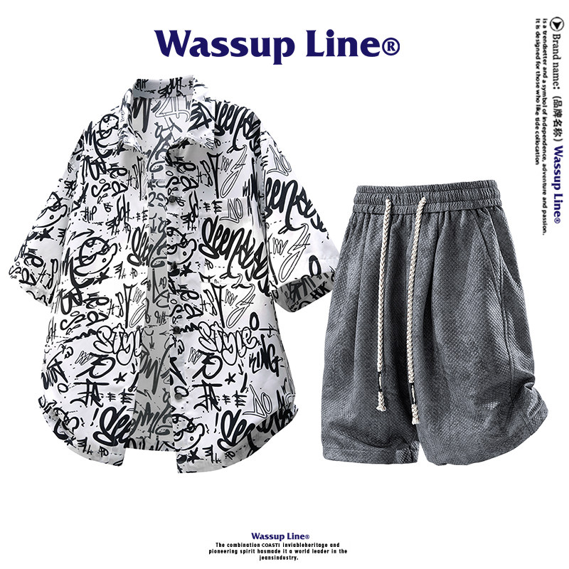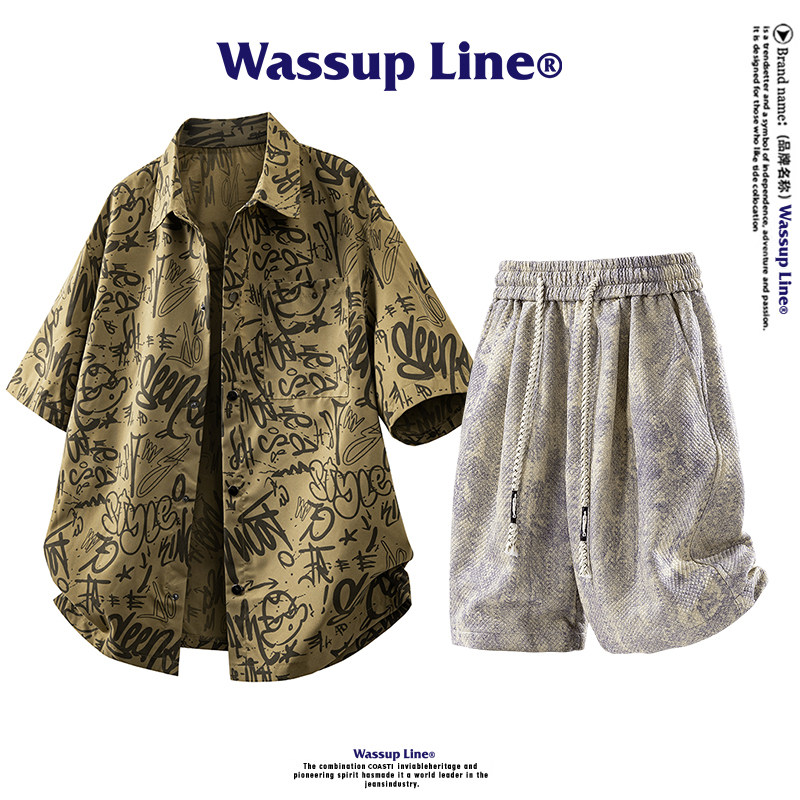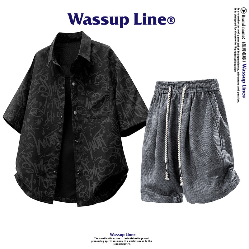 WASSUP Line潮牌夏季套装男短袖衬衣男士休闲短裤宽松运动两件套