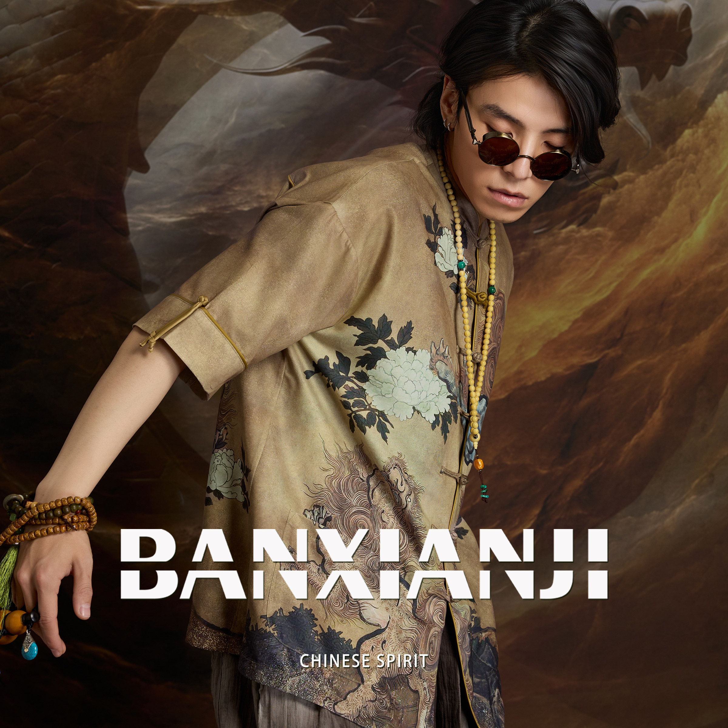 半闲集<金狮清狮> 印花短袖男士新中式唐装中国风国潮复古外套