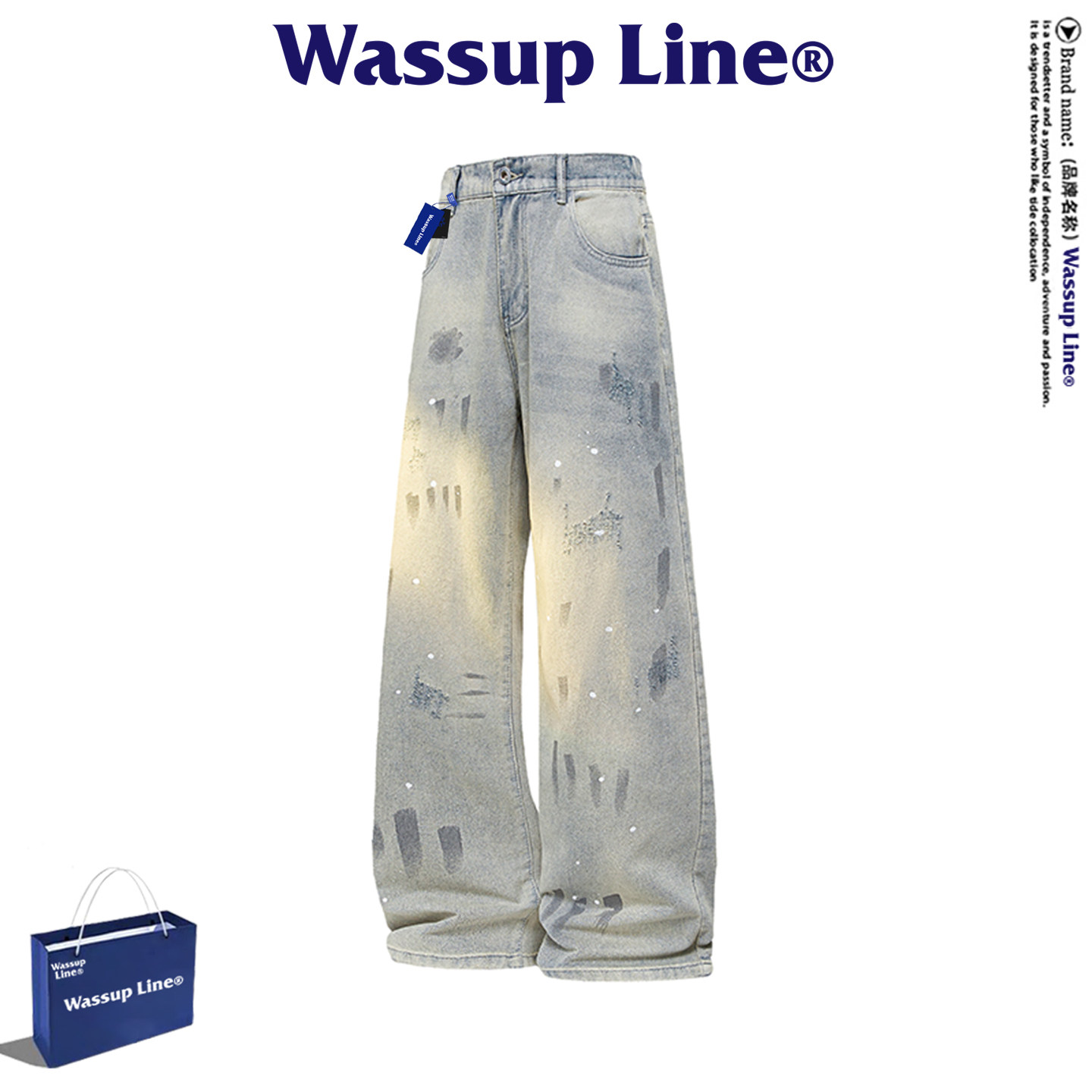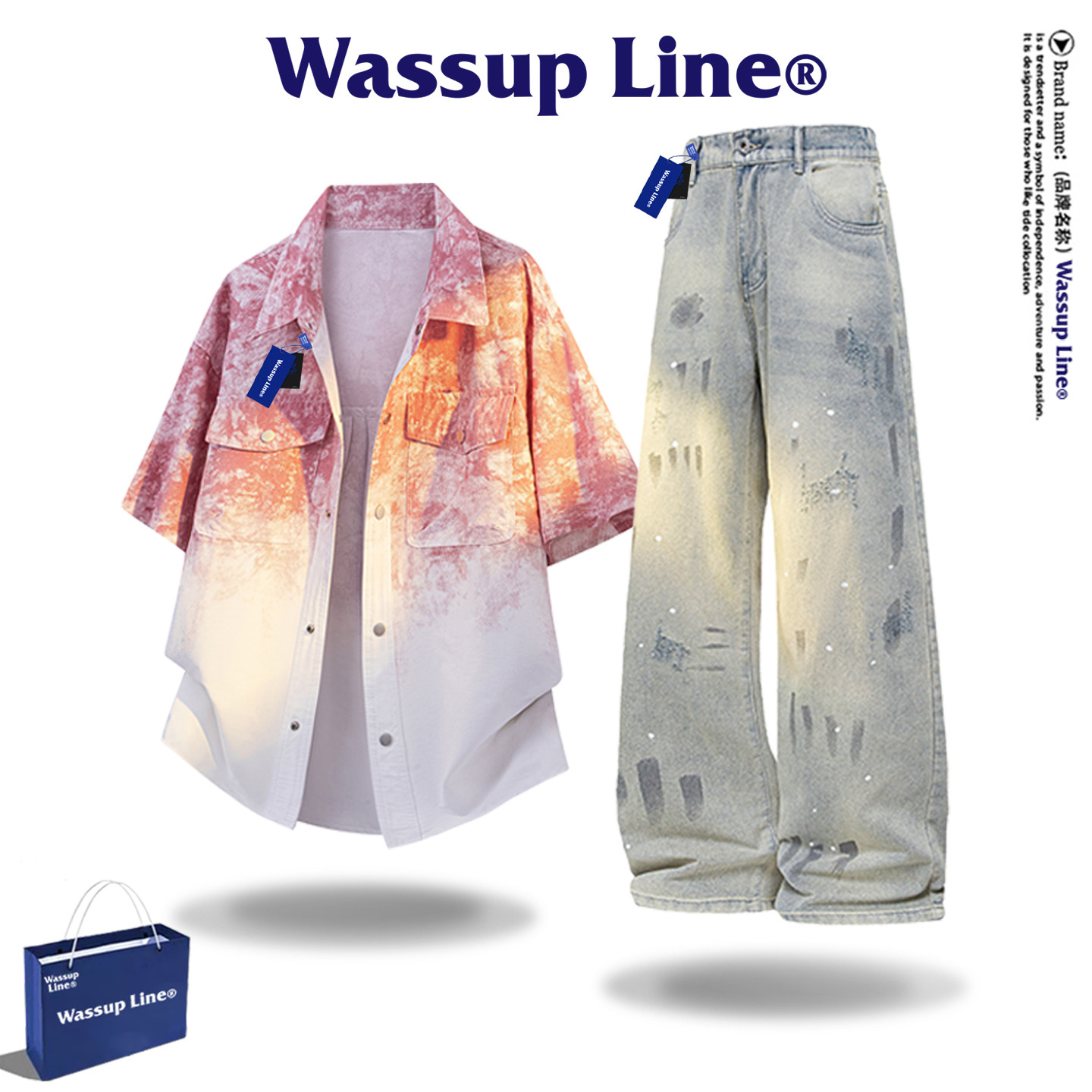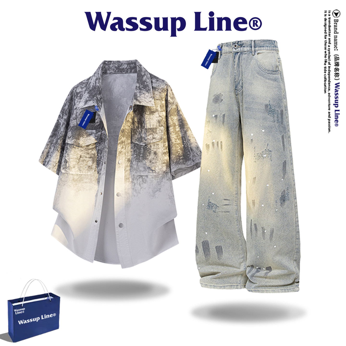 WASSUP Line潮牌休闲百搭套装男夏季时尚短袖衬衫牛仔长裤两件套