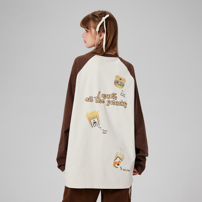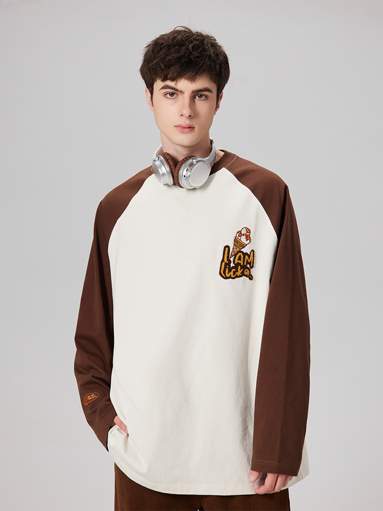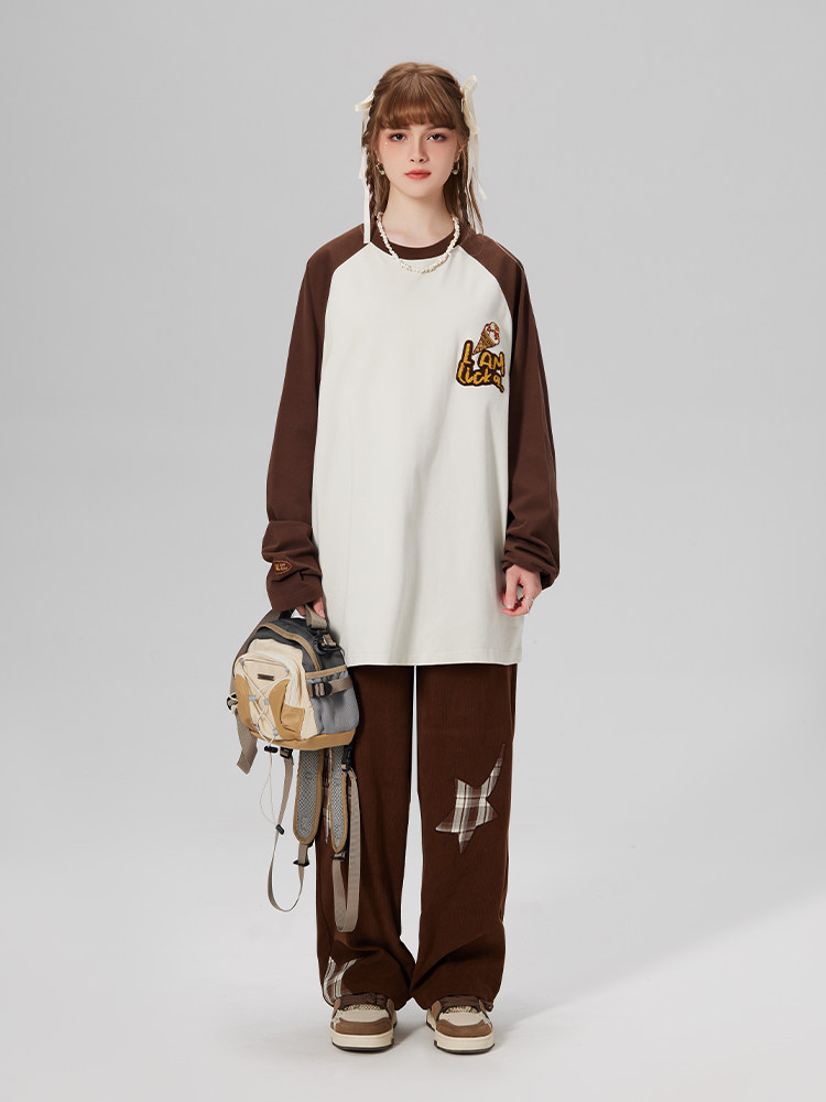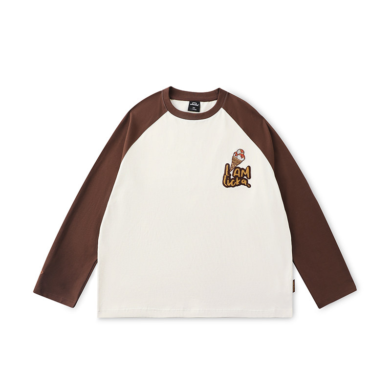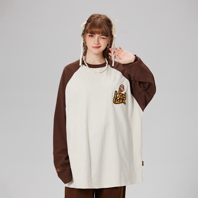 LAMLICKA24新款插肩袖长袖T恤女国潮印花毛巾绣薄款宽松圆领上衣