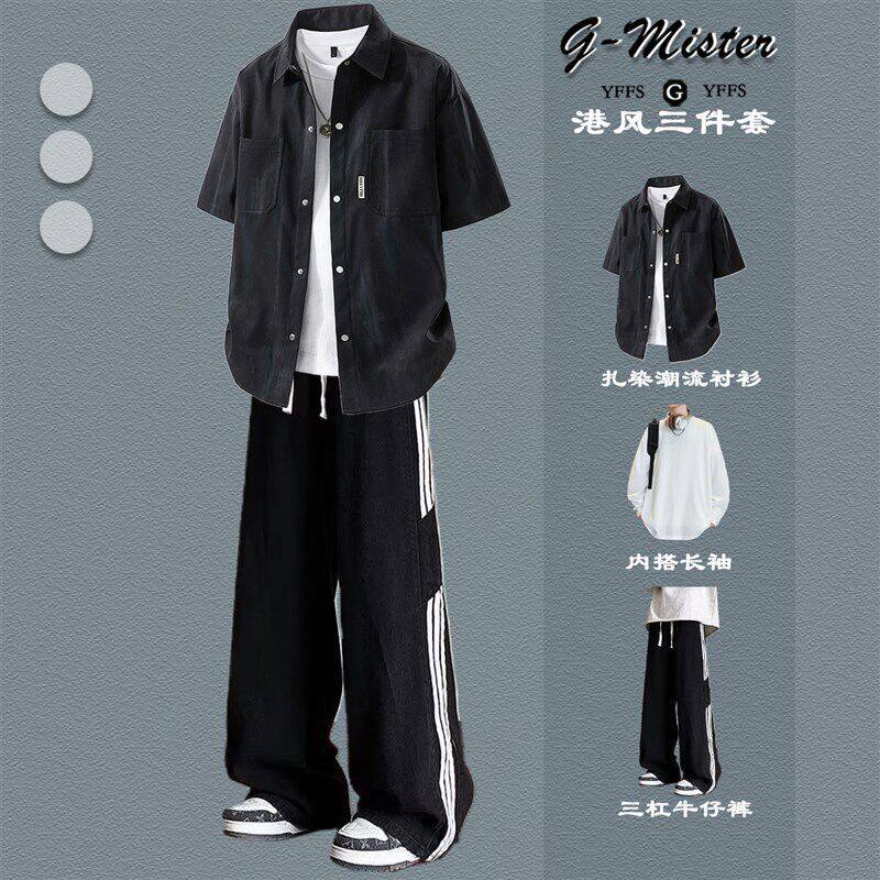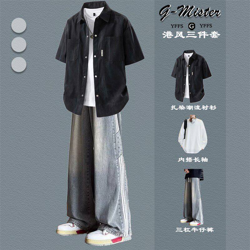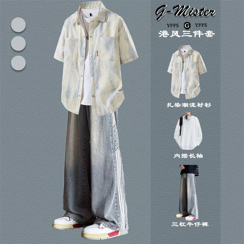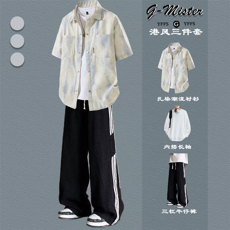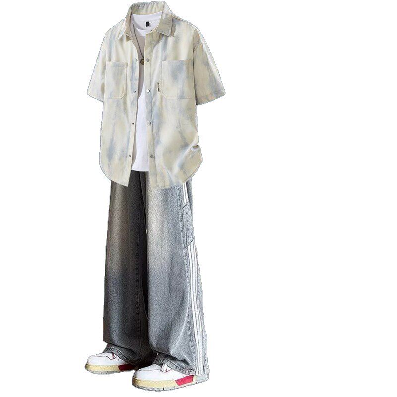 BENTIDEA 扎染短袖衬衫男学生休闲套t装2026新款夏季美式潮牌衬衣