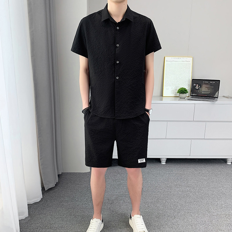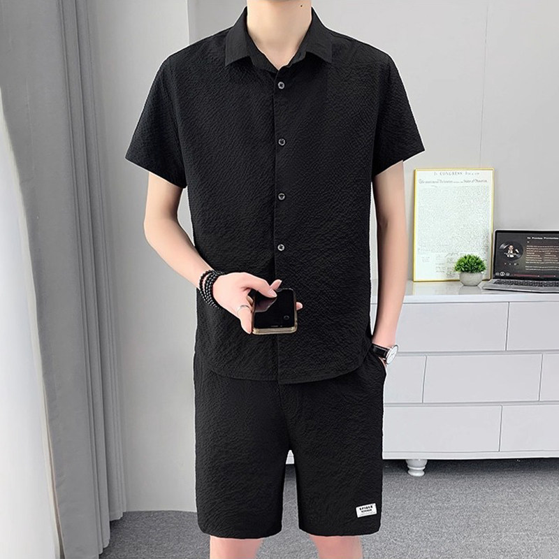 潮牌衬衫套装男夏季薄款2025新款潮流冰丝宽松休闲时尚高端两件套
