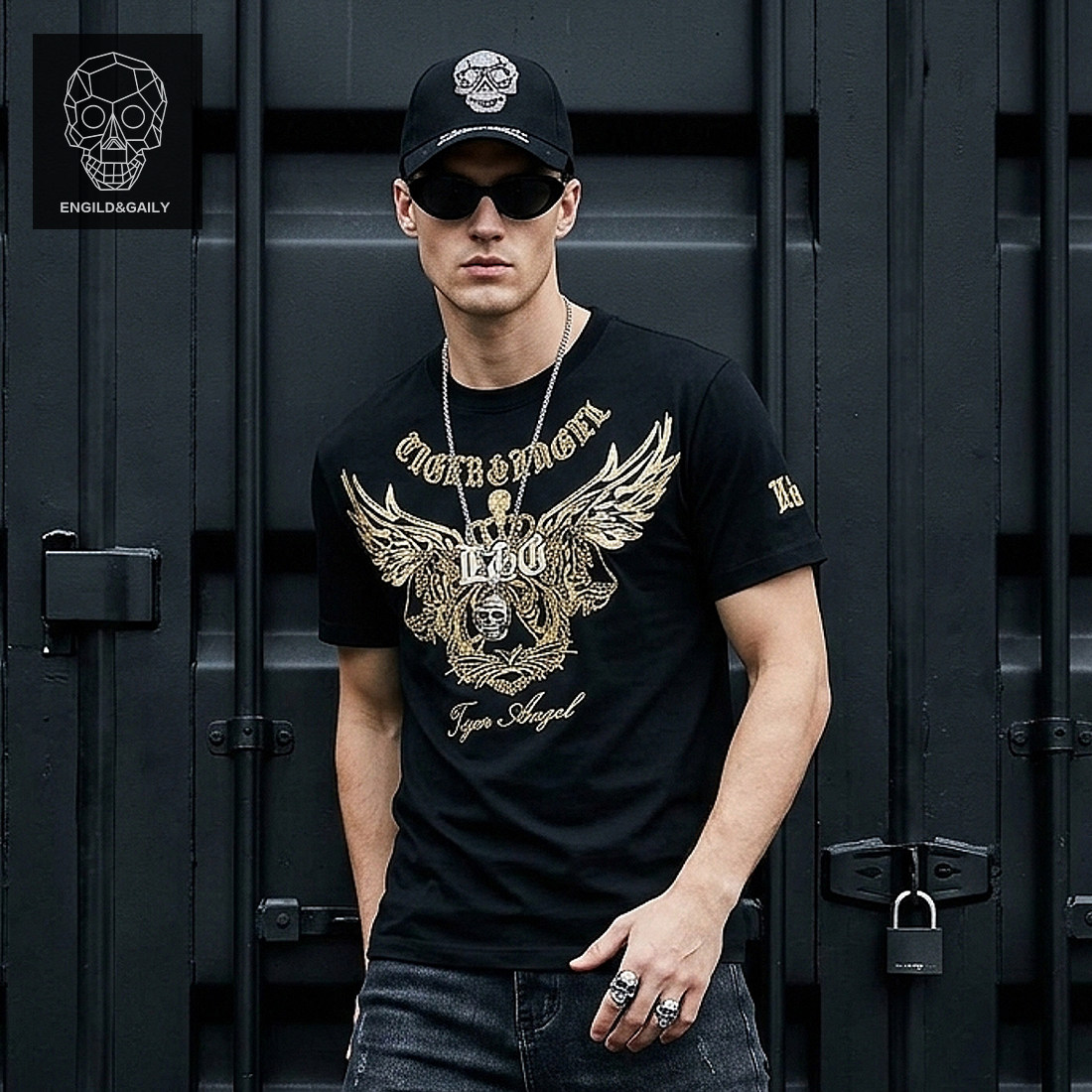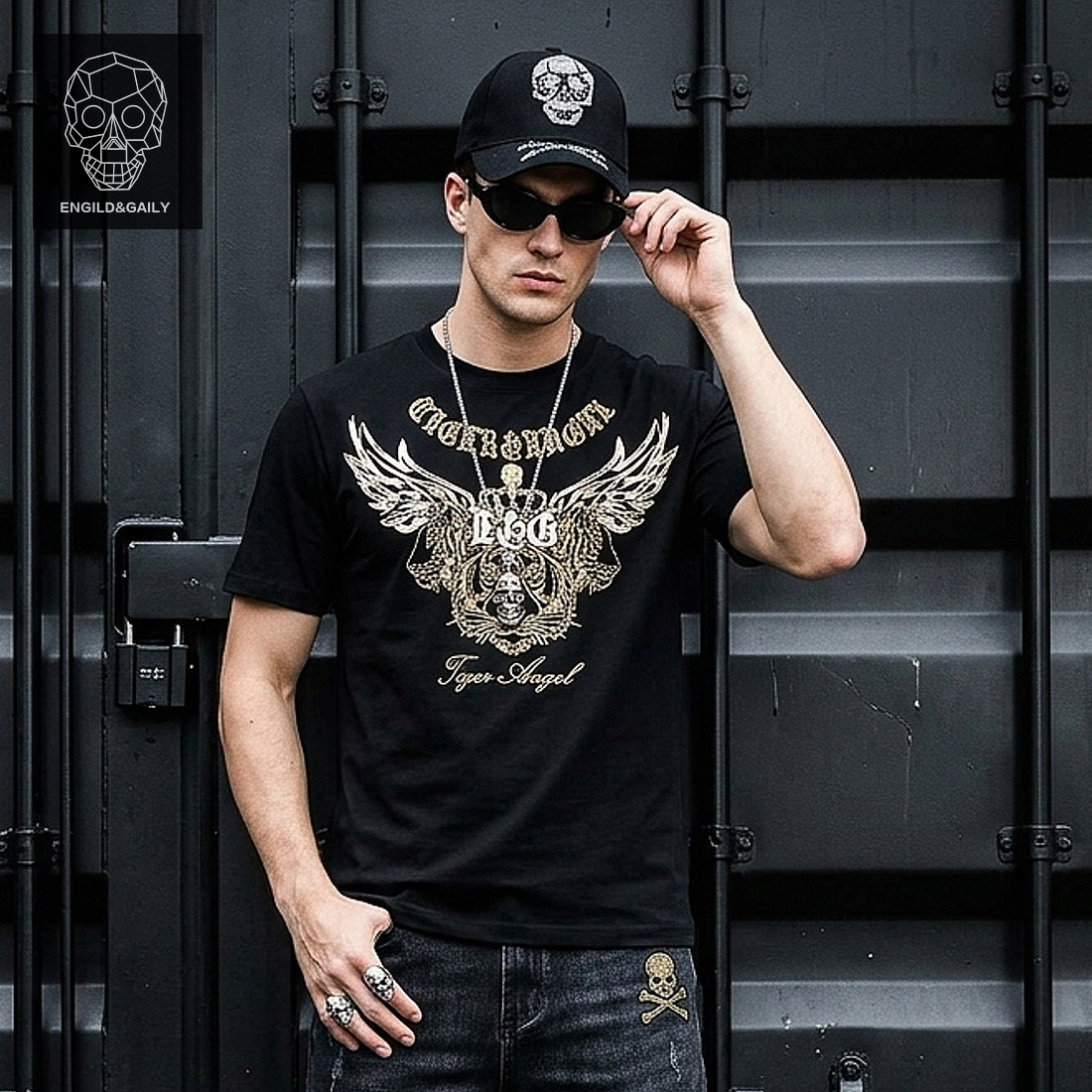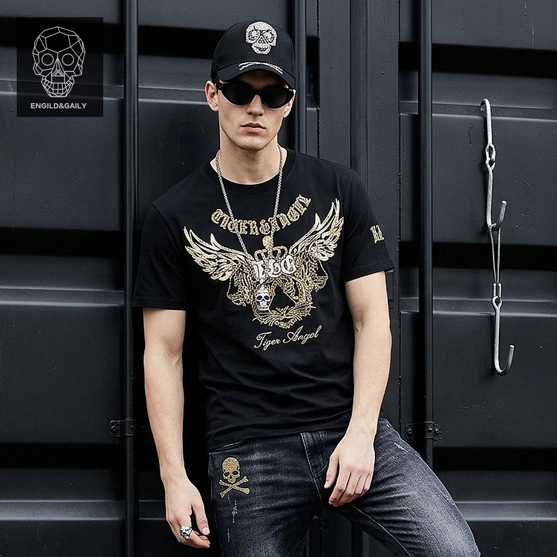淘宝ENGILD&GAILY黑色短袖T恤男烫钻翅膀骷髅头印花潮酷圆领休闲上衣
