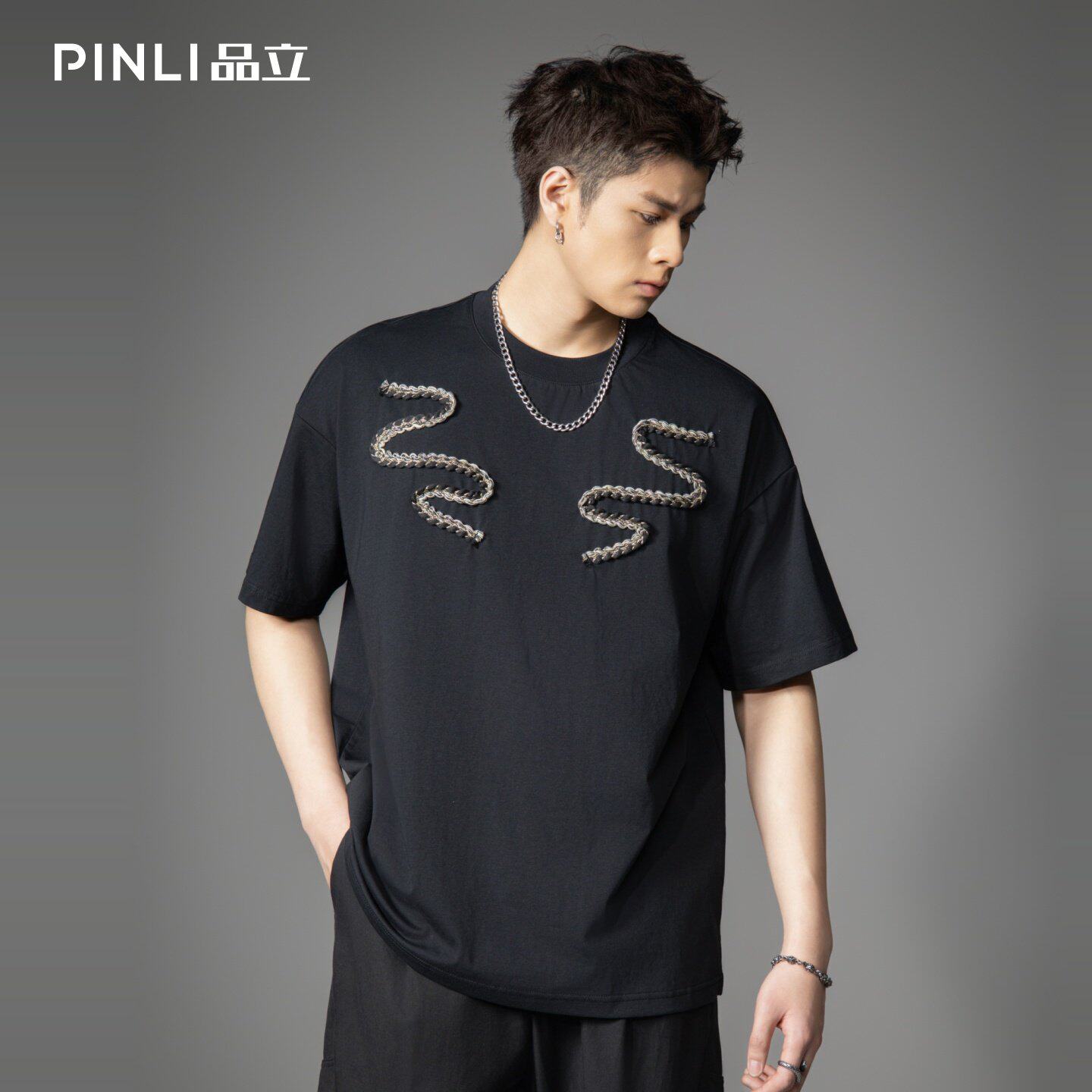 PINLI品立2026春季新款男士潮牌宽松圆领贴车织带休闲短袖T恤上衣
