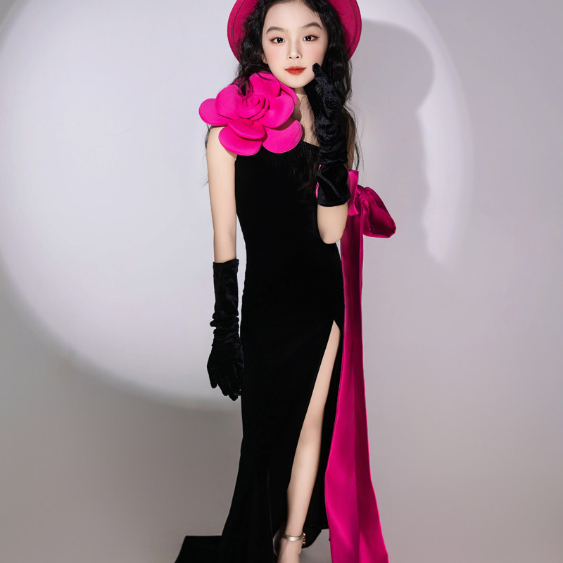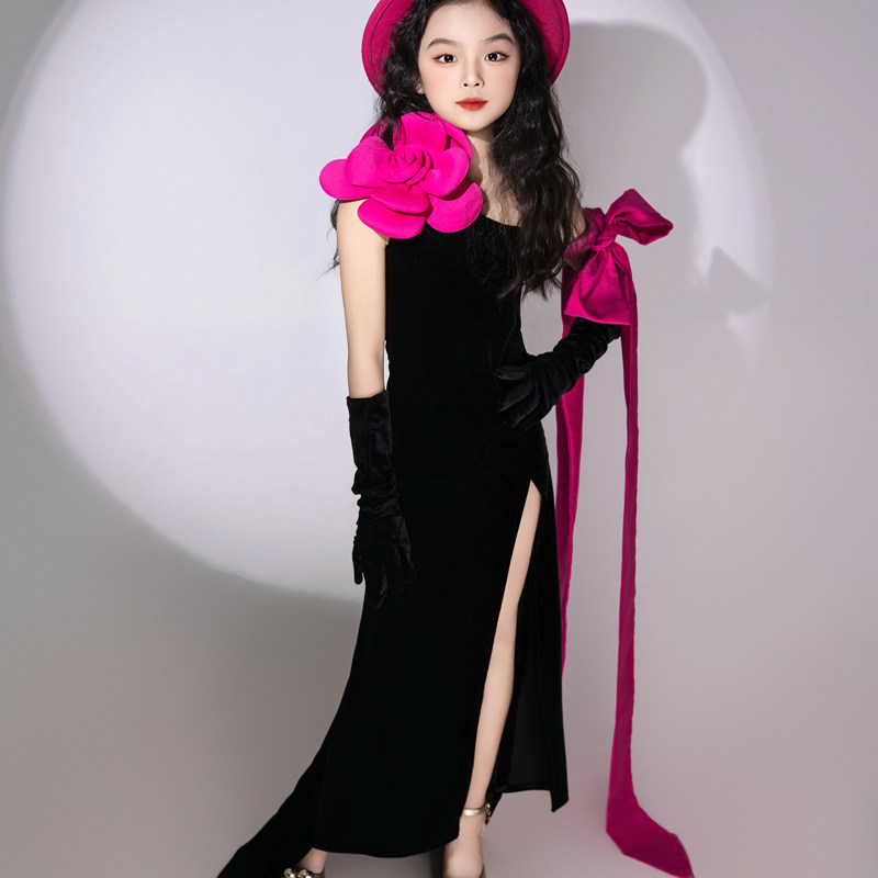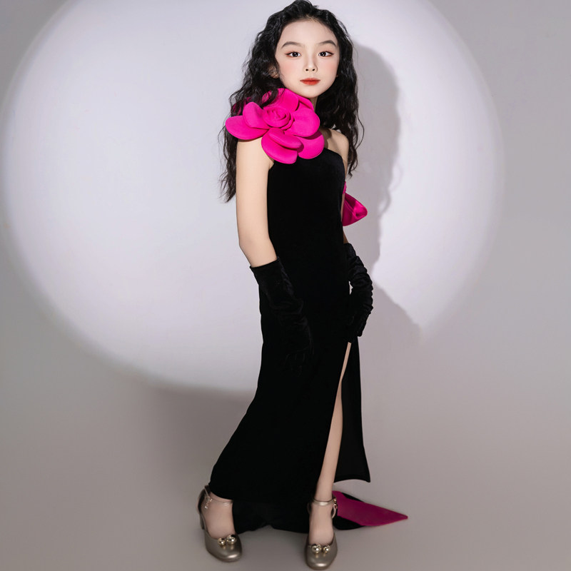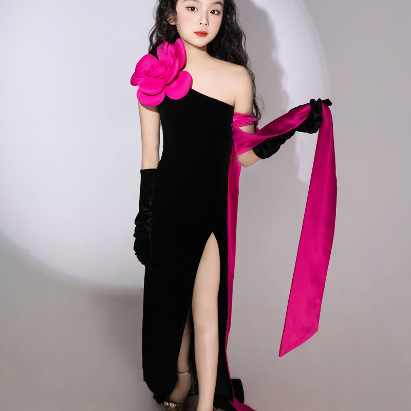 儿童多巴胺T台走秀礼服斜肩PK表演模特演出服法式浪漫拖尾长裙