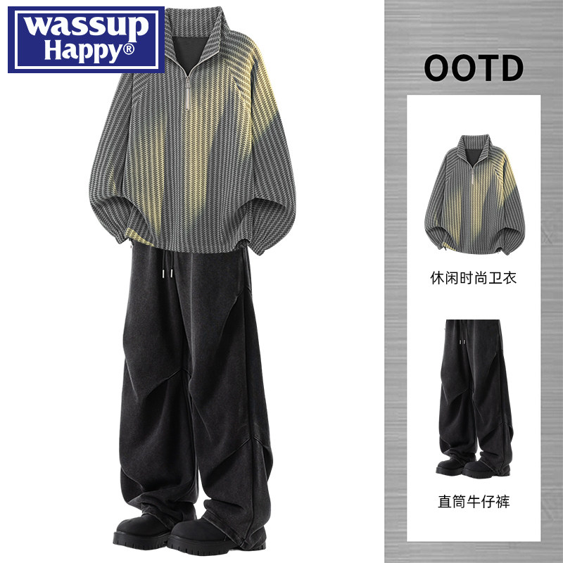 wassup happy美式半拉链立领卫衣男春秋季新款帅气休闲裤搭配一套