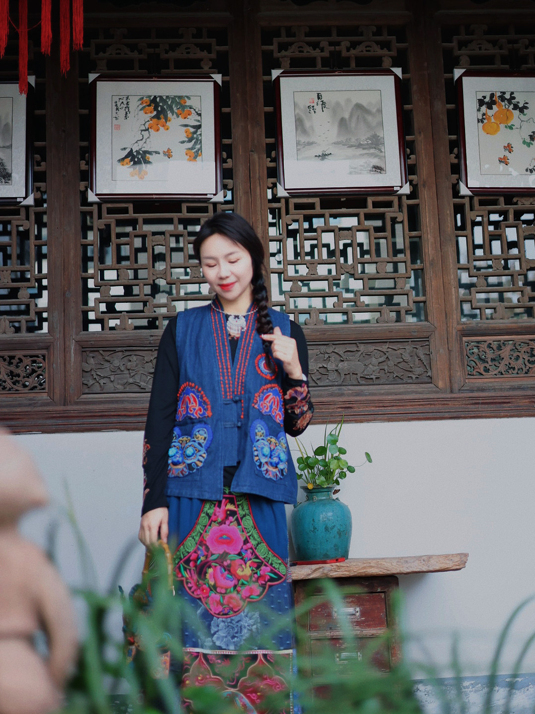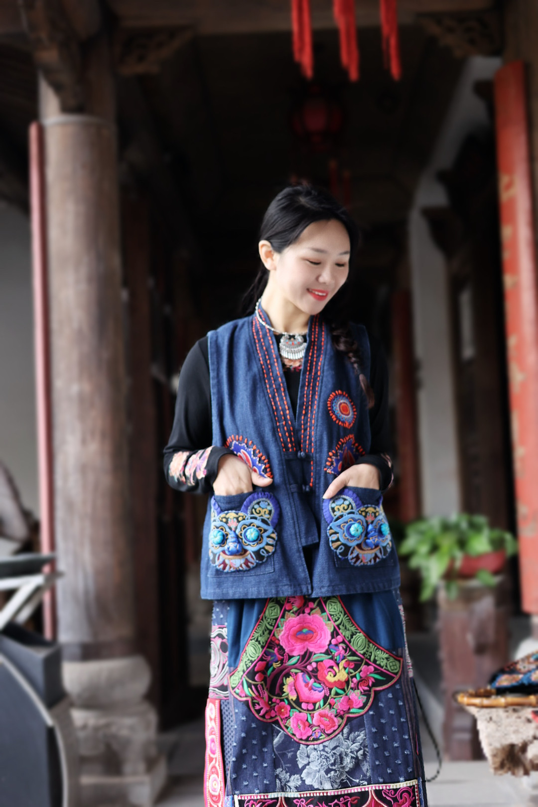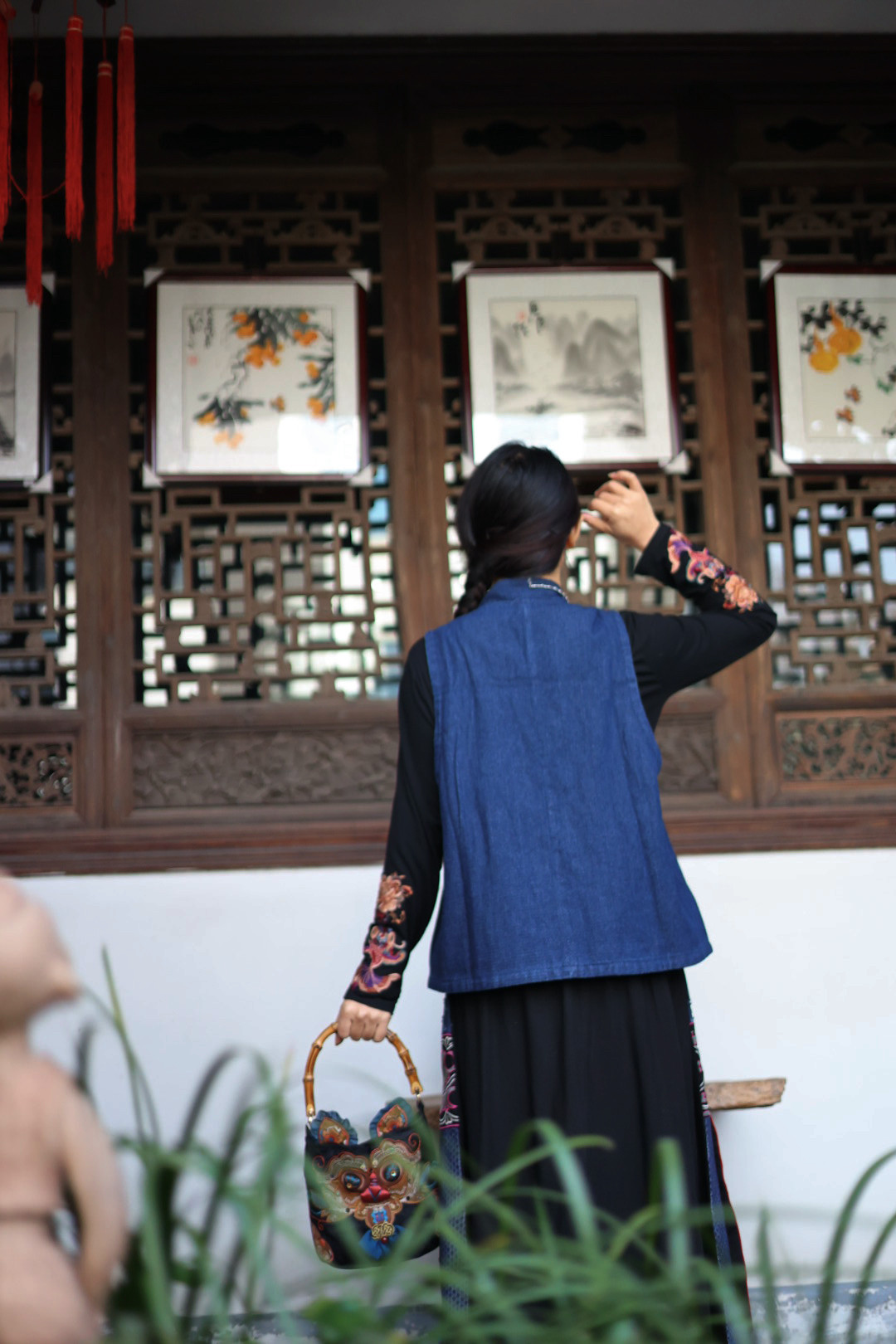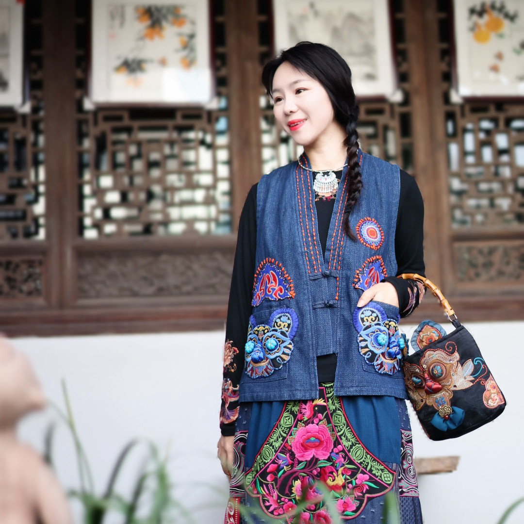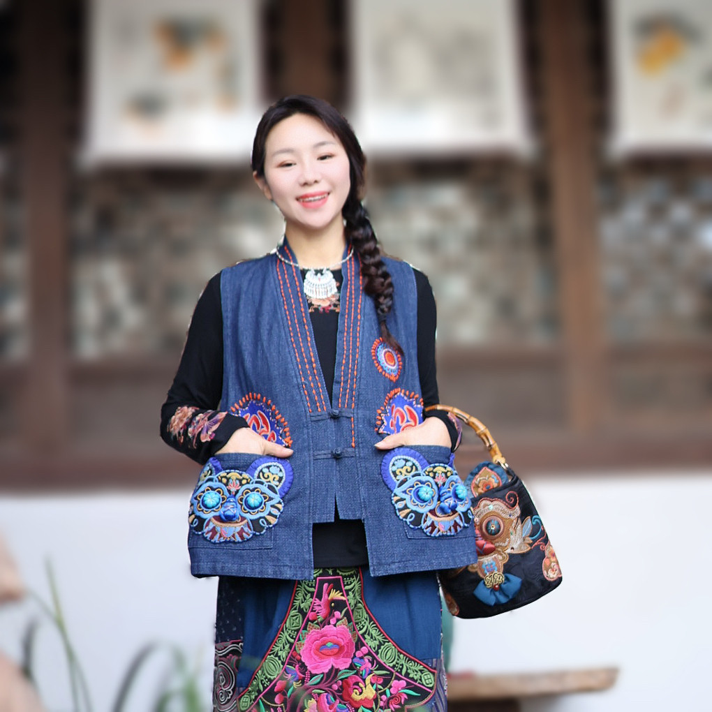 --------------------- 国风马甲民族风贴布刺绣气质V领对襟无袖马夹牛仔棉蓝色百搭上衣 【原售价】411元 【现售价】361元 【推荐理由】