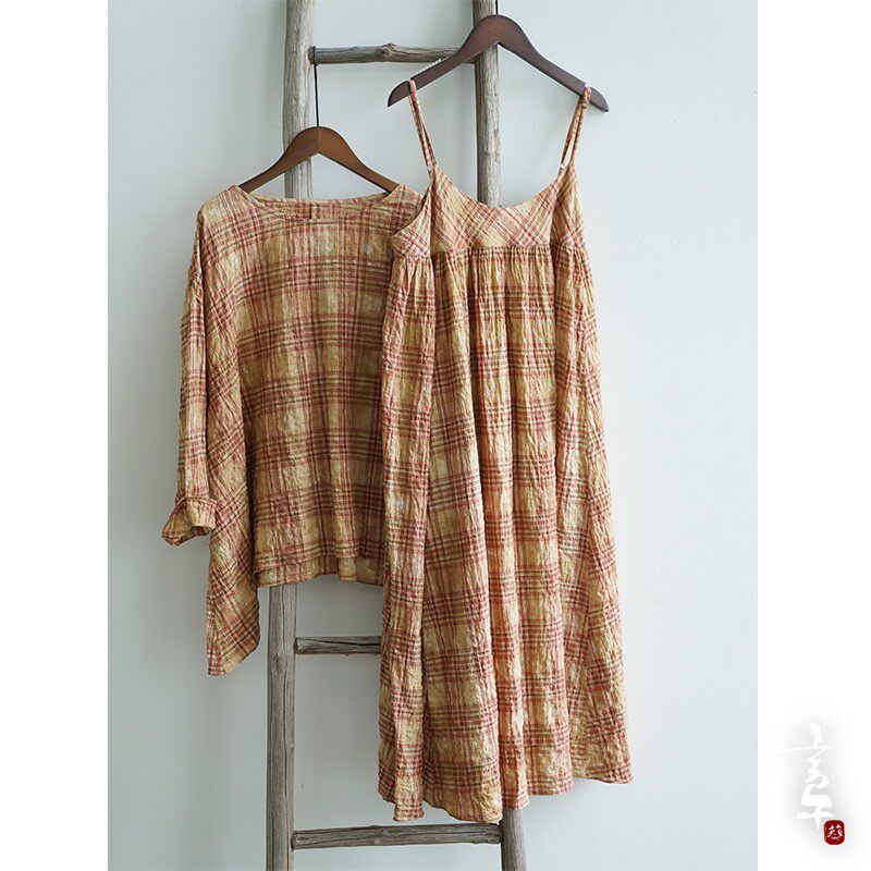 --------------------- 言午葵原创植物染格纹吊带衬衫套装 老钱风做旧宽松长裙吊带裙 【原售价】198元 【现售价】174元 【推荐理由】