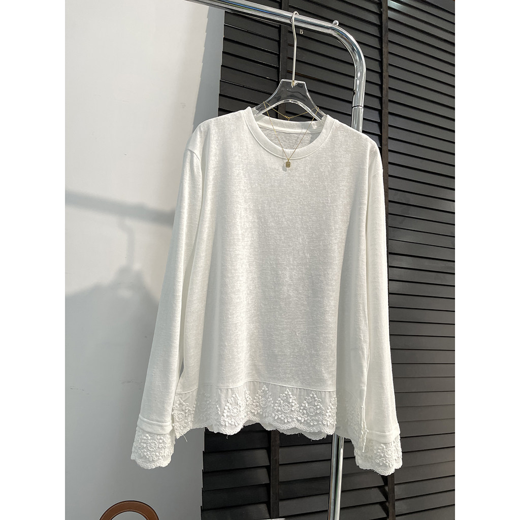 春装新款韩系甜美减龄纯色拼接蕾丝设计感圆领长袖T恤打底上衣潮