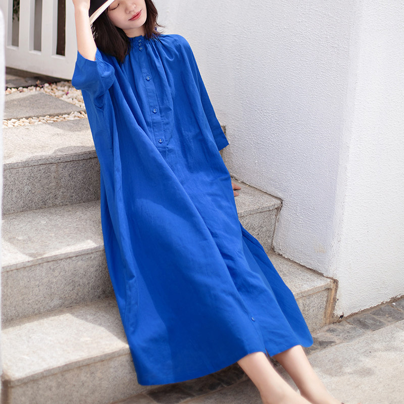 淘宝一非空间亚麻优雅长裙克莱因蓝春夏文艺宽松显瘦微胖气质连衣裙女