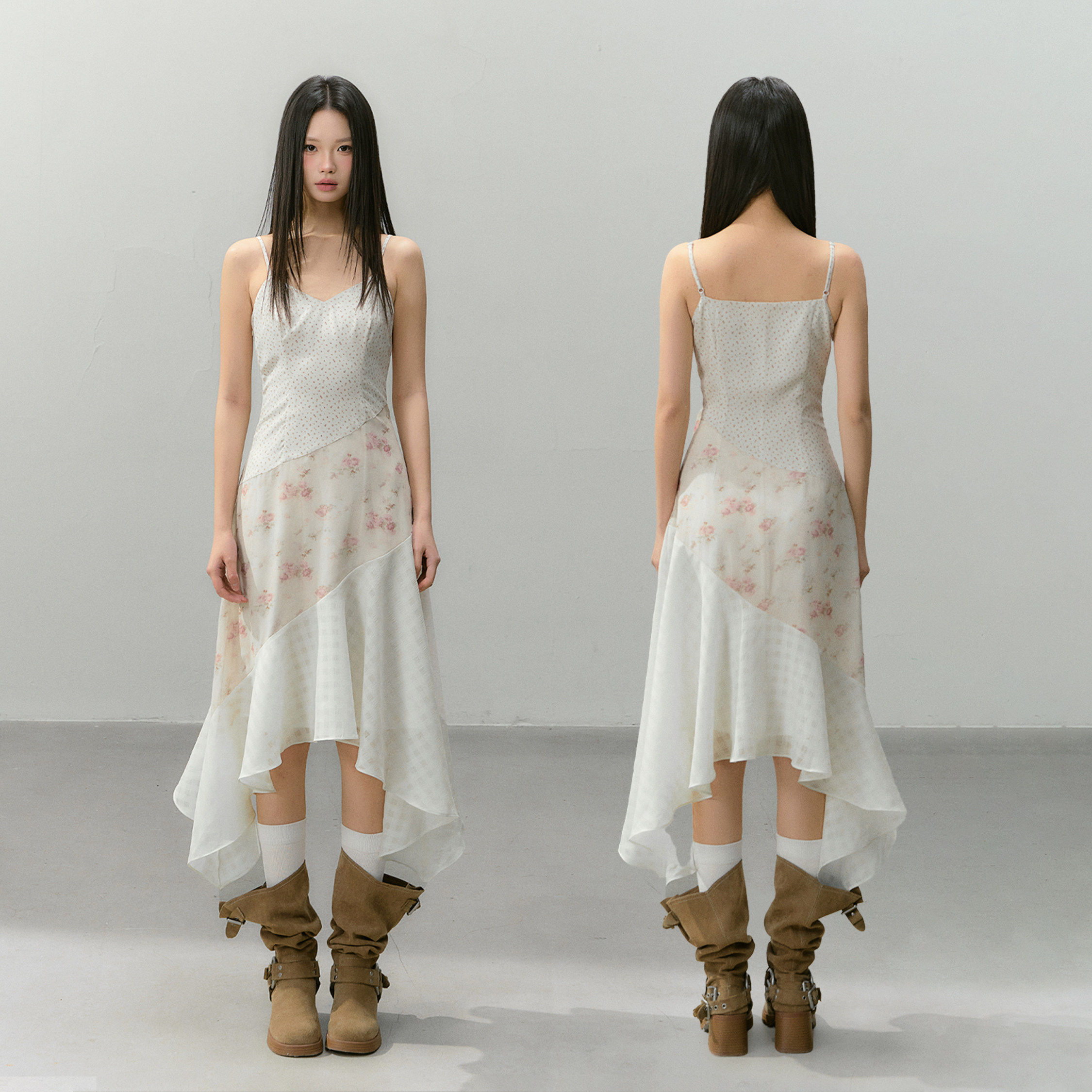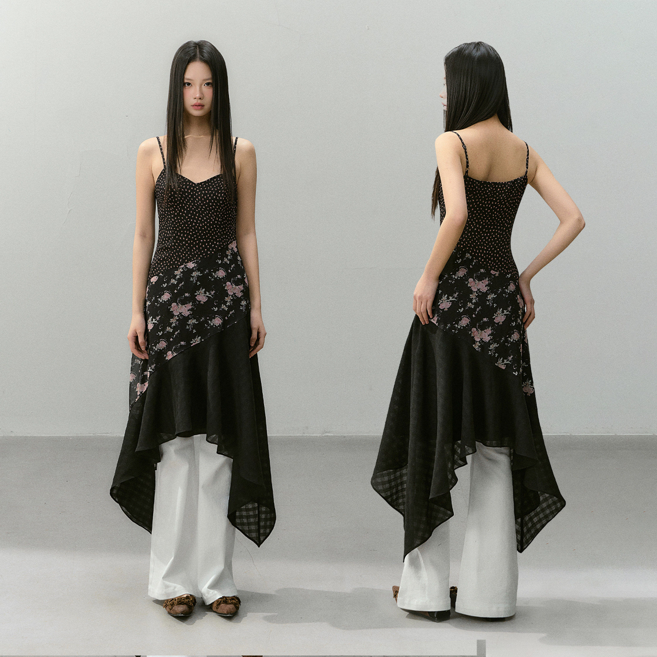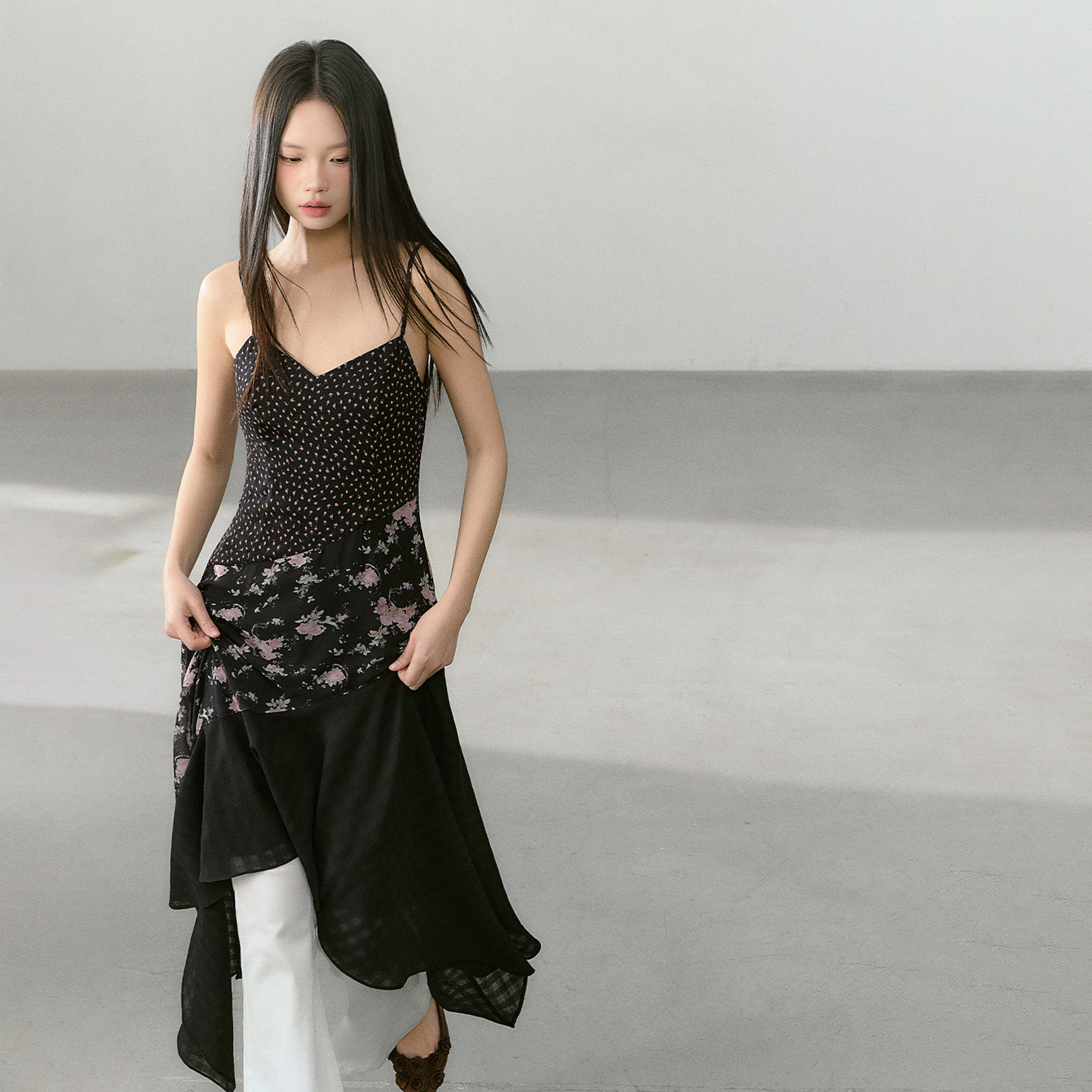 【晁然推荐】CyNi 【海棠听风】V领收腰长裙碎花拼接吊带连衣裙
