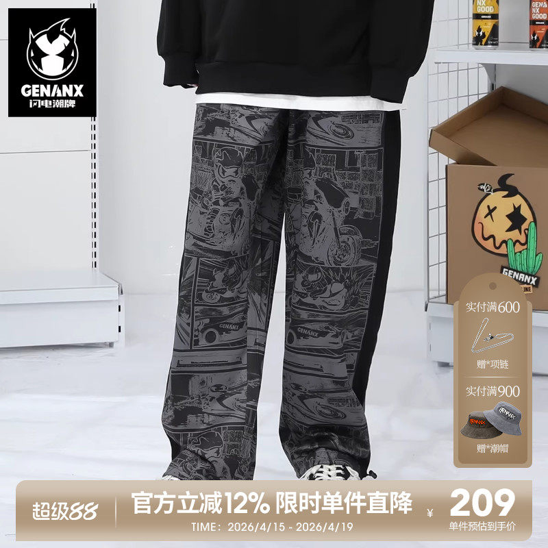 --------------------- GENANX闪电潮牌新款潮牌弹力绳束脚阔腿裤漫画风满印国潮休闲裤男 【原售价】269元 【现售价】209元 【推荐理由】