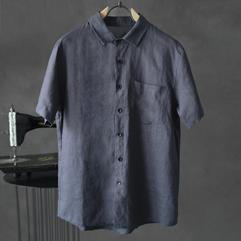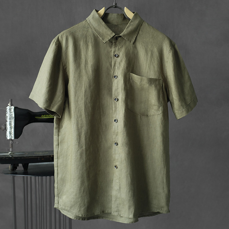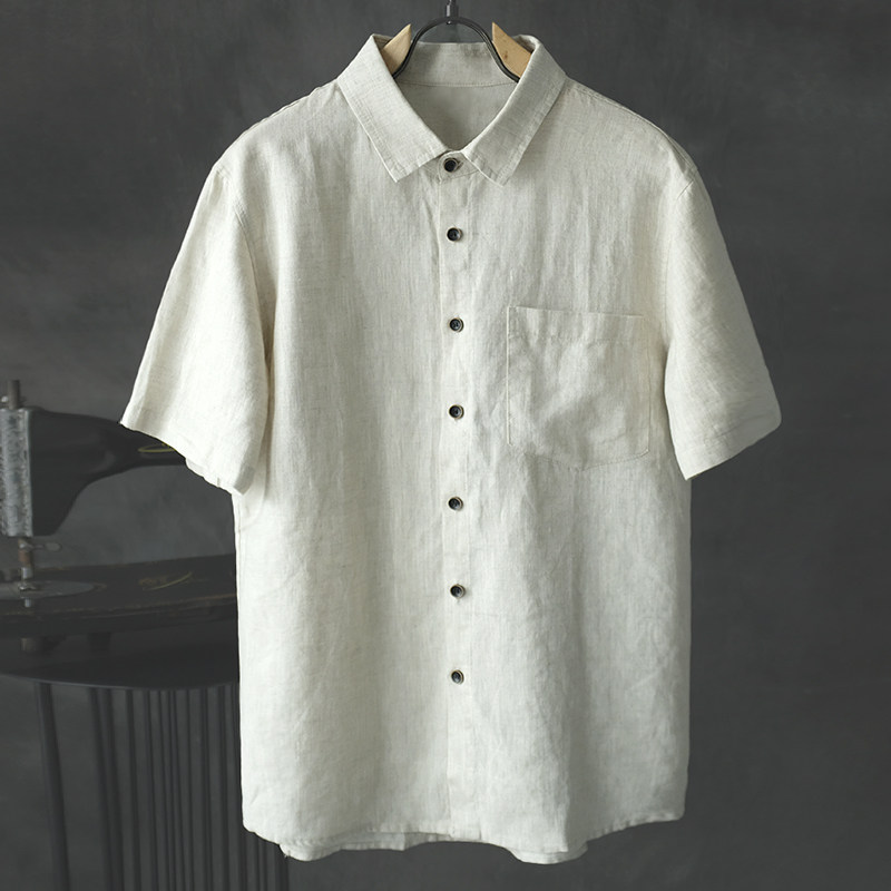 夏季薄款亚麻短袖衬衫男士宽松休闲复古T恤亚麻半袖透气舒适衬衣
