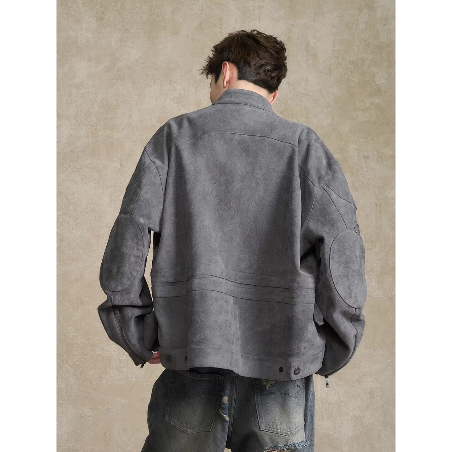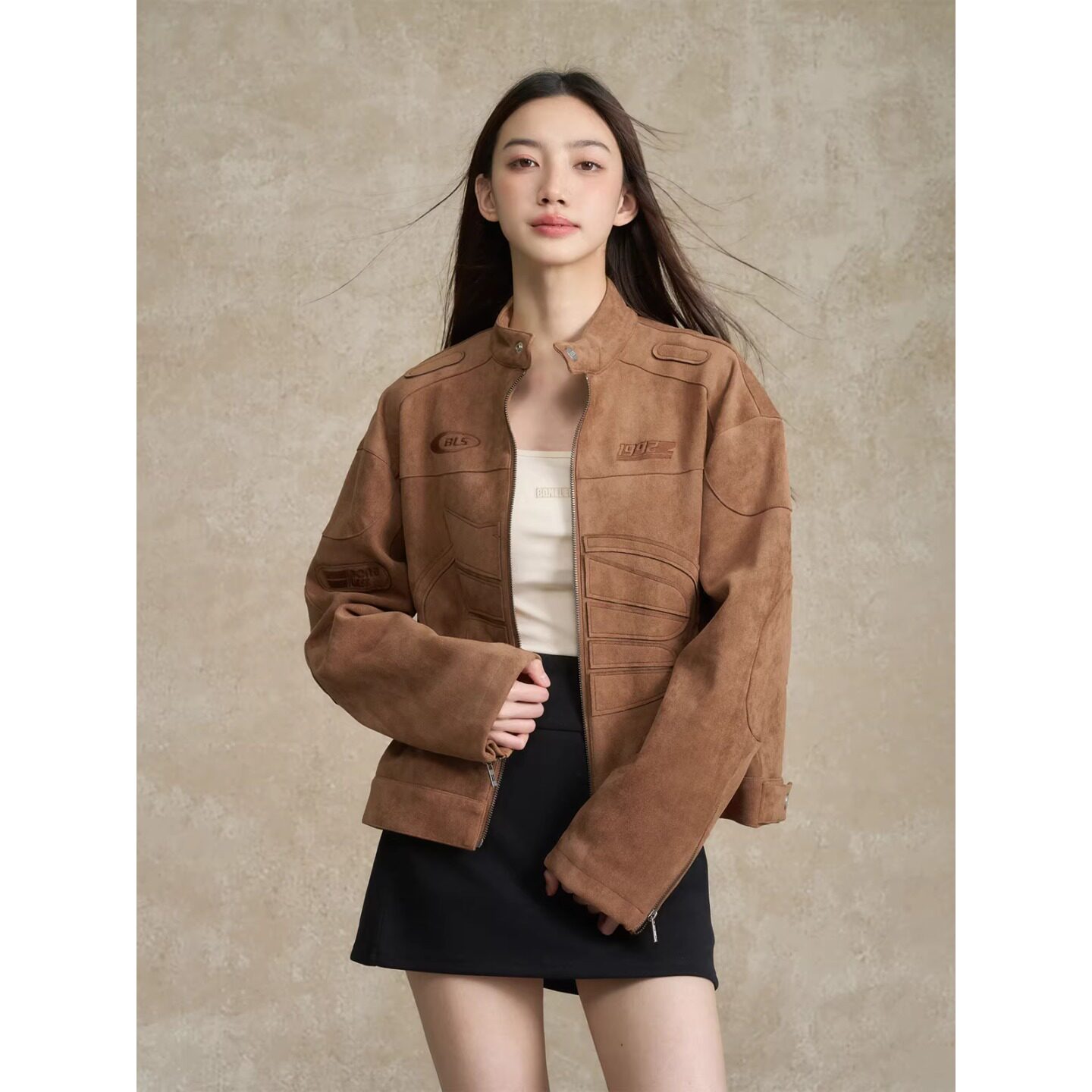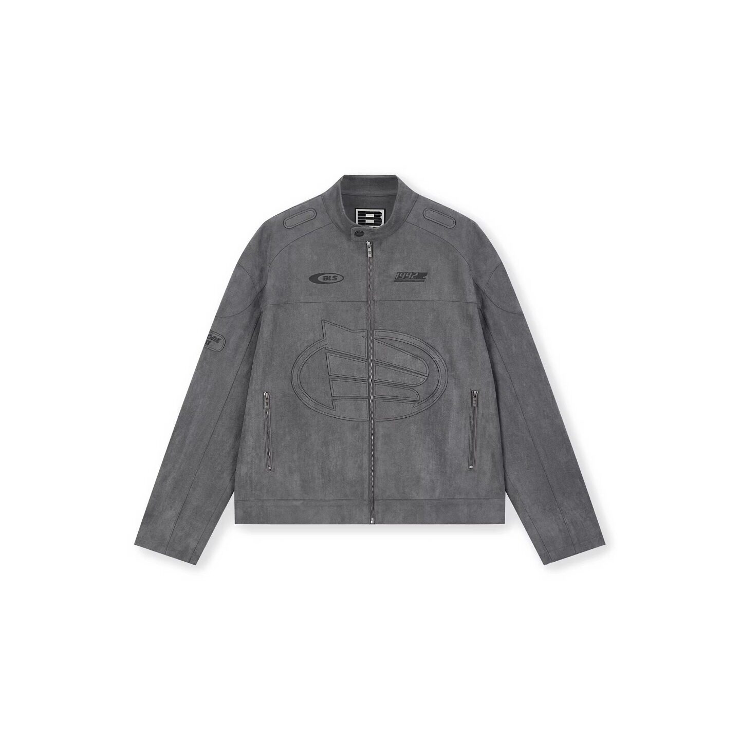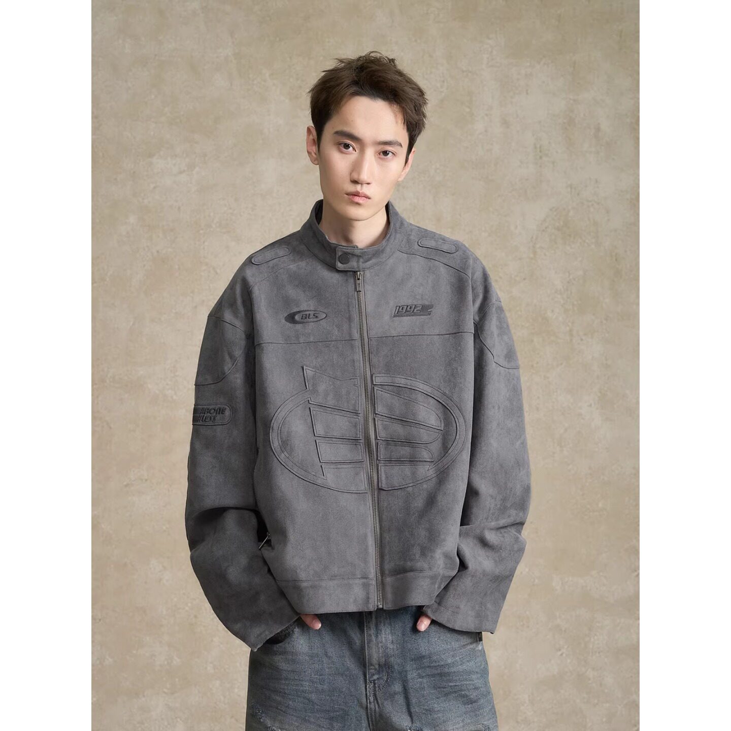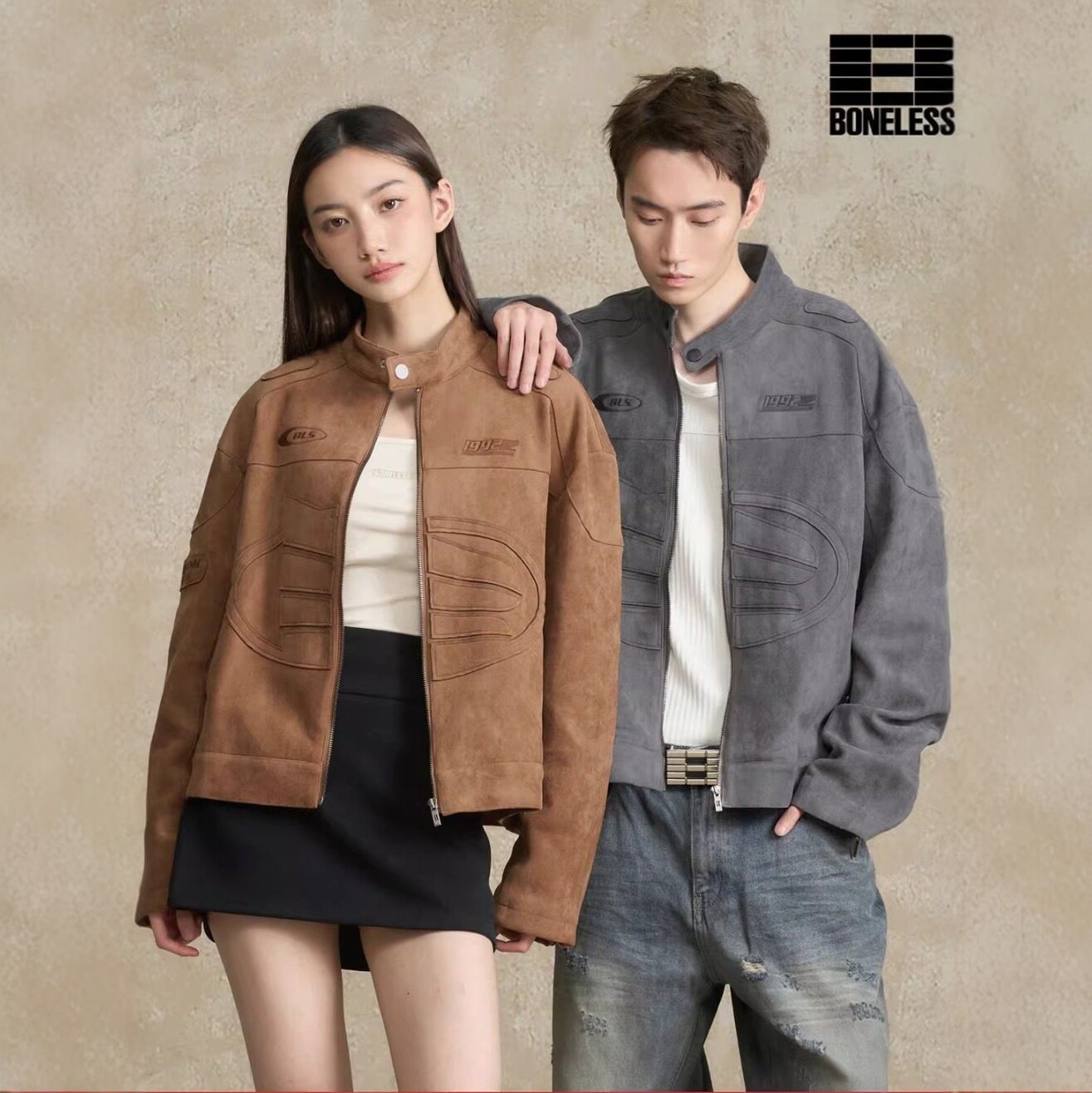 --------------------- BONELESS刺绣logo麂皮机车夹克秋季美式高街休闲翻领复古外套男 --------------------- --------------------- 【原价】599元 【券后价】475元