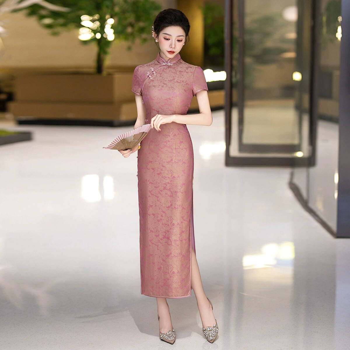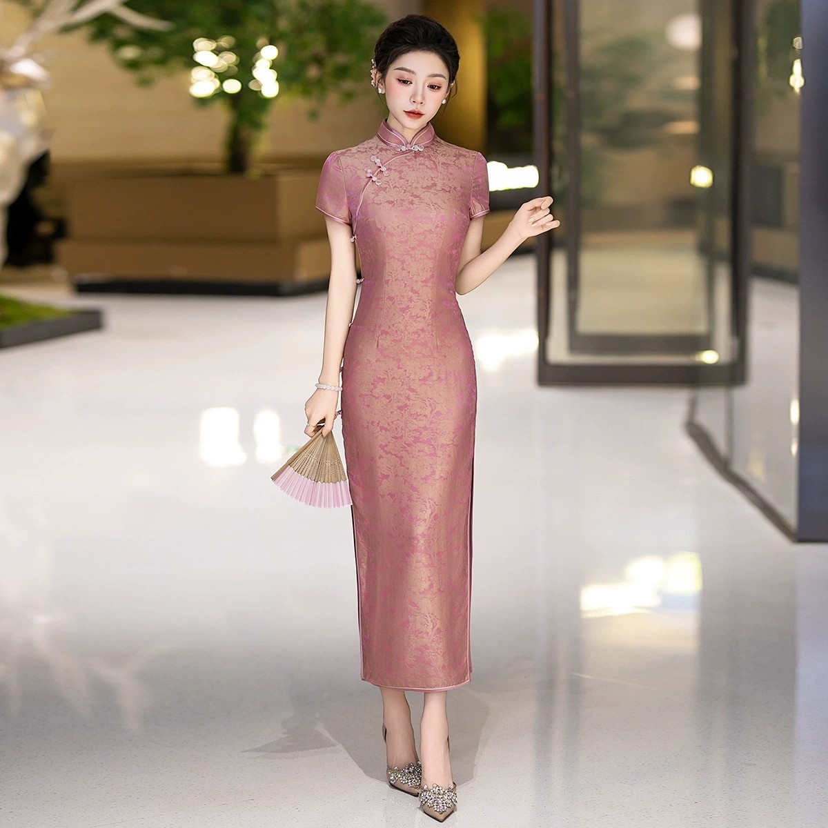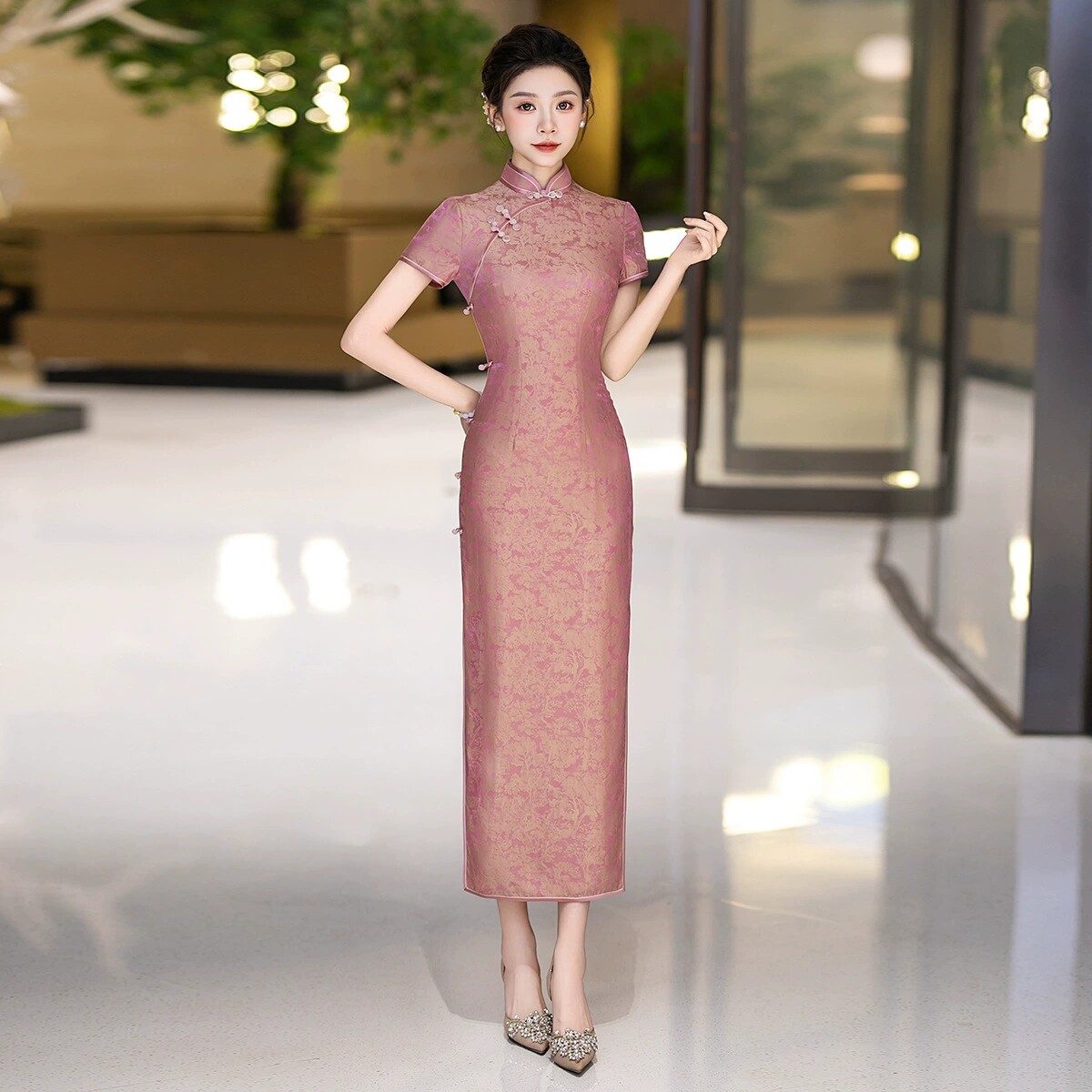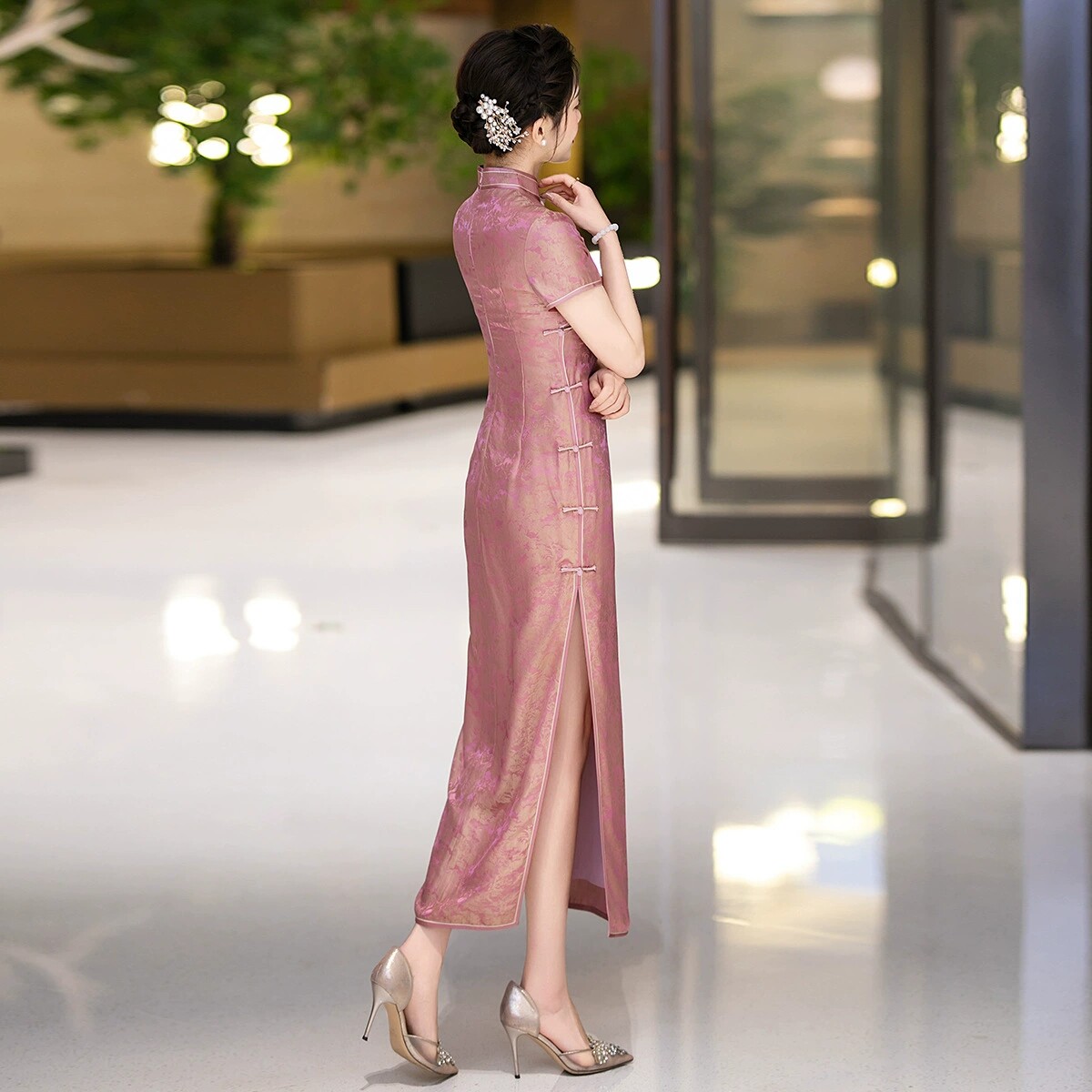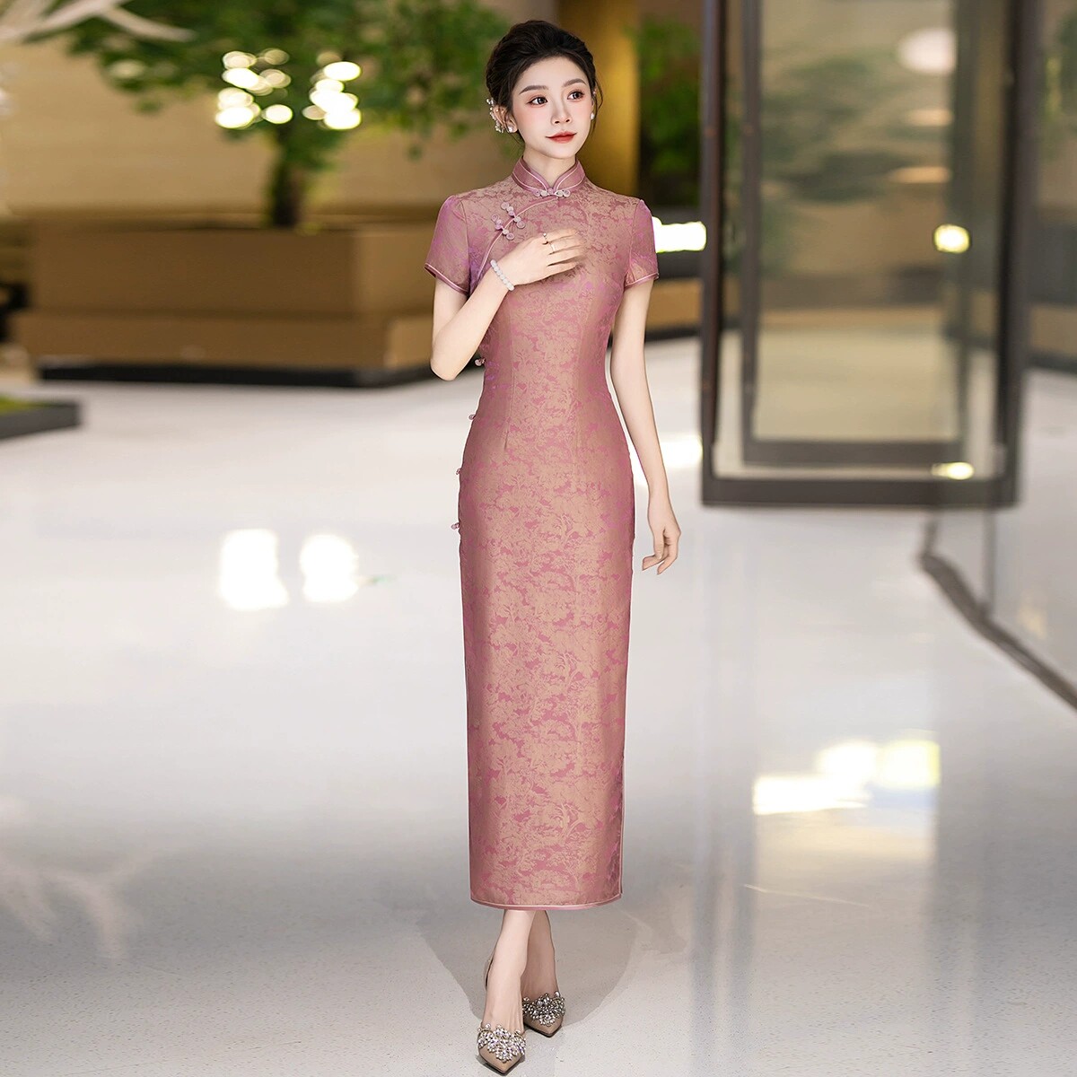 淘宝老上海复古国风高端大气真丝旗袍长款年会演出礼服桑蚕丝手工缝制