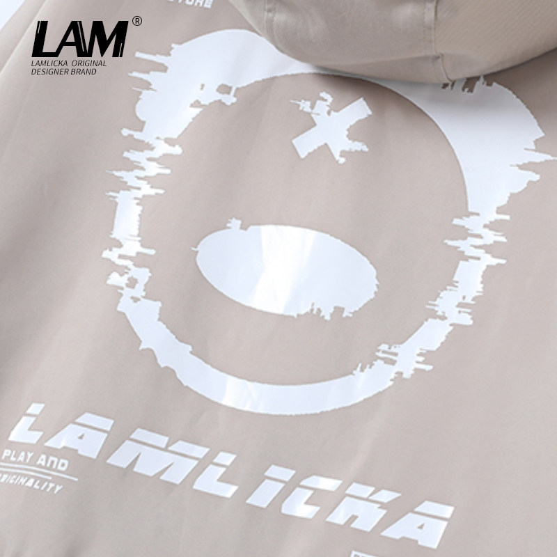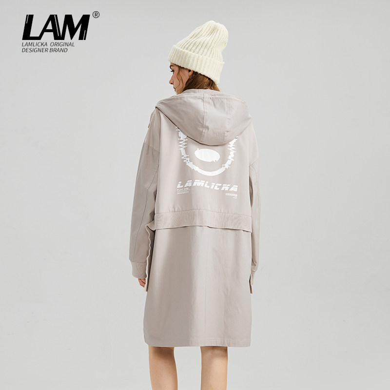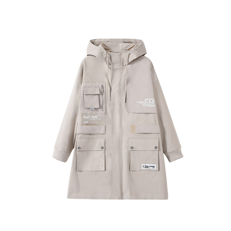 LAMLICKA国潮多口袋连帽中长款风衣男女国潮宽松秋冬情侣上衣外套