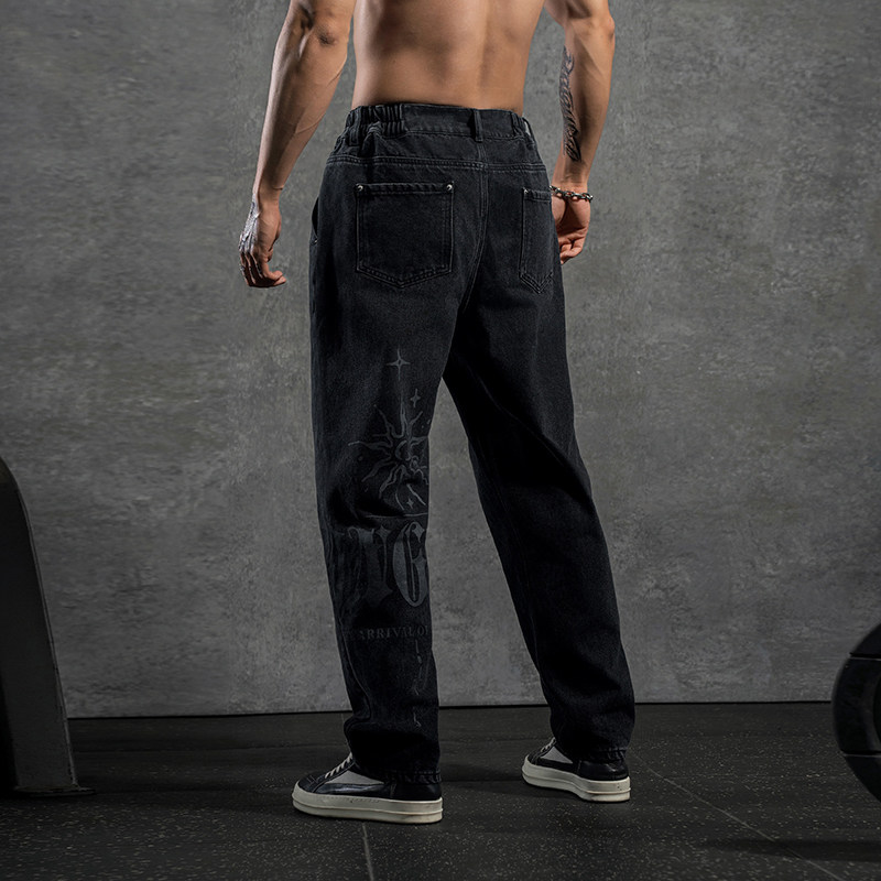 鹿家门国潮大码男装黑色复古牛仔裤印花休闲高街哥特百搭潮流长裤
