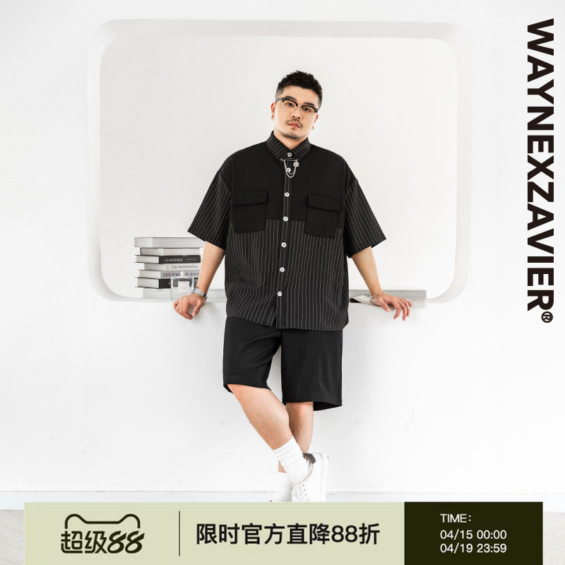 韦恩泽维尔轻商务大码衬衫男短袖夏季宽松设计感拼接条纹衬衣8158