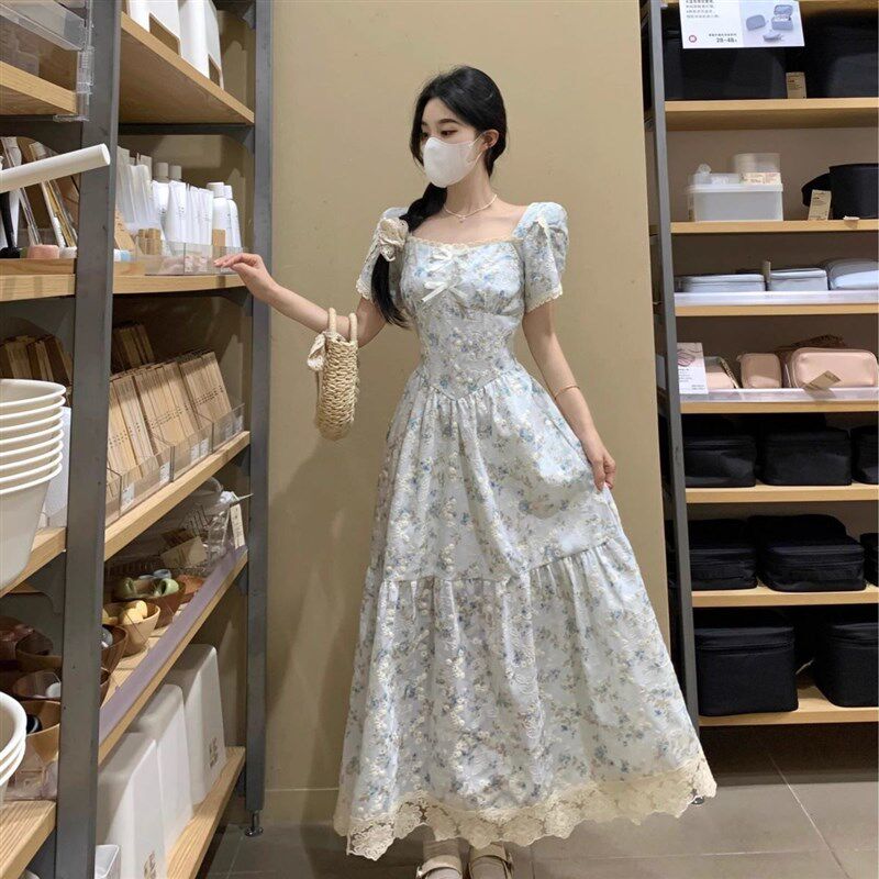 法式方口领碎花蕾丝高腰连衣裙女学生夏季新款高级感气质收腰