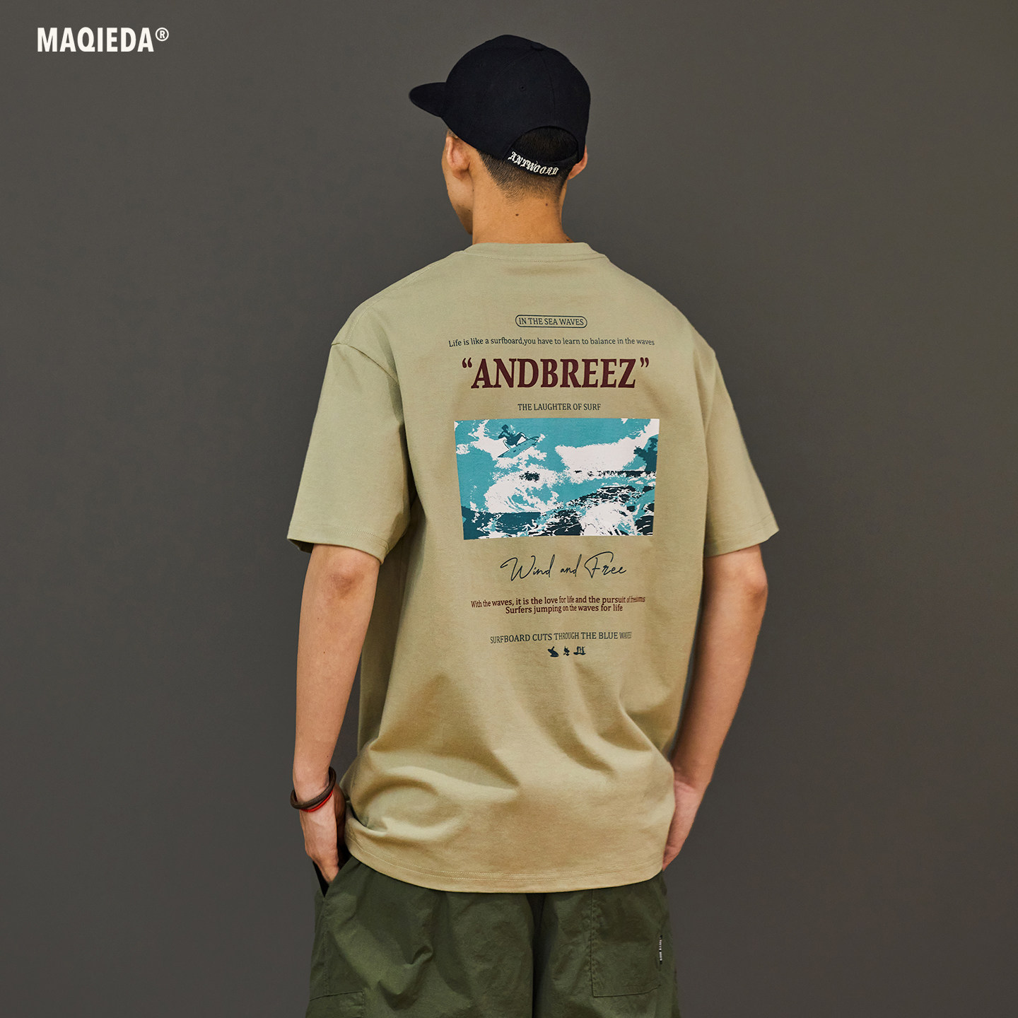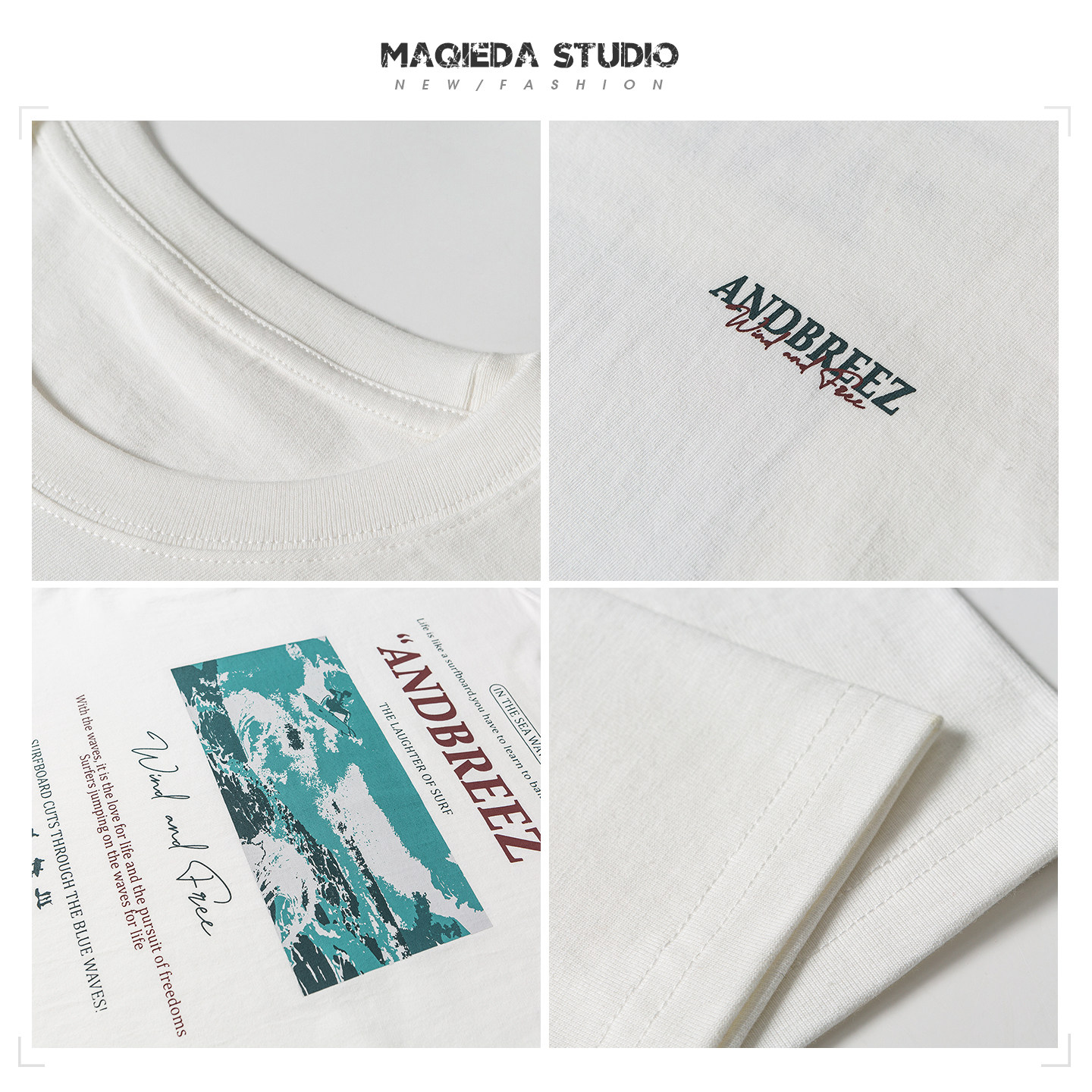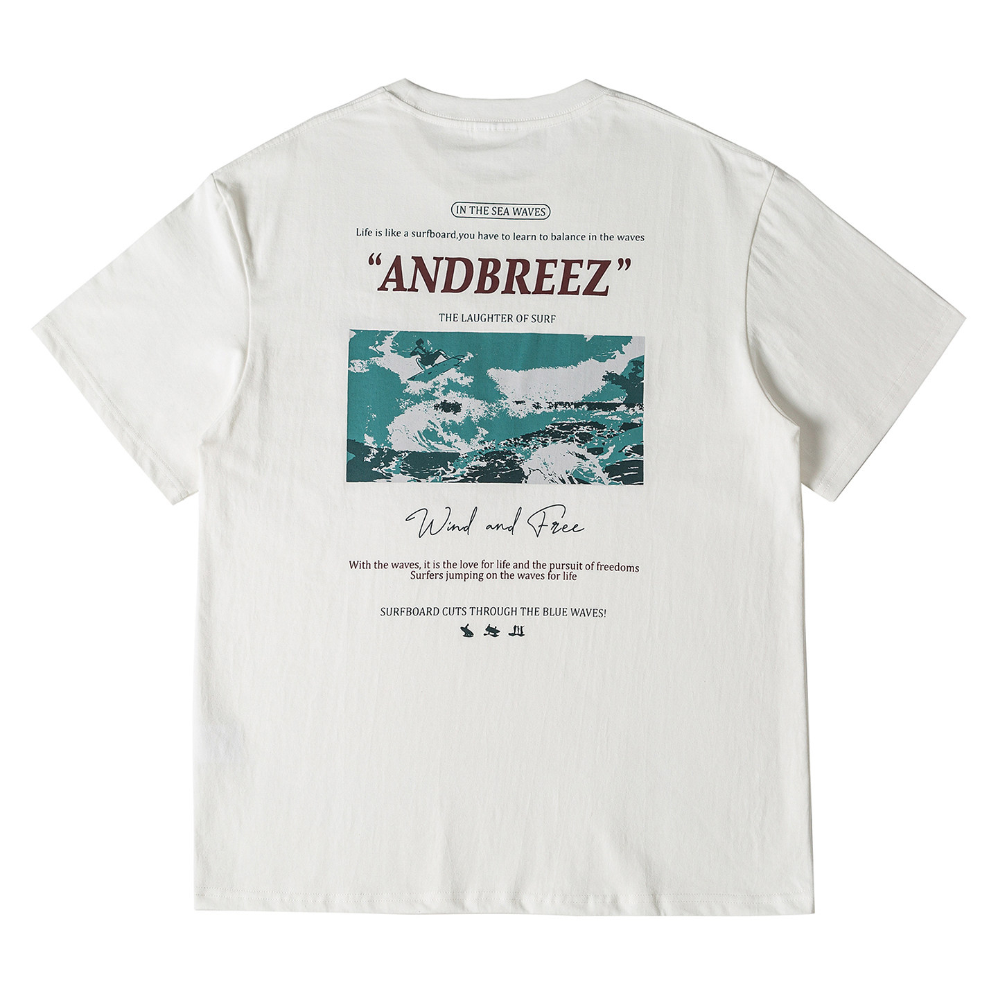 夏季设计感冲浪印花男生休闲短袖美式情侣宽松T恤纯棉小众五分袖