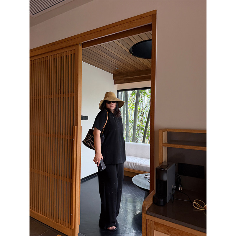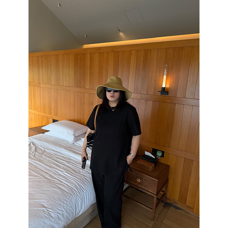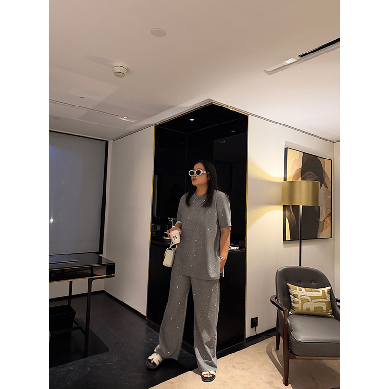 铅笔小鑫大码女装慵懒精致感重工烫钻T恤+阔腿裤套装