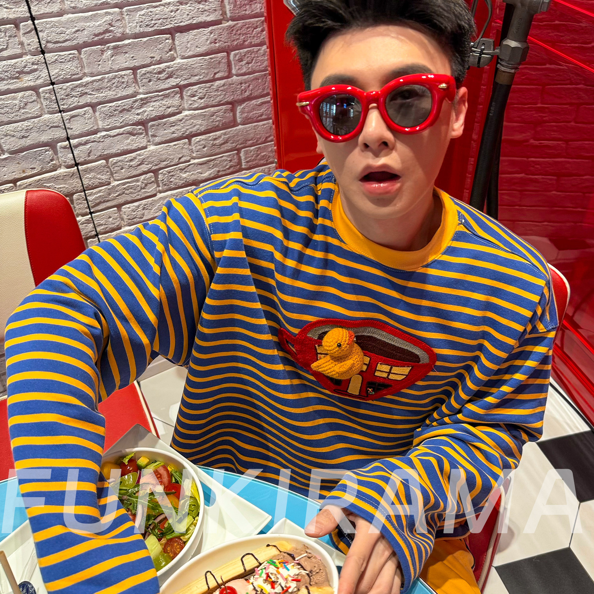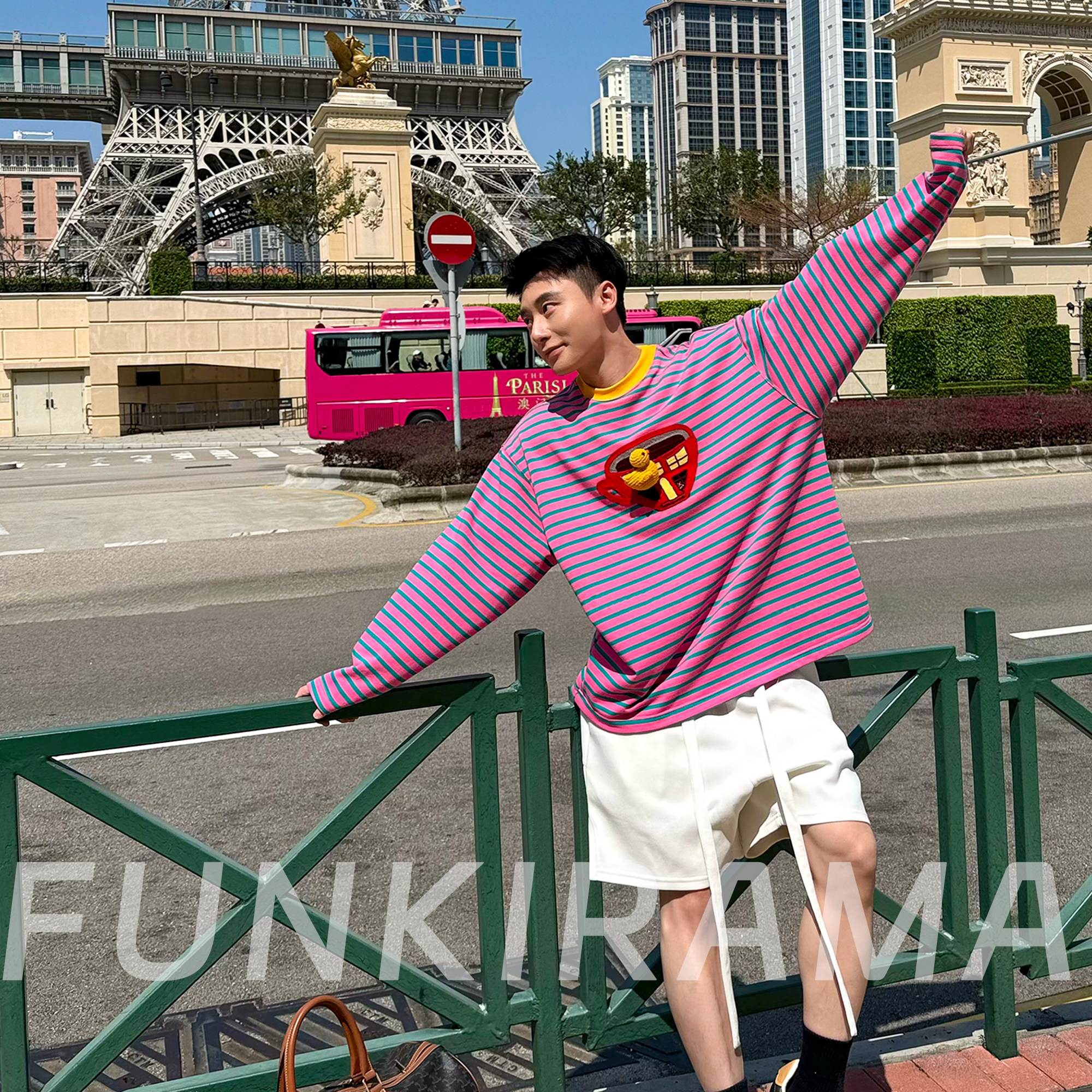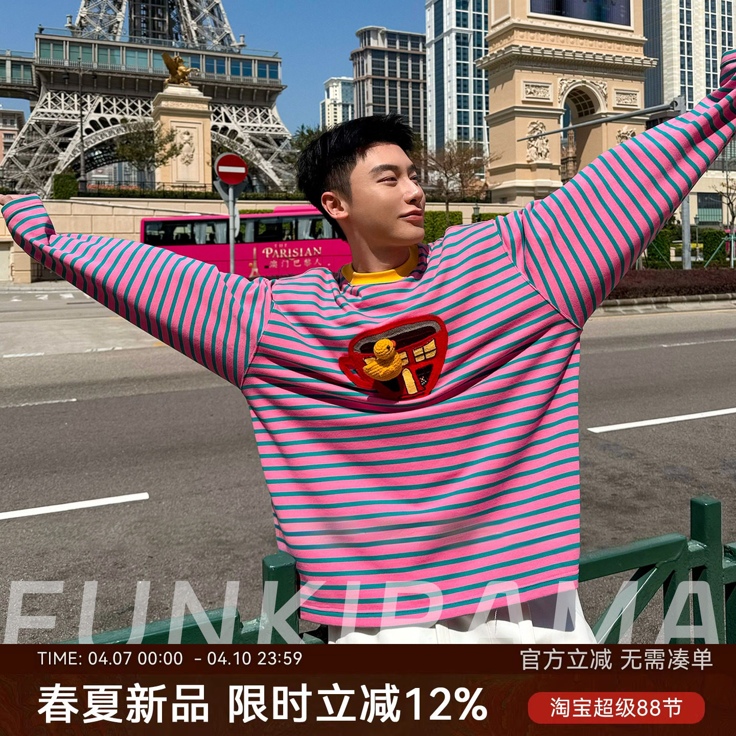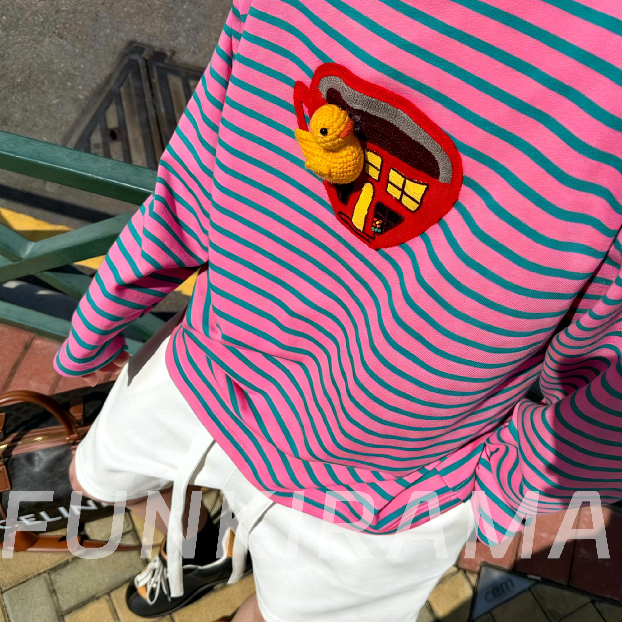 淘宝2026春季新款撞色T恤男女同款宽松条纹针织公仔小鸭子长袖打底衫
