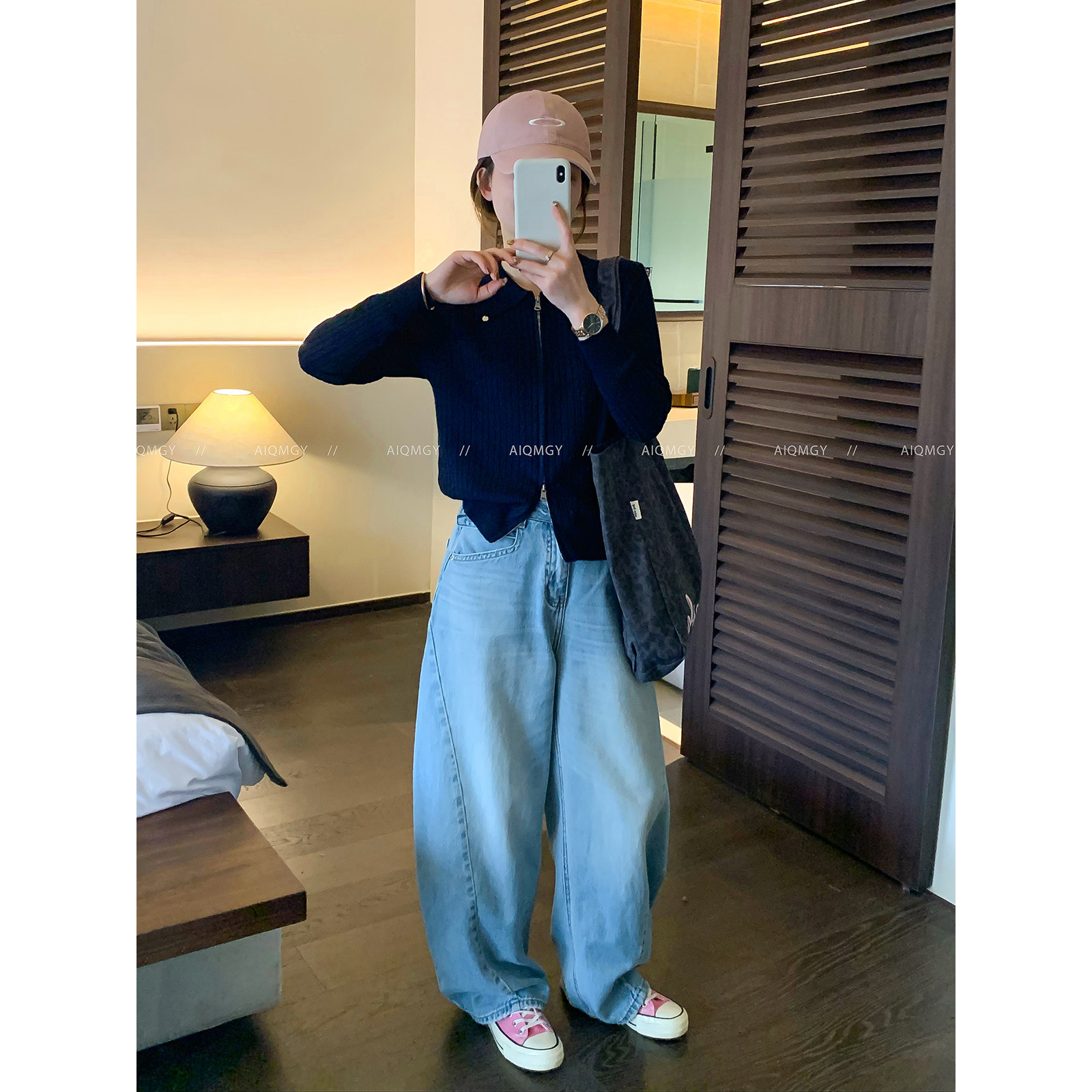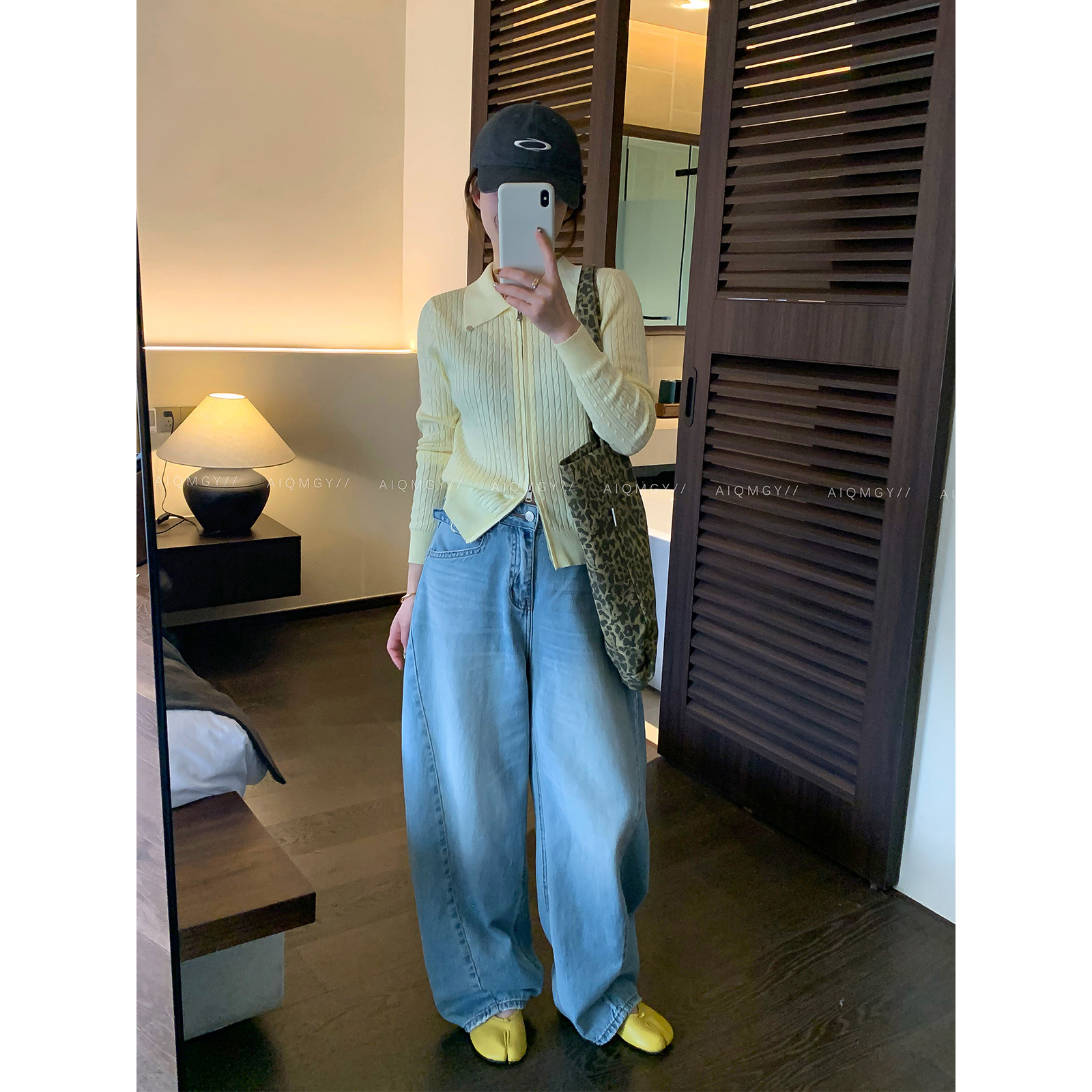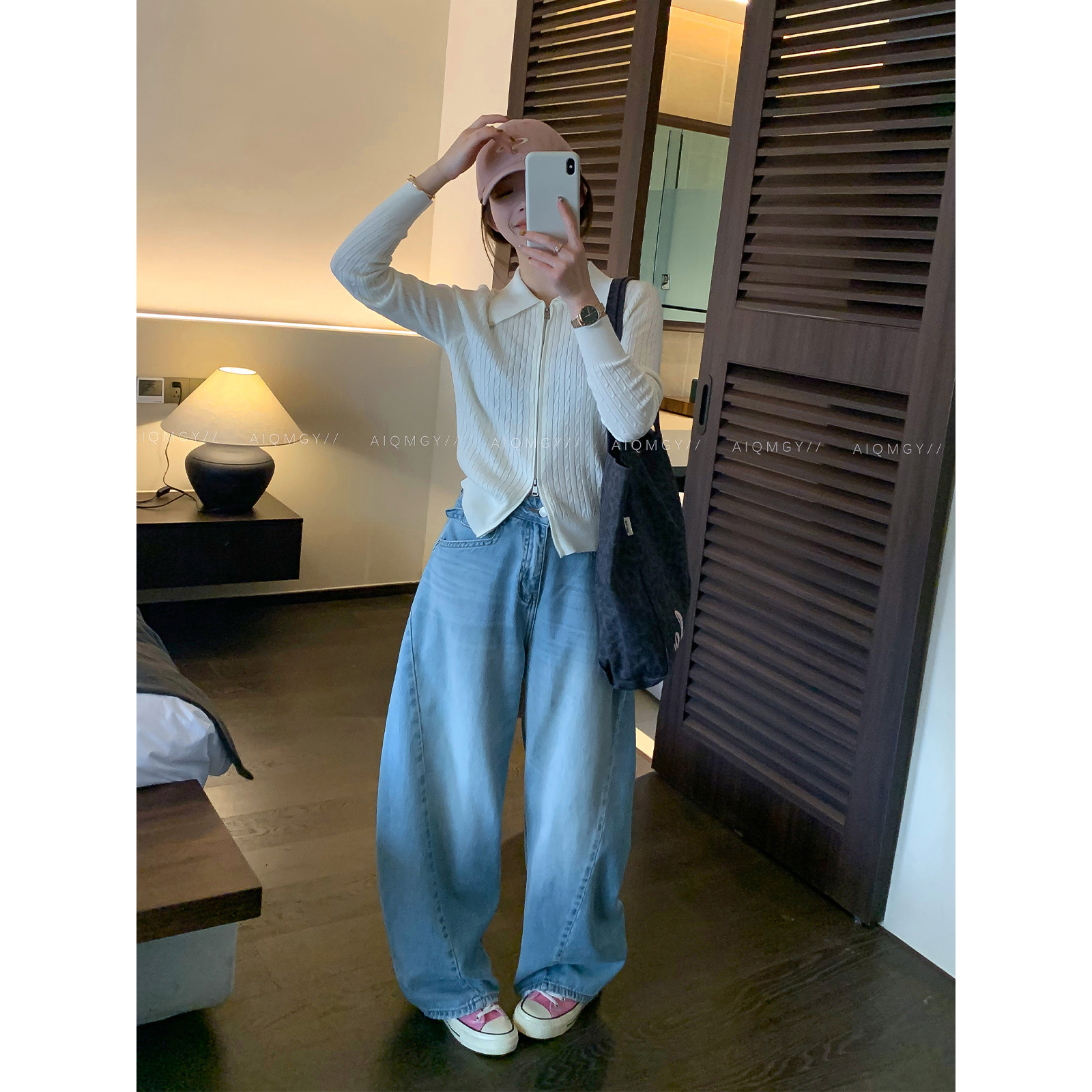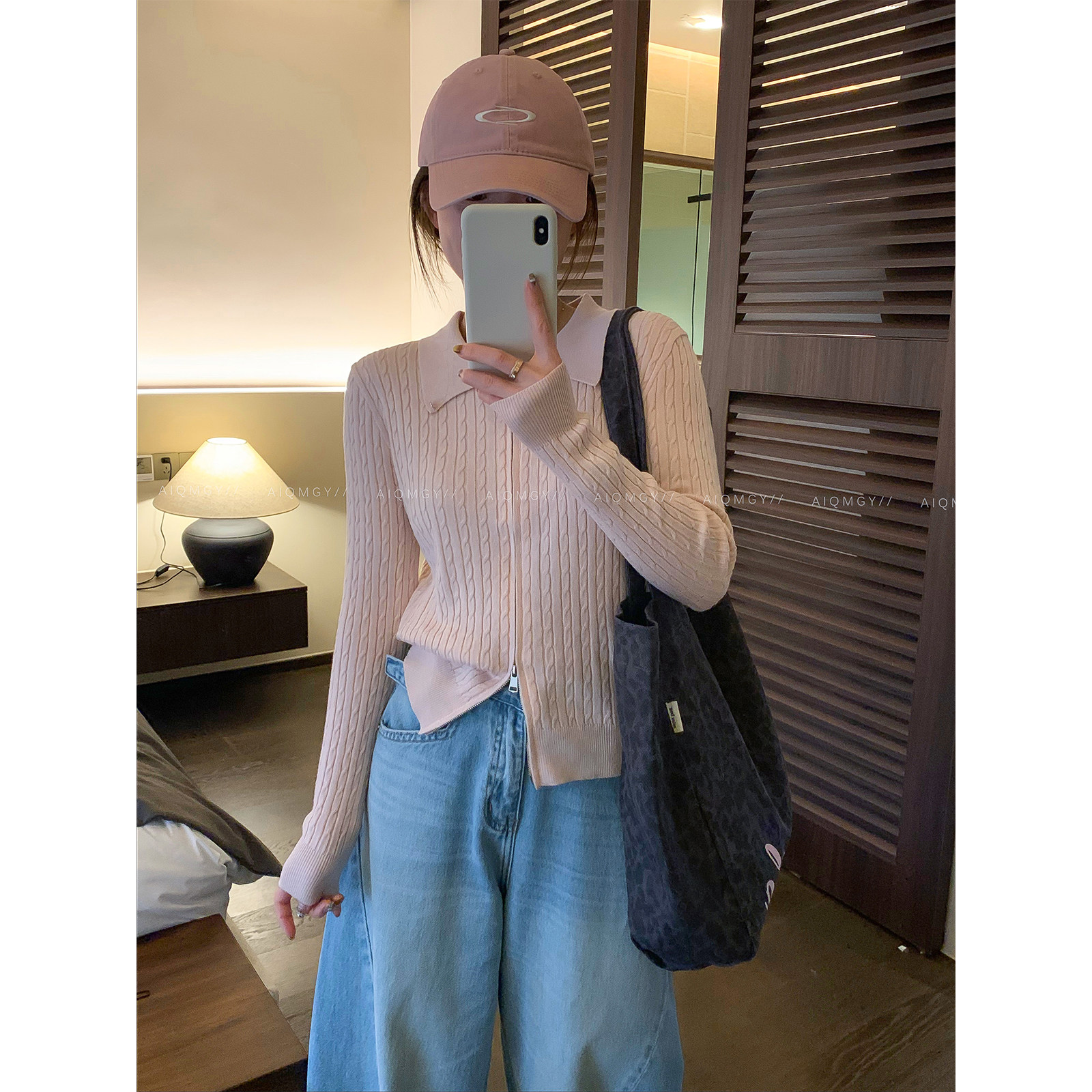爱情魔鬼鱼 米白色长袖翻领麻花针织衫女2026年春季新款拉链上衣