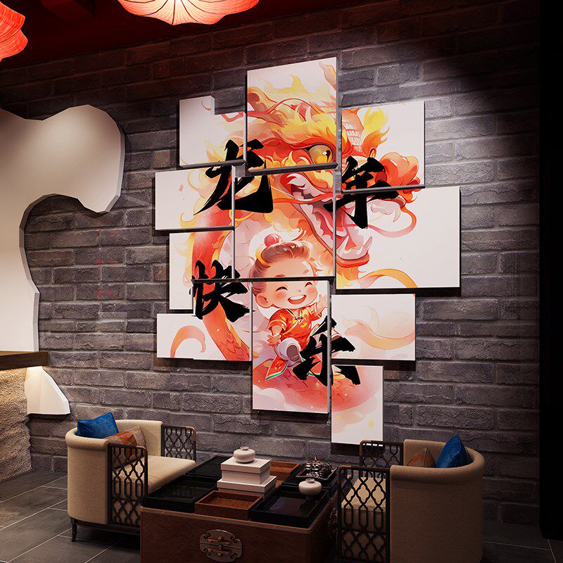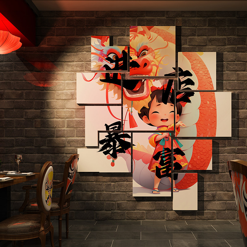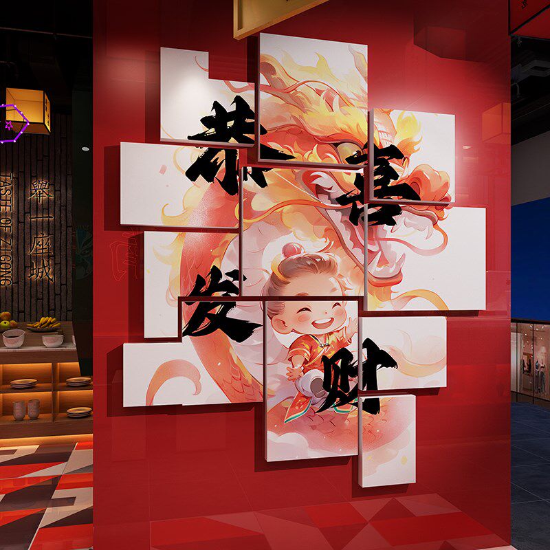 进店暴富贴d纸店铺氛围布置龙年国潮餐饮文化网红墙打卡拍照区装