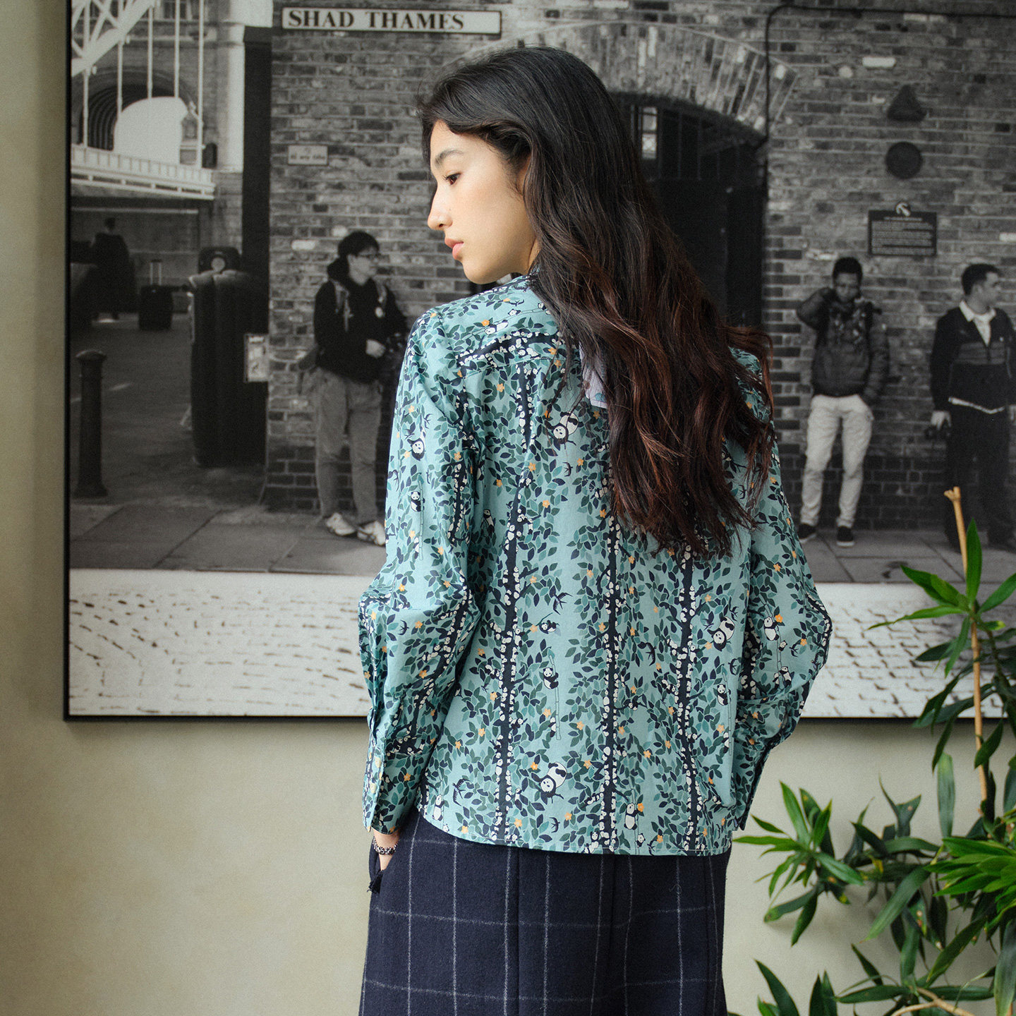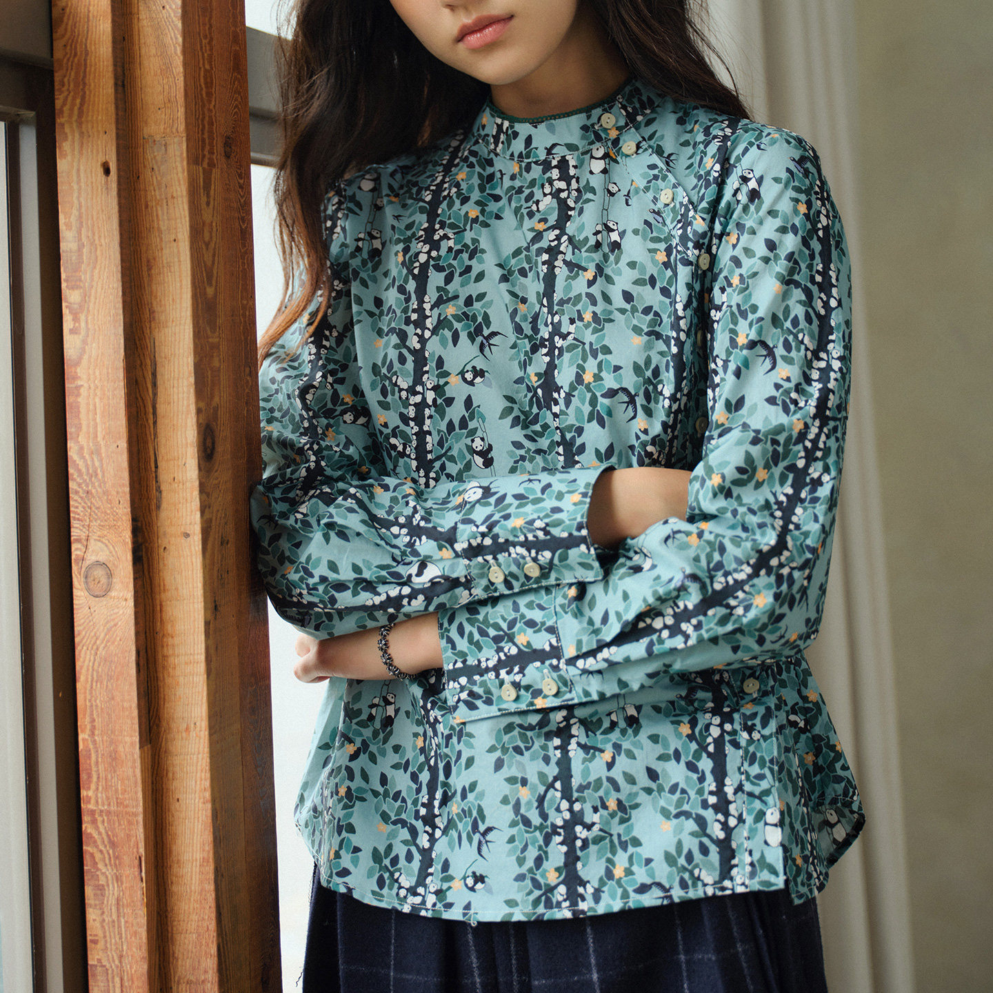非鱼新中式国潮印花套头衫2024秋季新品小立领通勤长袖女衬衫