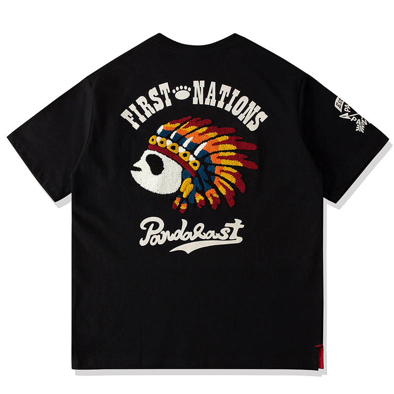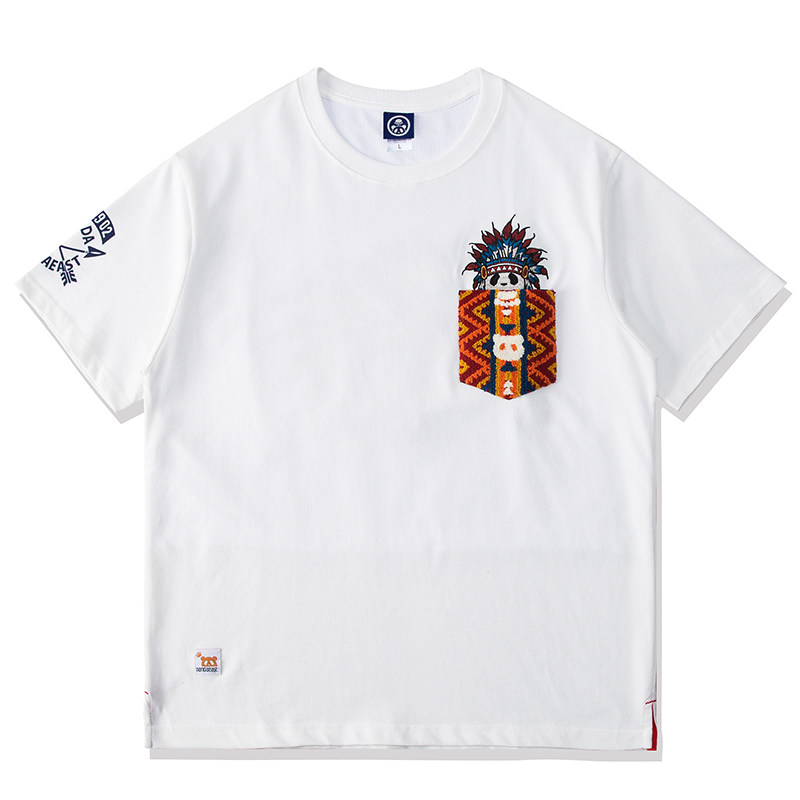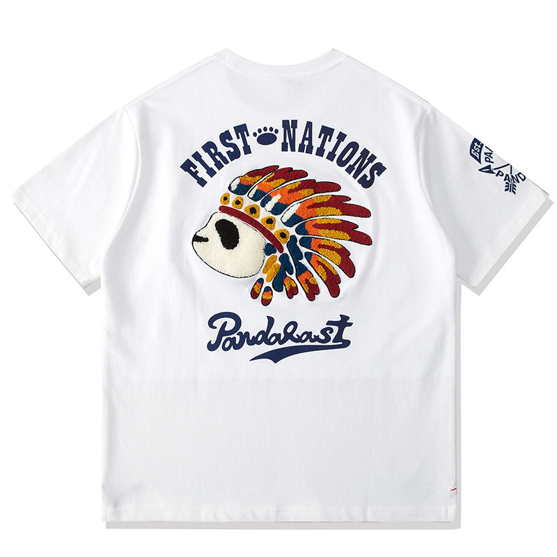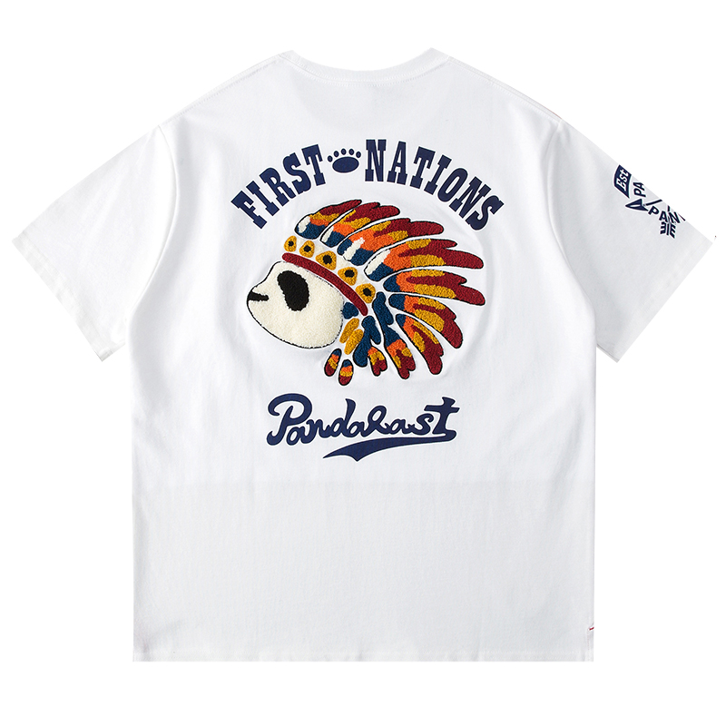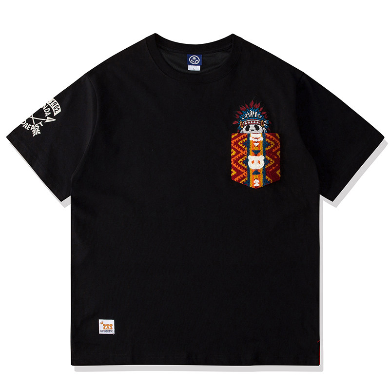 国潮印第安熊猫PANDA卡通刺绣男女短袖T恤手摇口袋情侣纯棉半袖潮
