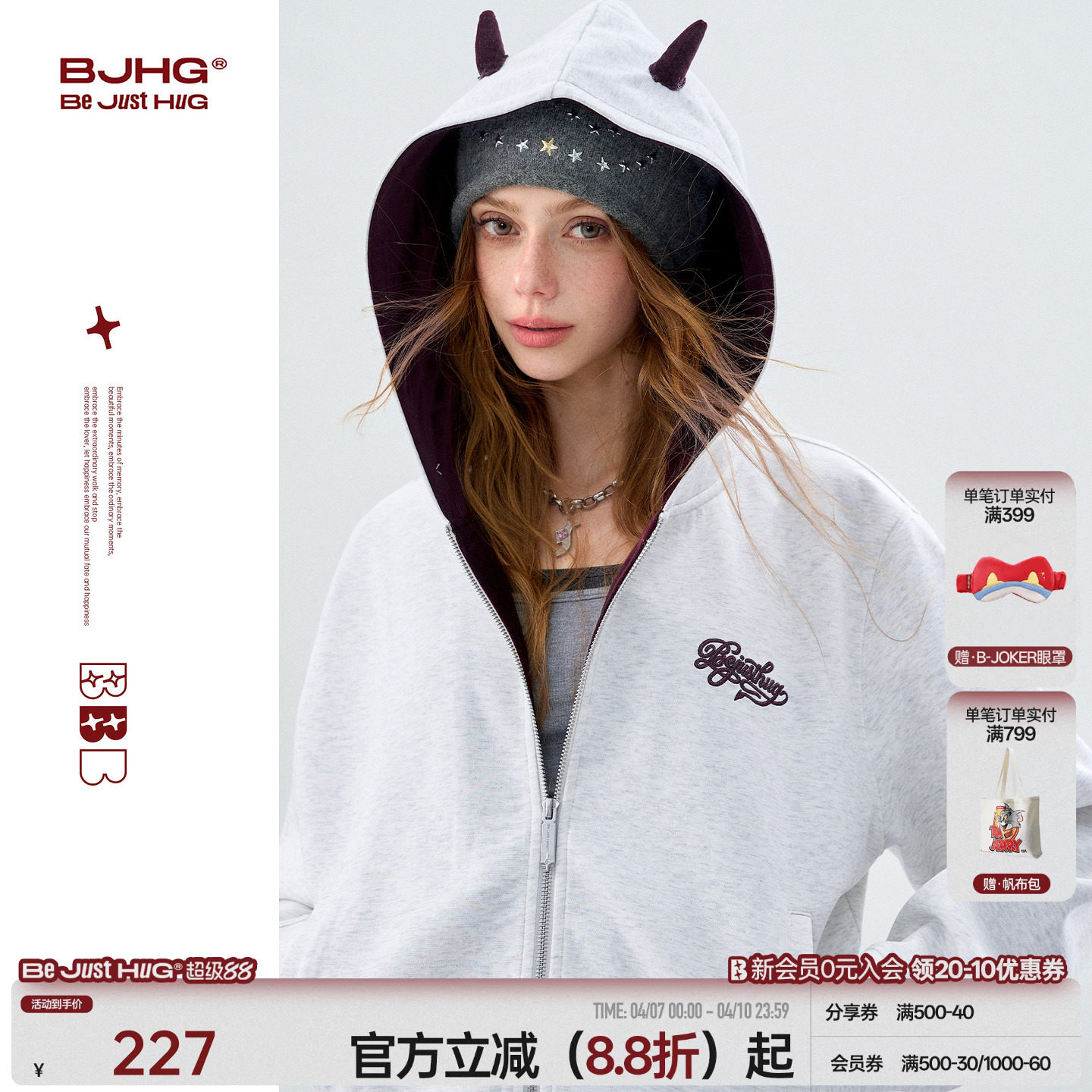 --------------------- BJHG不计后果小恶魔连帽拉链卫衣女早春精致外套新款流行爆款开衫 【原售价】259元 【现售价】227元 【推荐理由】