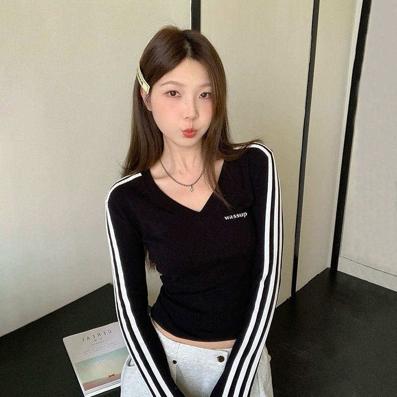 WASSUP美式复古V领长袖t恤女韩系辣妹修身显瘦内搭打底衫紧身上衣