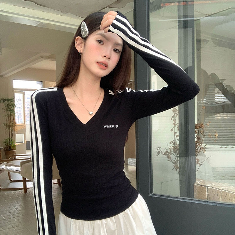 --------------------- WASSUP美式复古V领长袖t恤女韩系辣妹修身显瘦内搭打底衫紧身上衣 【原售价】99元 【现售价】35元 【推荐理由】