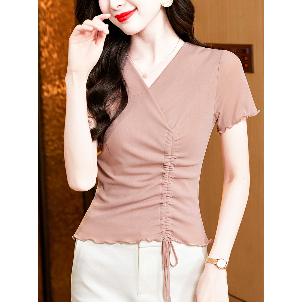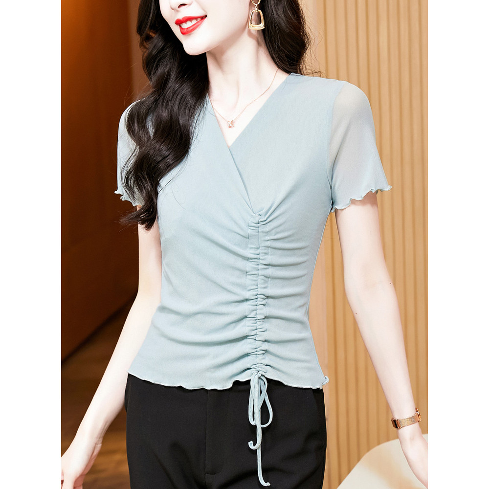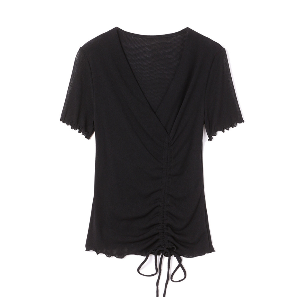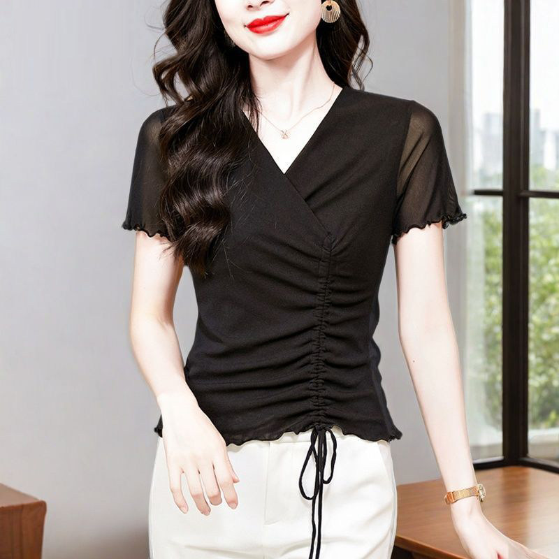 V领抽绳网纱t恤女短袖夏季2026新款黑色蕾丝打底衫洋气小衫上衣