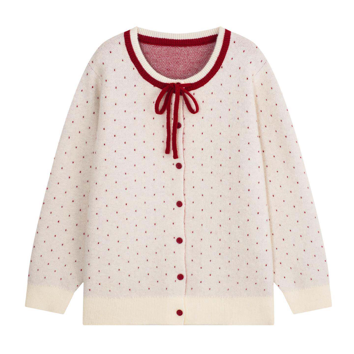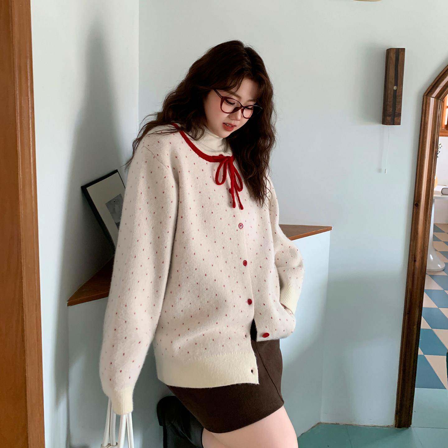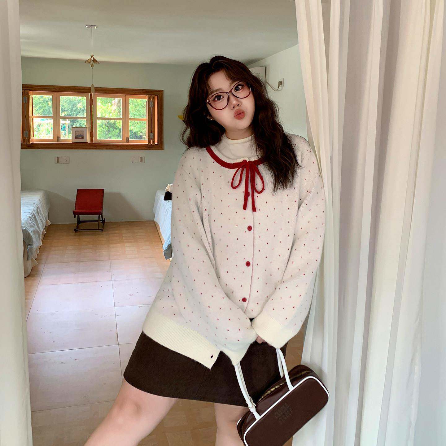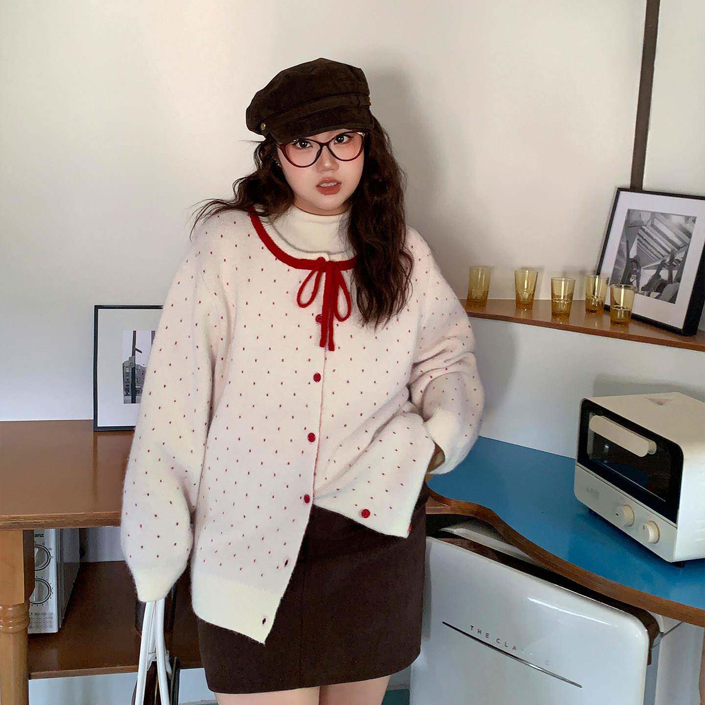淘宝YUZI鱼子红波点复古针织开衫特大码女装胖mm少女宽松软糯圆领毛衣