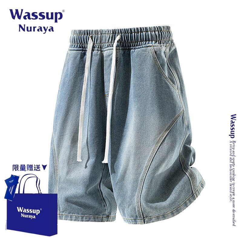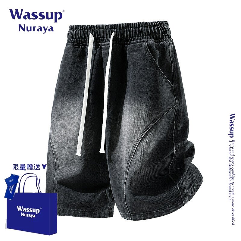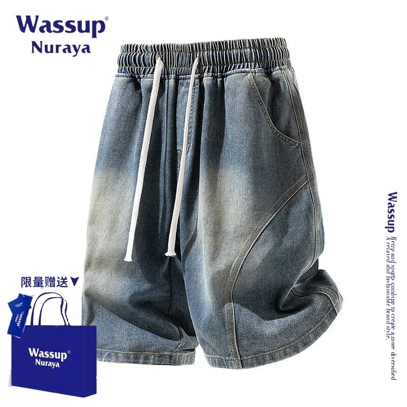 WASSUP NURAYA美式牛仔短裤男夏季薄款松紧腰抽绳宽松休闲五分裤