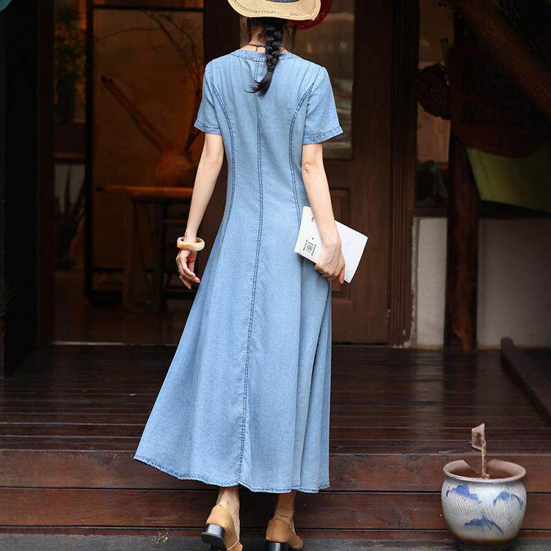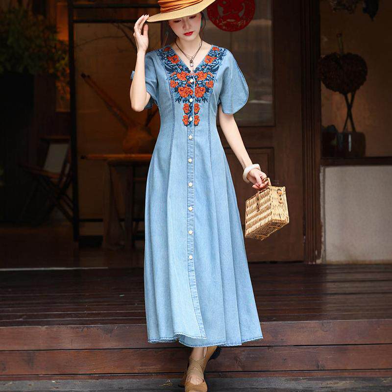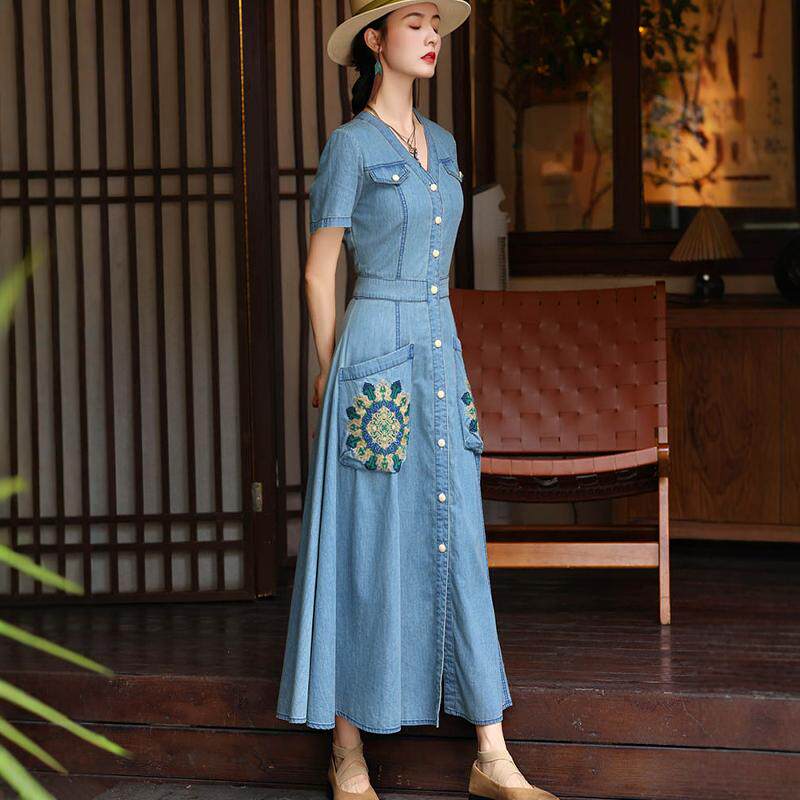 开衫V领显瘦牛仔长裙女2026夏季新款复古港风刺绣大摆连衣裙A字裙
