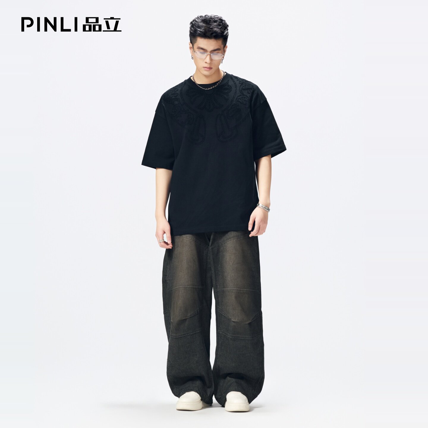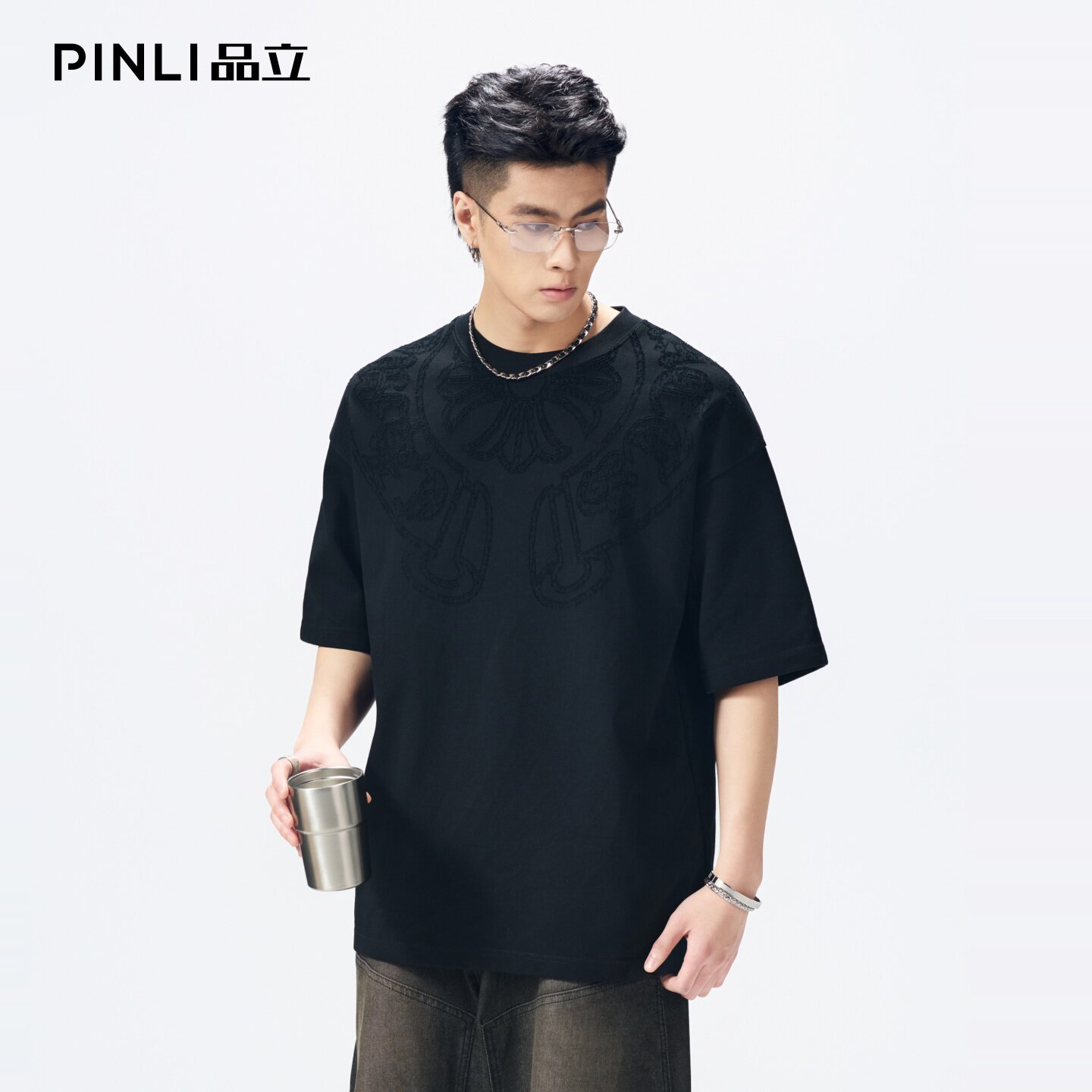 PINLI品立2026夏季新款男士宽松圆领激光烧花短袖T恤休闲上衣潮牌