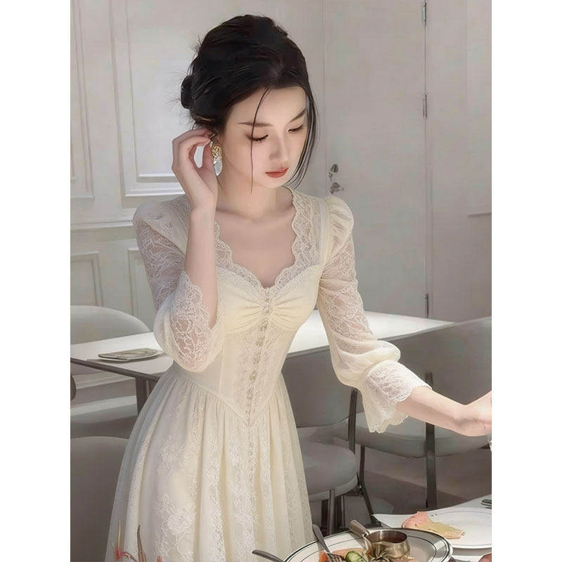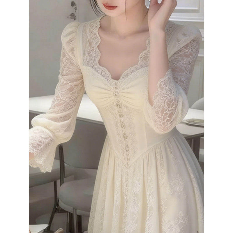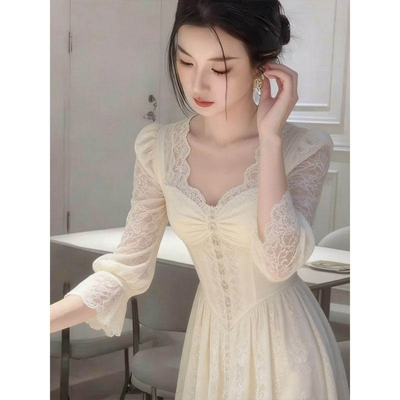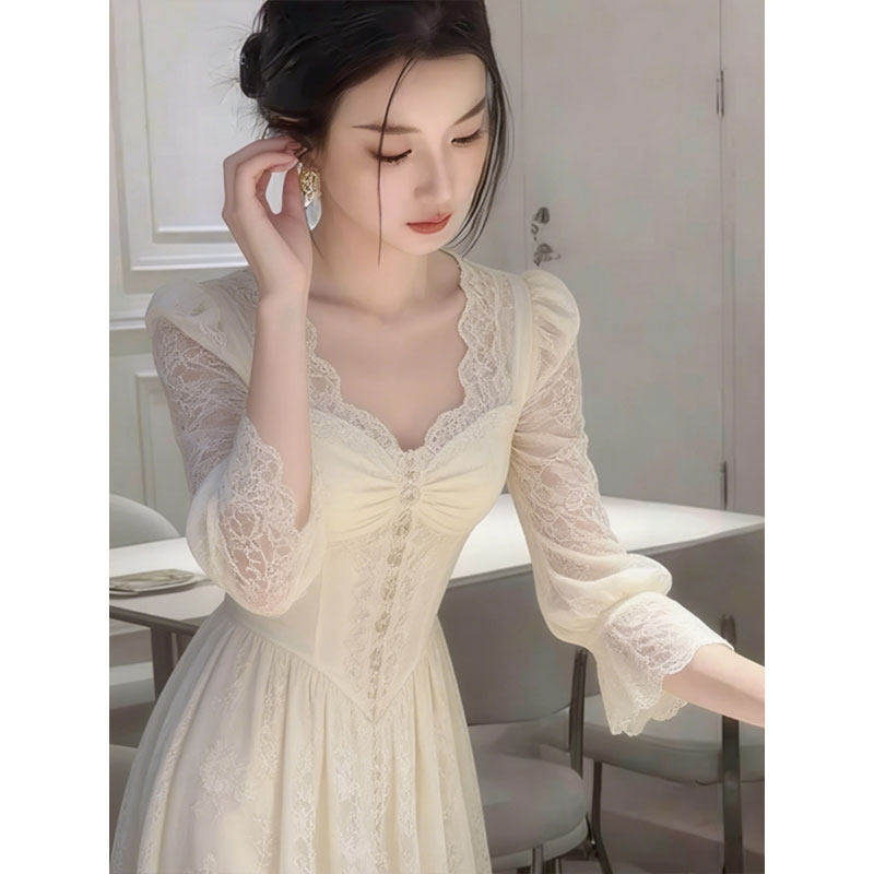 法式温柔风白色蕾丝连衣裙女长袖方领收腰显瘦气质裙优雅名媛风