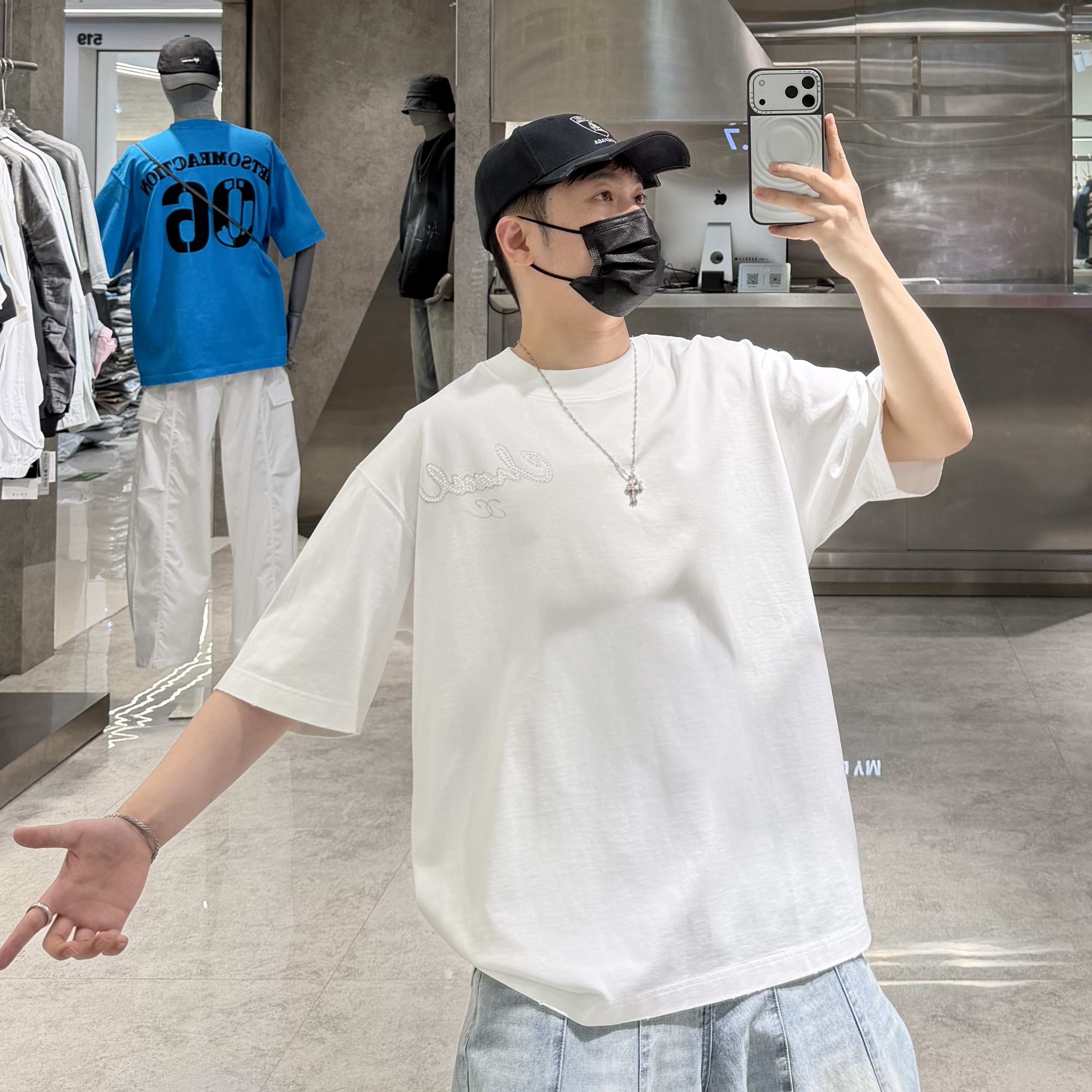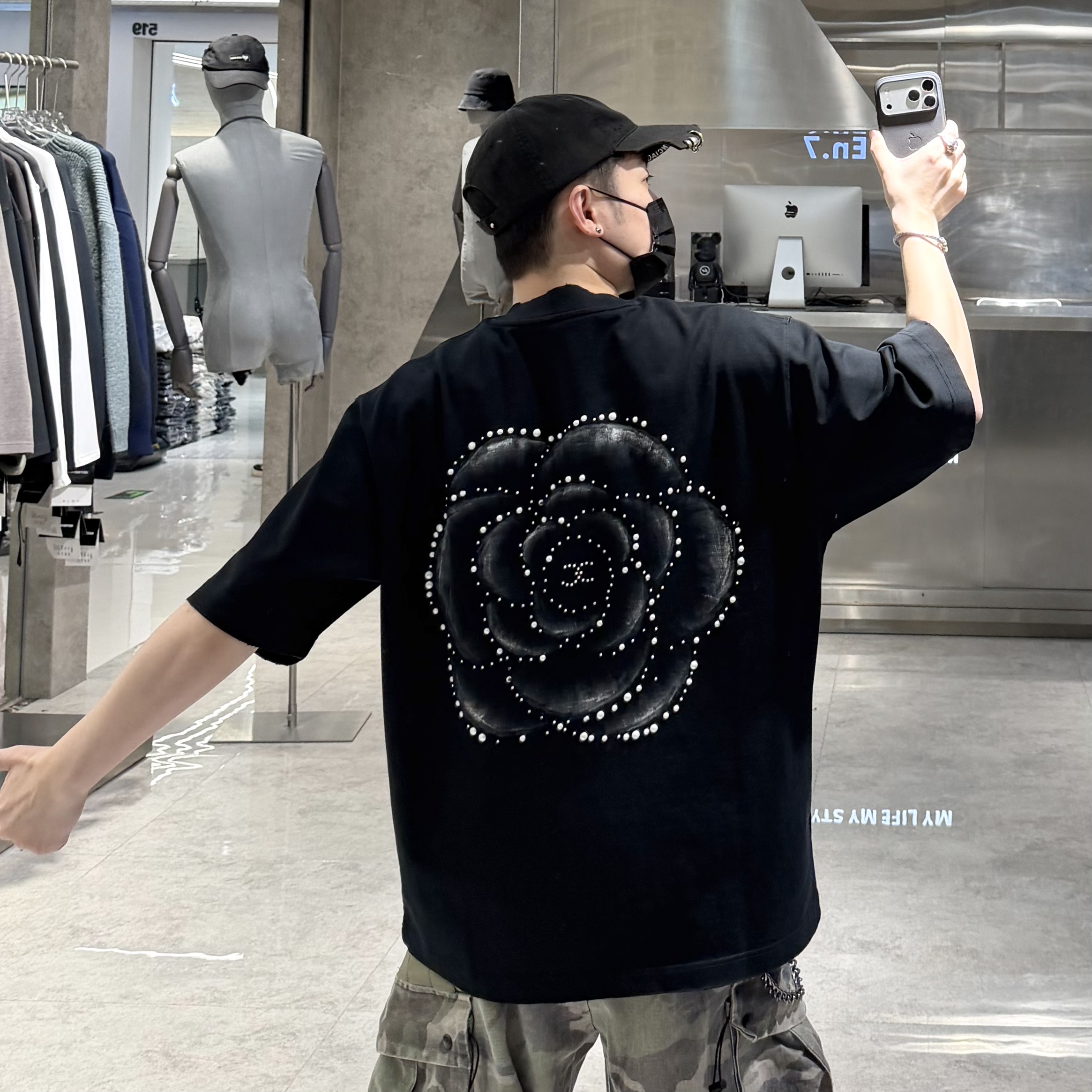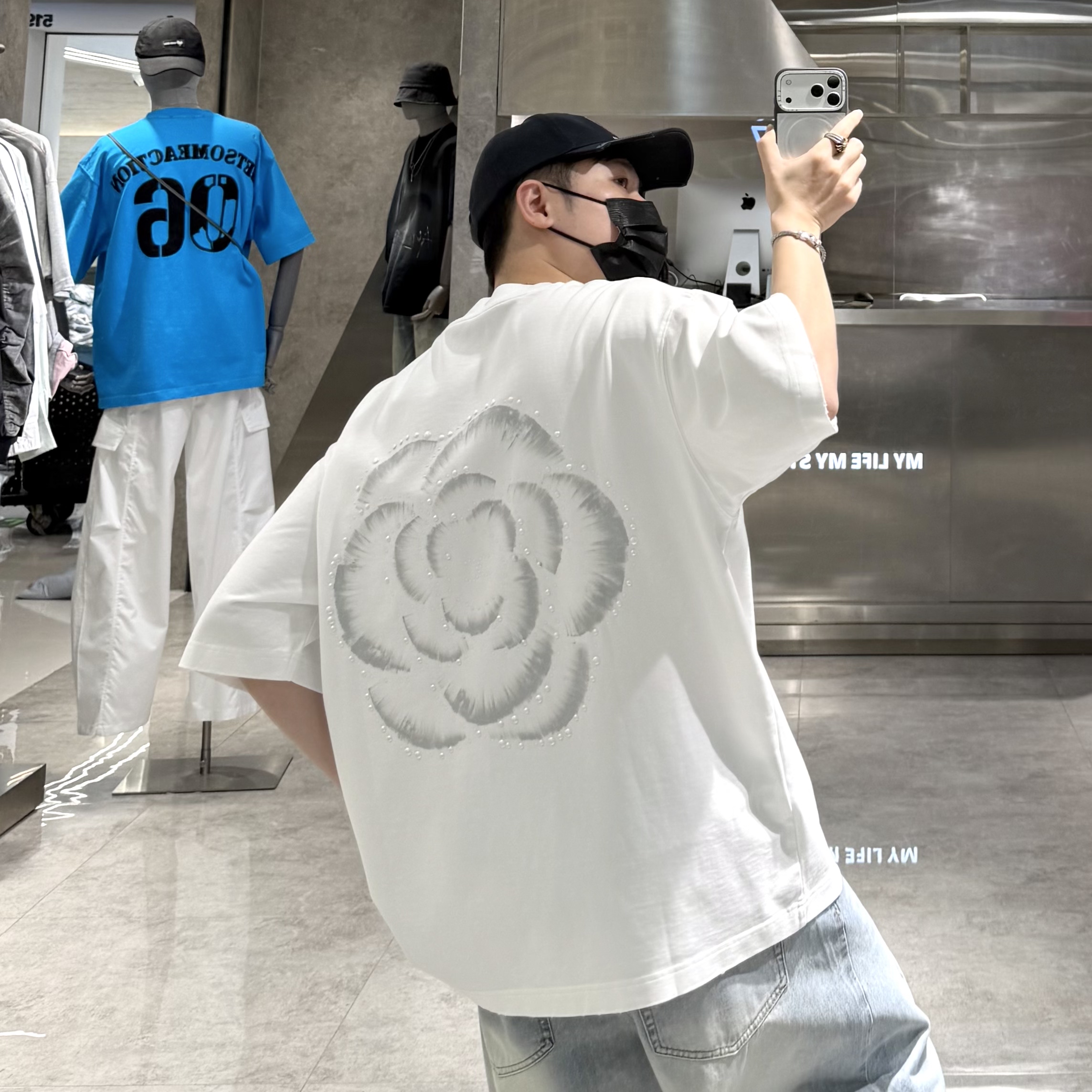 潮牌26春夏重磅短袖T恤男ins国潮手绘山茶花珍珠宽松青年情侣半袖