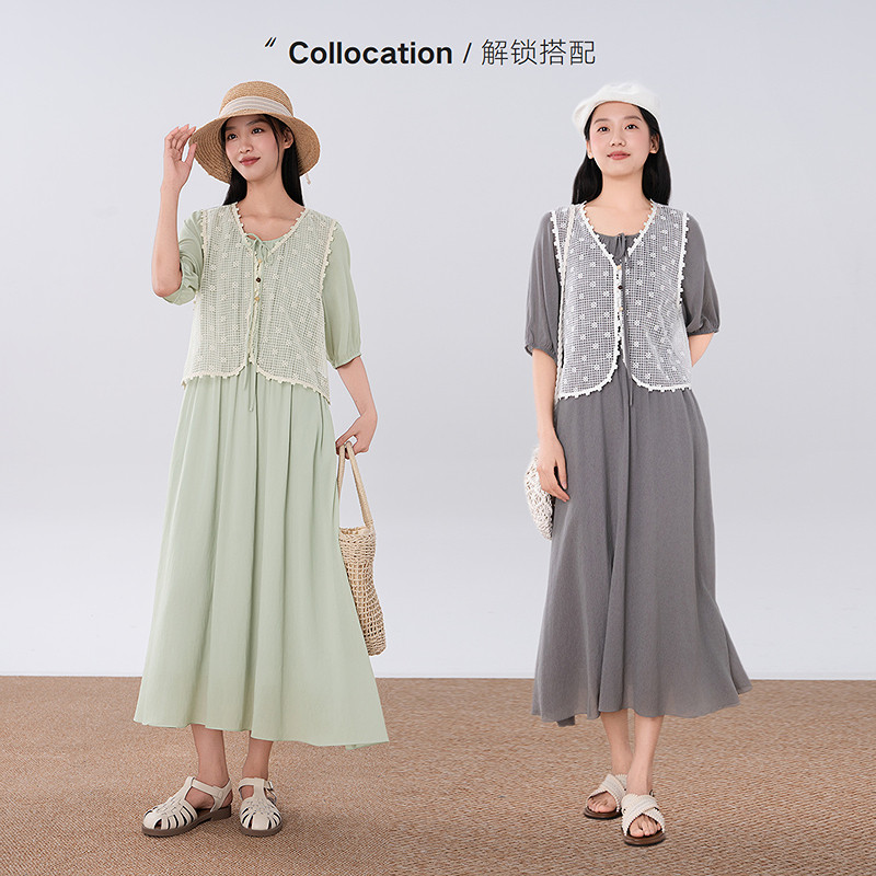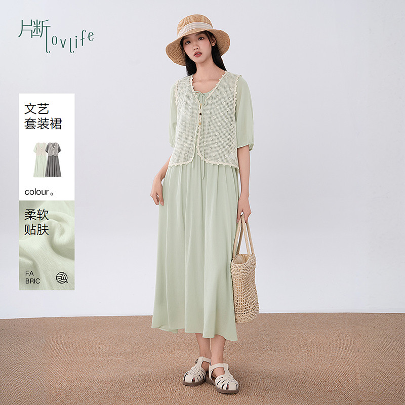 --------------------- 片断套装女夏季新款v领蕾丝马甲宽松简约通勤小个子短袖连衣裙 【原售价】799元 【现售价】399元 【推荐理由】