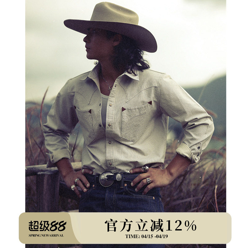 西部系列米白色织按扣条纹衬衣美式复古西部长袖衬衫 MBBCAR窄幅