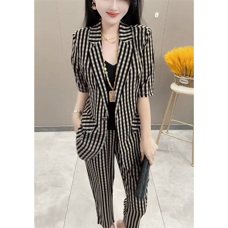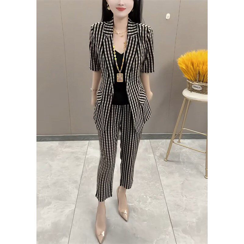2024夏新款时尚气质显瘦套装女短袖格子西服上衣小脚裤休闲两件套