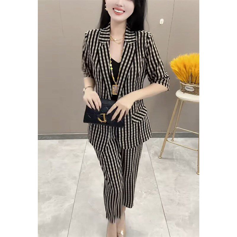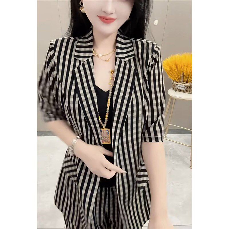 --------------------- 2024夏新款时尚气质显瘦套装女短袖格子西服上衣小脚裤休闲两件套 【原售价】205元 【现售价】205元 【推荐理由】