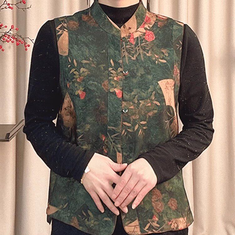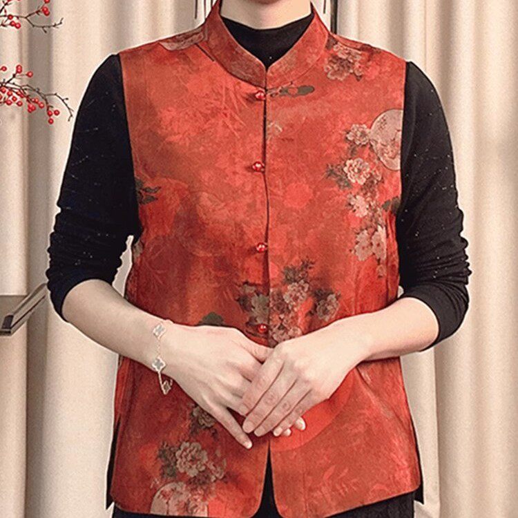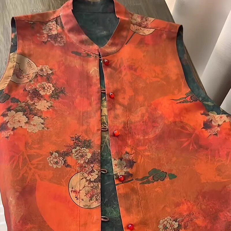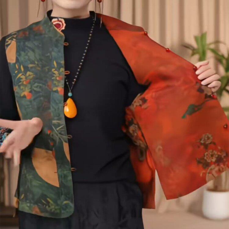 2025年新中式两面穿马甲遮肉百搭Q新款中老年立领大花上衣休闲